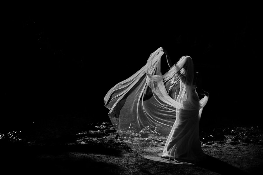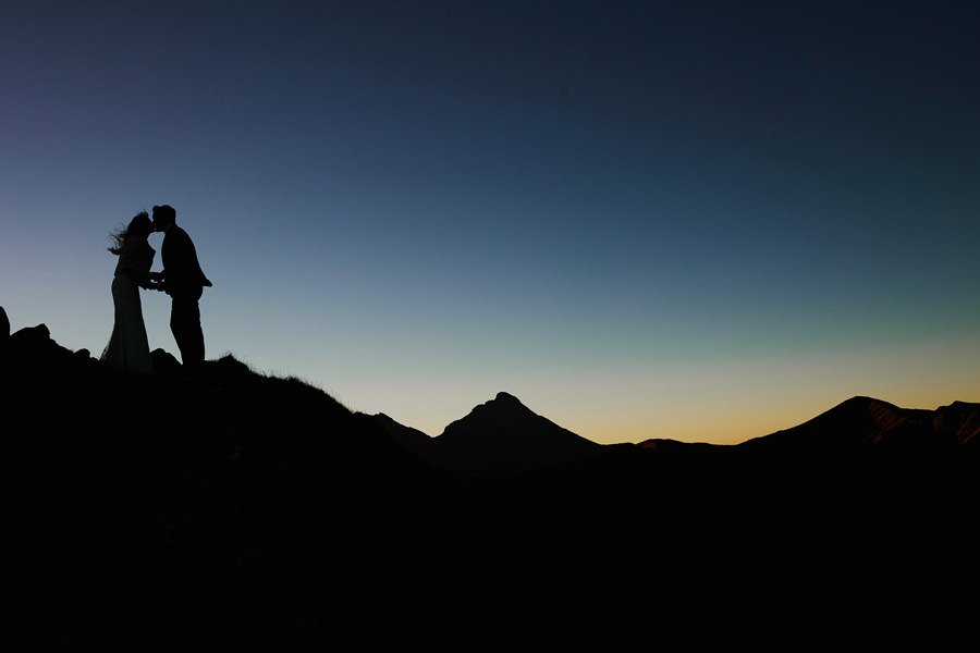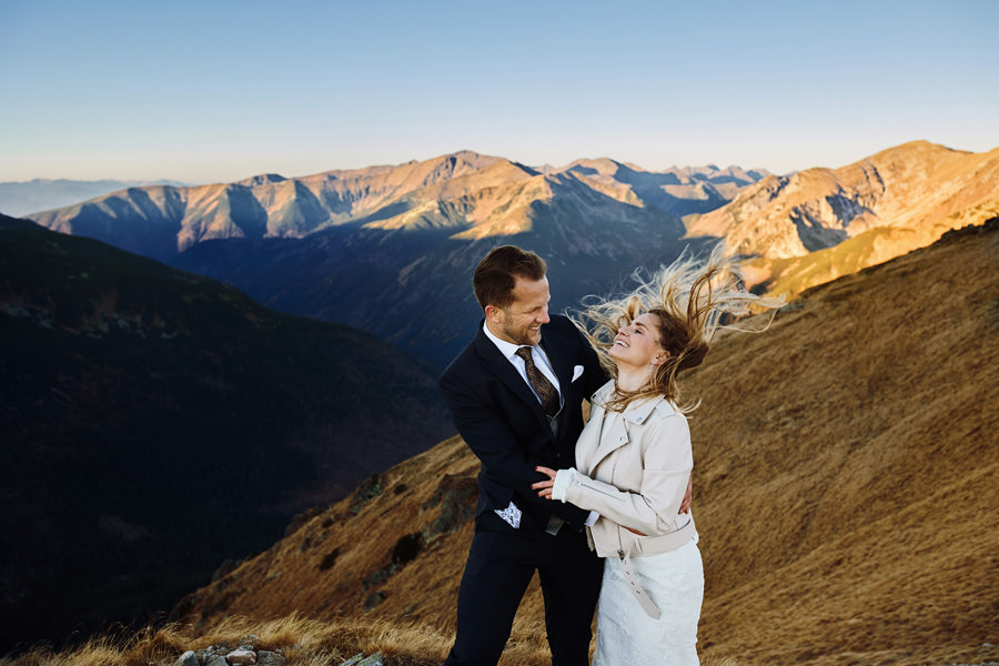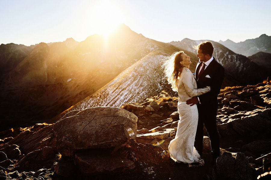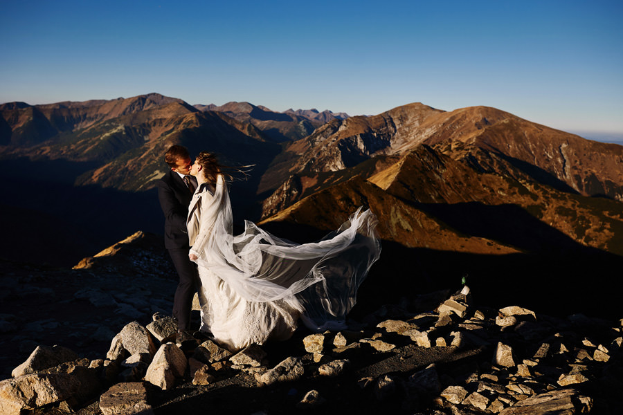 Każde z nas chciało tam po prostu wejść i zrobić sobie te 1000 m przewyższenia dla lepszego samopoczucia i „odbębnionego” treningu :). Suknia ślubna przytroczona do plecaka, garnitur również. Na naszych plecach też sporo sprzętu, a do tego oczywiście termosy, ciepłe ubrania, jedzenie. Bo to jednak nie zwykła krótka sesja, tylko regularna wyprawa w październikowe Tatry :). Ale oczywiście trening z obciążeniem jest przecież jeszcze lepszy, niż bez obciążenia :). Szliśmy z czołówkami przed wschodem słońca głównie dlatego, by uniknąć turystów na szczycie. Turystów nie było, wschodu w zasadzie też nie, bo zasłoniła go Świnica. No cóż :). Ale doświadczenie i tak bezcenne. Drobną przeszkodą był halny, ale kto nie kocha rozwianych włosów na zdjęciach :).