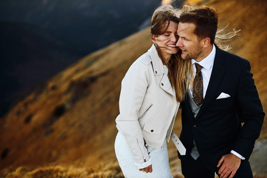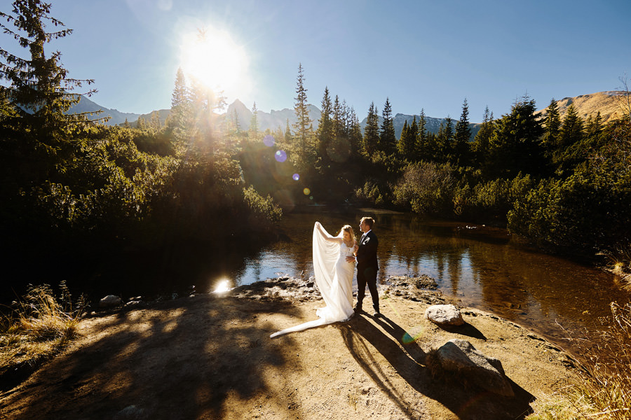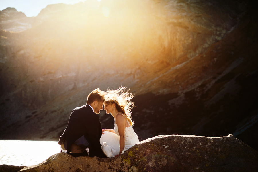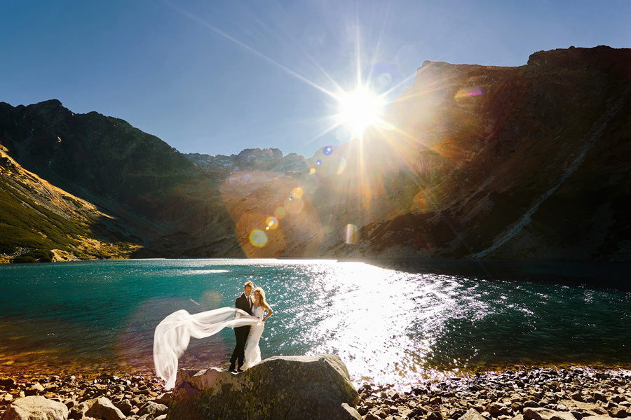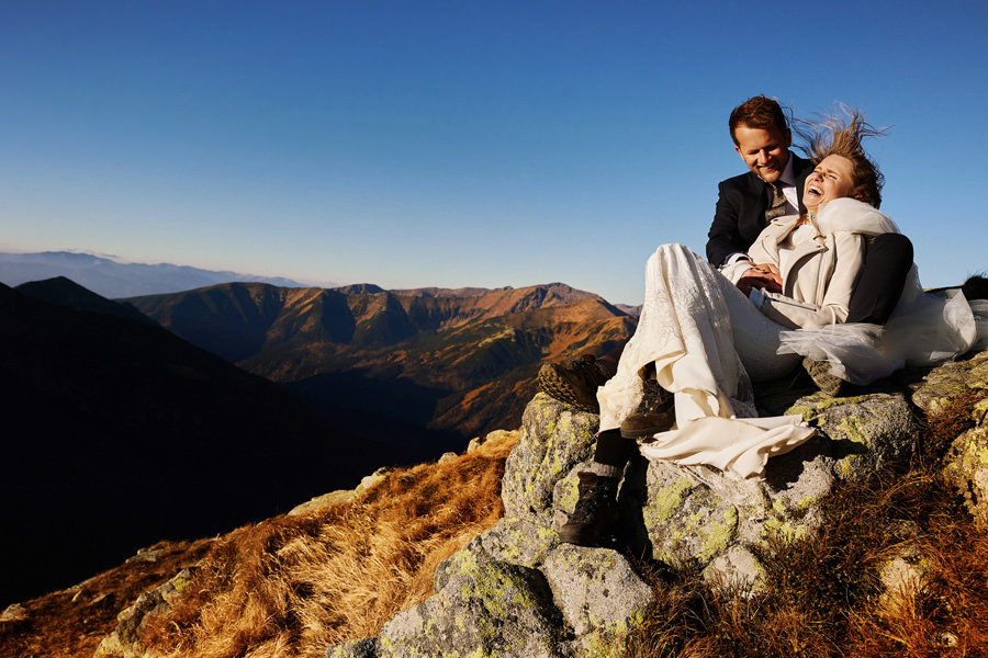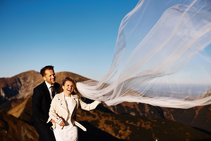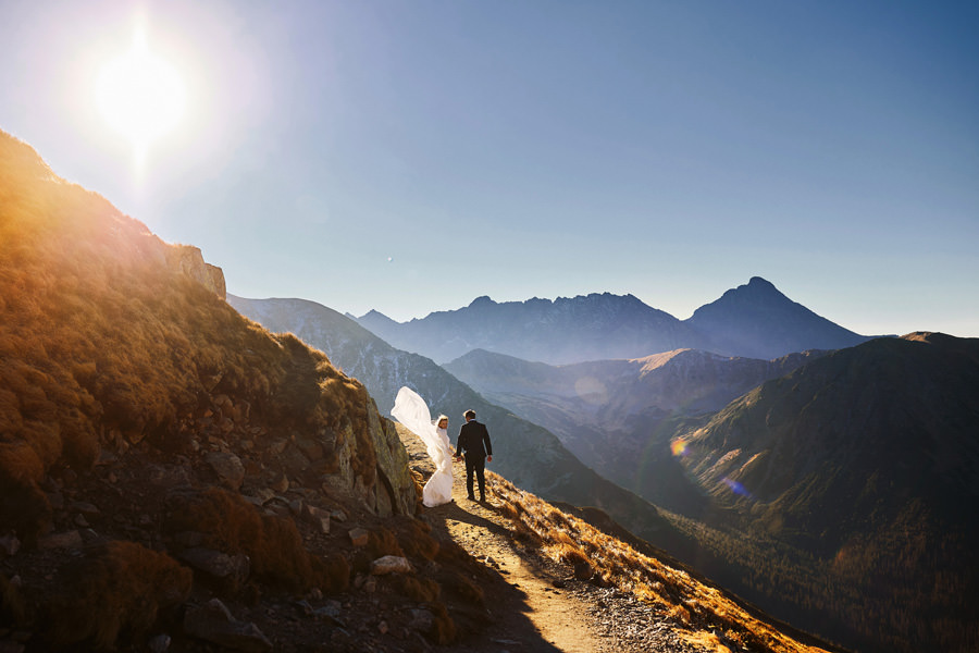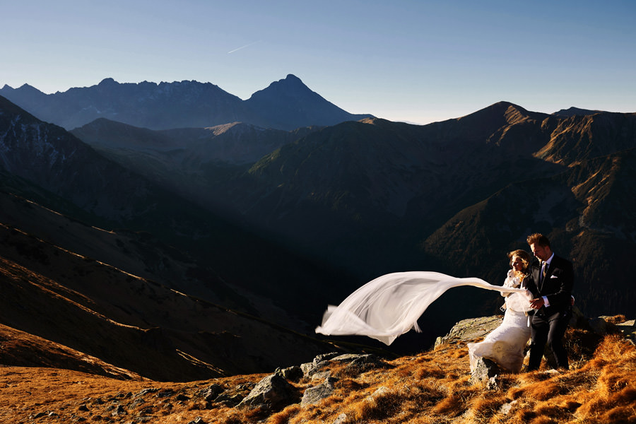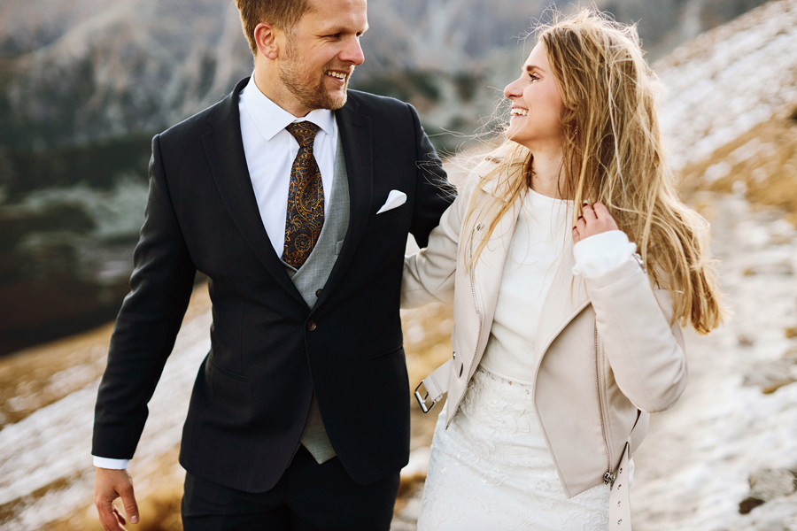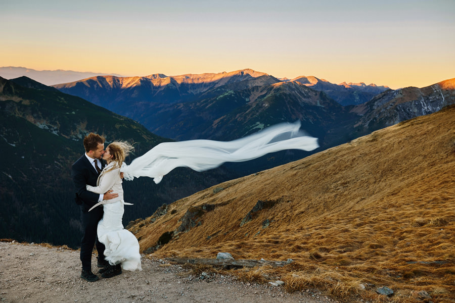 Sesja poślubna może mieć miejsce w dniu ślubu i zawsze dbamy o to, aby ją wykonać. Czas wbrew pozorom nie jest żadnym problemem. Taka sesja nie trwa długo, można podzielić ją na dwie lub trzy sekwencje, przez co chwilowa nieobecność młodej pary jest praktycznie niezauważalna, a zrobione zdjęcia są bezcenną pamiątką. Więcej o sesji w dniu ślubu piszę tutaj i myślę, że warto zajrzeć. Są też jednak pary, które chciałyby jeszcze dodatkową sesję, w dniu innym niż ślub, bo bardzo im zależy na konkretnym miejscu, okolicznościach, albo po prostu dziewczyny dążą do tego, by mieć jeszcze jedną okazję do założenia sukni ślubnej (co mnie kompletnie nie dziwi). Czy na taką sesję trzeba mieć pomysł? Wybrane wcześniej miejsce? Jak to się wszystko odbywa? A może niech to będzie sesja ślubna w Tatrach 🙂