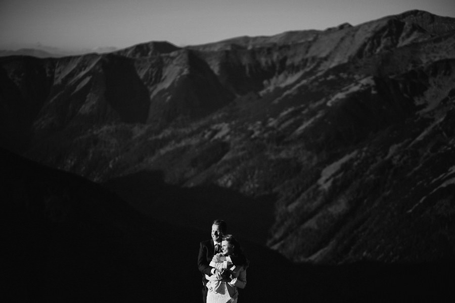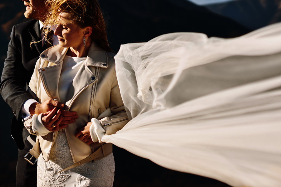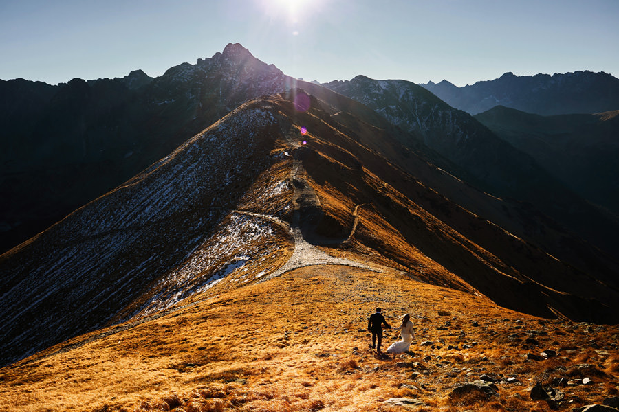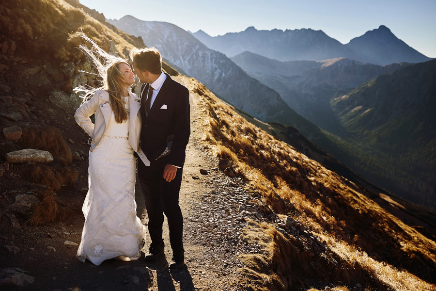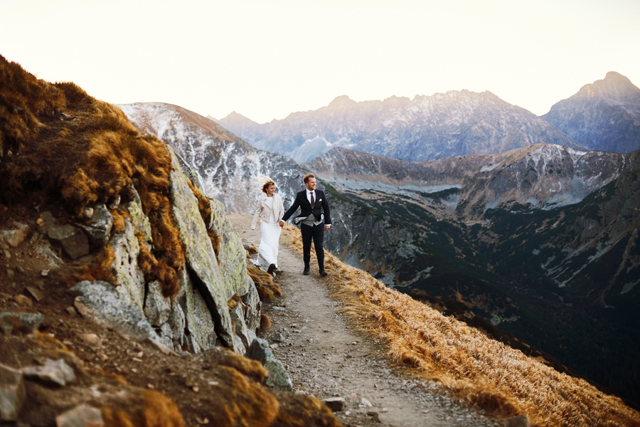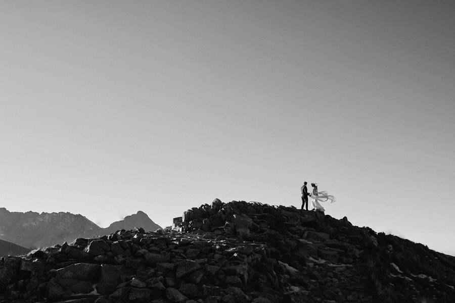 Niewiele jest par, które mają na to wszystko określony pomysł. Większość jednak zdaje się na nasze sugestie, co bardzo lubimy i doceniamy dawaną nam wolność. Niemniej jednak ważne jest, by sesja była w jakiś sposób spójna z zainteresowaniami pary. Z ich estetyką, dynamiką ich relacji, sposobem bycia i tak dalej. Ten wpis jest o dwójce pasjonatów gór, którzy zdecydowali się na sesję ślubną w Tatrach, a dokładniej na Kasprowym Wierchu. Powiecie może, że to żaden wyczyn, bo przecież na Kasprowy można wjechać kolejką. Można. Ale wtedy po pierwsze nie było można, bo kolejka była w remoncie, a po drugie w ogóle nie było takiej potrzeby.