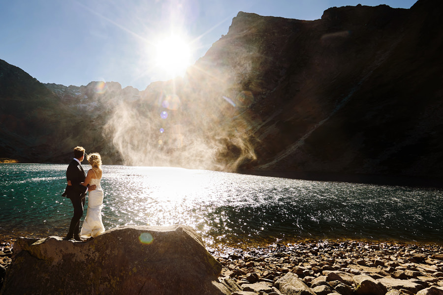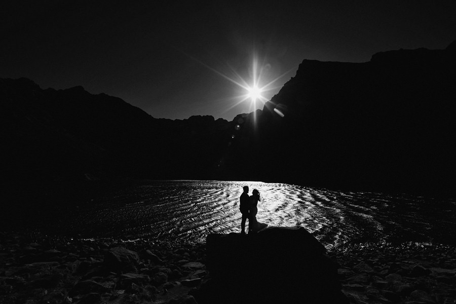 Widok z Kasprowego Wierchu jest spektakularny i miejsce to ma ogromny potencjał. Ale jeśli ktoś nie boi się pieszych wycieczek, można zejść do Czarnego Stawu Gąsienicowego. Sesja zyskuje na różnorodności, a zegarki sportowe cieszą się z przebytego dystansu. Dodatkowo może zdarzyć się coś niecodziennego, jak trąby powietrzne na stawie, które w promieniach słońca zamieniały się w kryształowe bryzy. Niby halny trochę nam wszystkim przeszkadzał, z drugiej strony przyczynił się do powstania na koniec naprawdę efektownych zdjęć. Zresztą – zobaczcie sami!