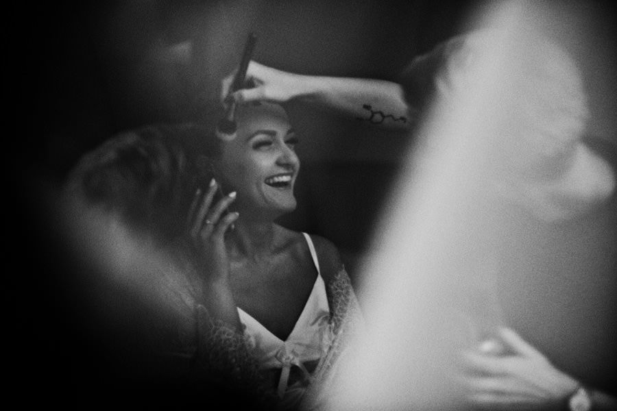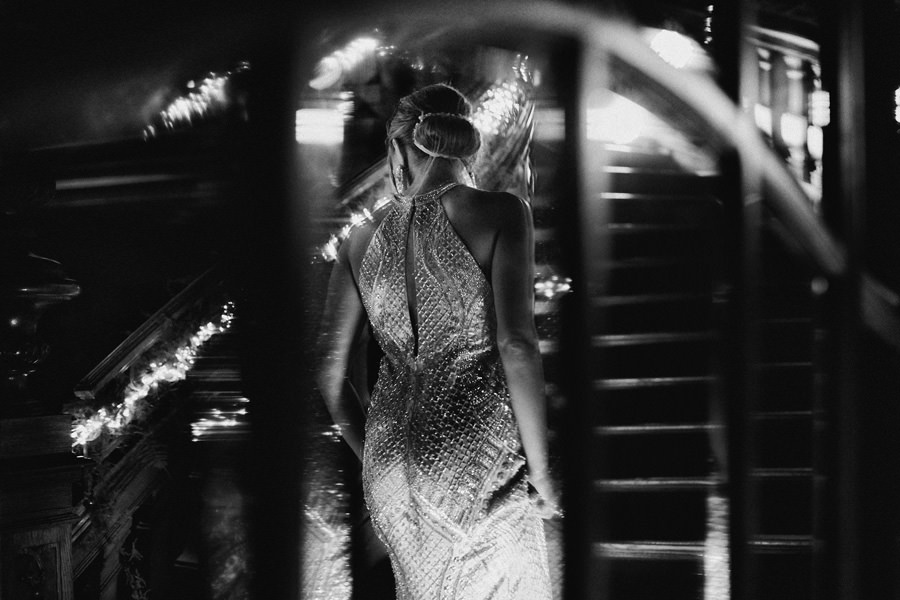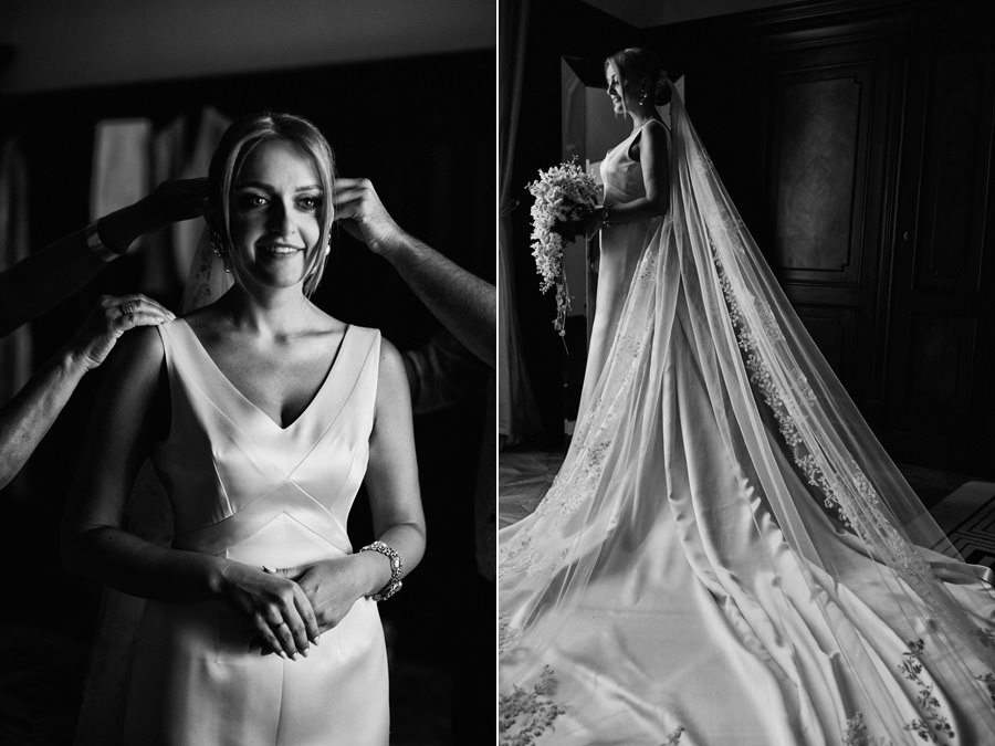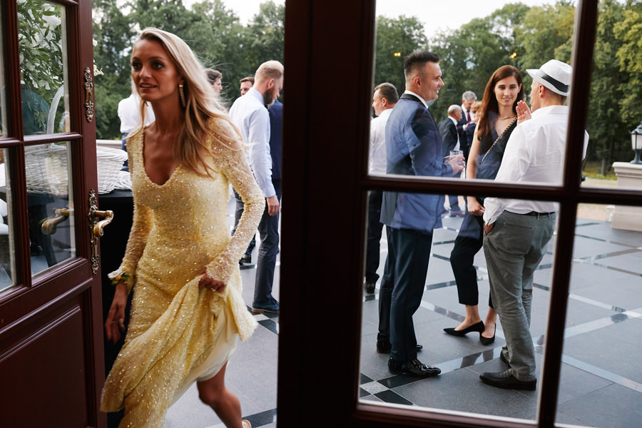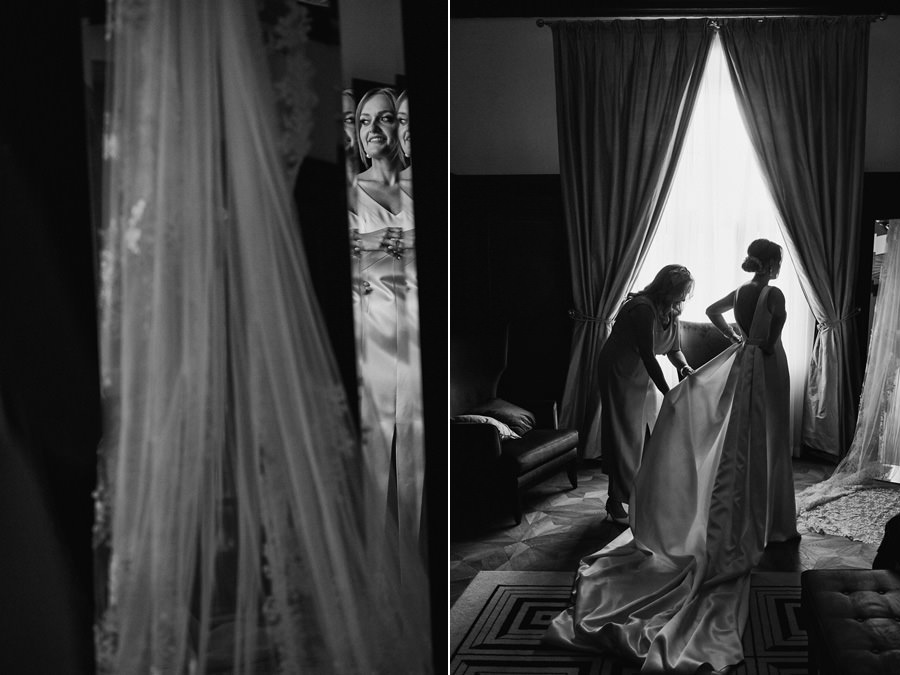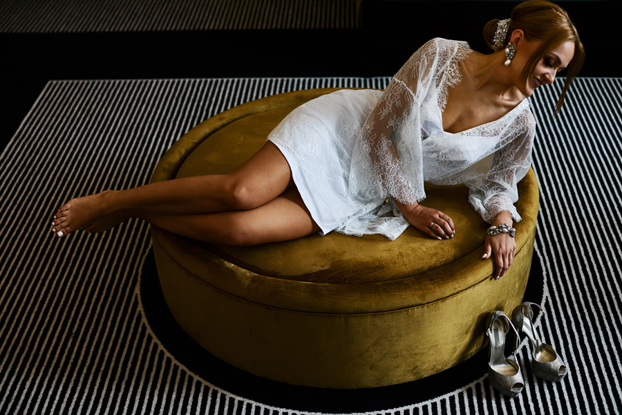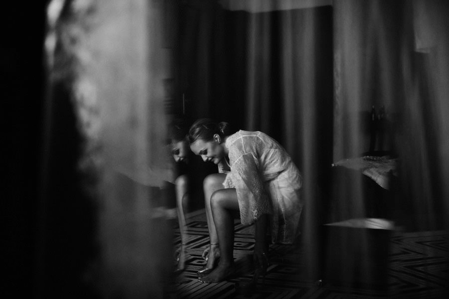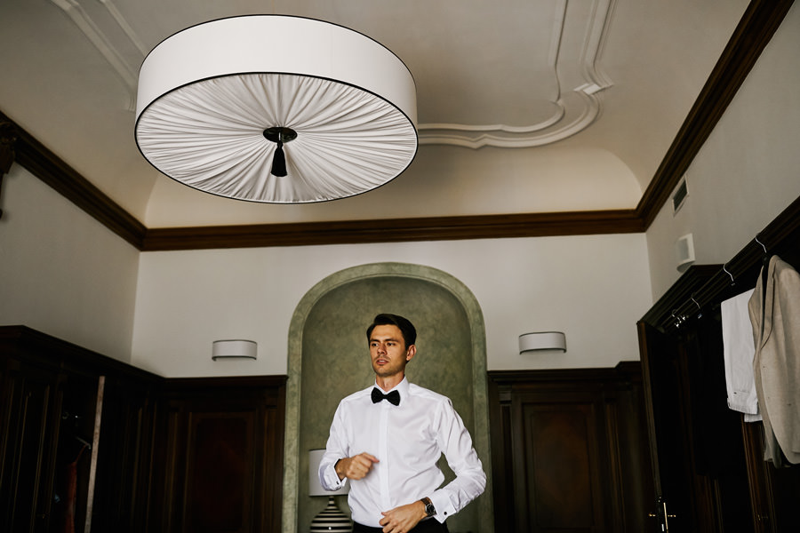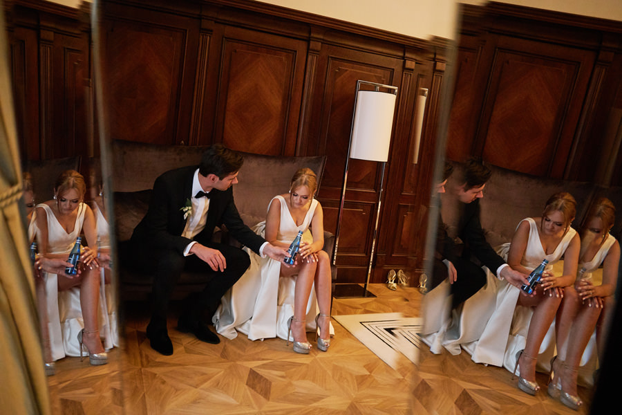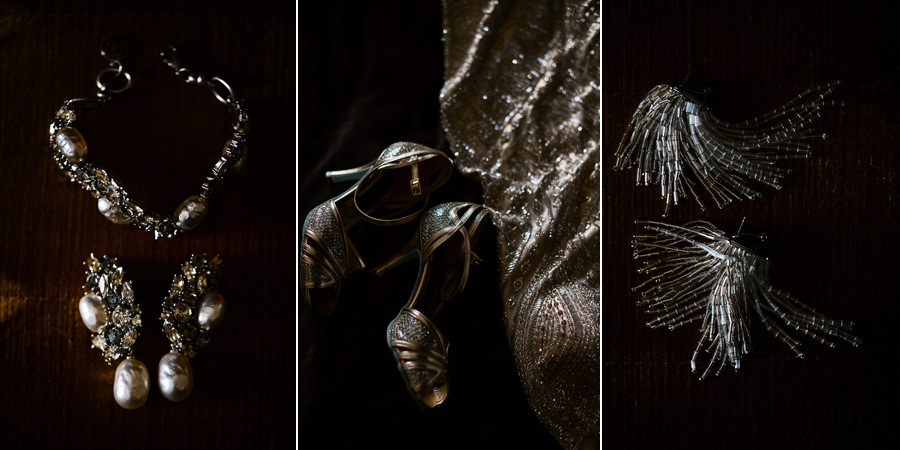 Przygotowania do ślubu odbywały się w pałacowych komnatach. Dość ciemne wnętrza, skąpe, ale pięknie modelujące światło zastane – dało klimat jak z obrazów Caravaggia. Ostry światłocień – prawdziwie barokowy styl, więc nawet zdjęcia są jak obrazy. Do tego niezwykłe detale. Na każdy moment dnia inne. Były dwie suknie ślubne, a jedna z nich, wyszywana kryształami, powstawała 360 godzin (to dopiero „slow wedding” DRESS, nie?) i ważyła kilkanaście kilogramów. Ale warto było ponieść ten ciężar, dlatego że wszystkim odebrało mowę. Dosłownie. Było sporo par butów, bo tego przecież nigdy za wiele. Więc było tam „coś nowego”.