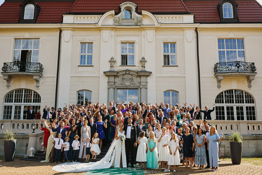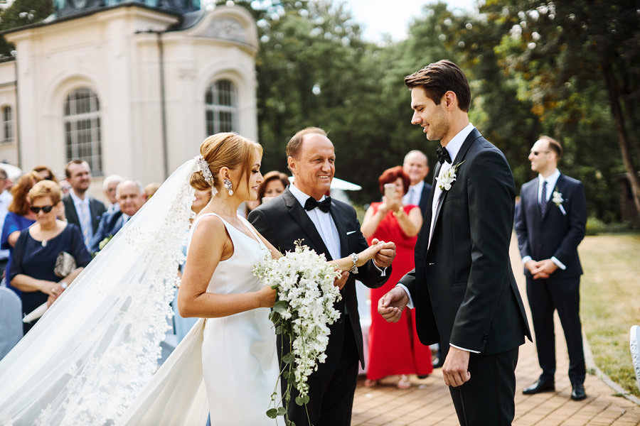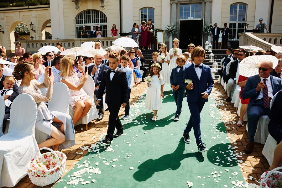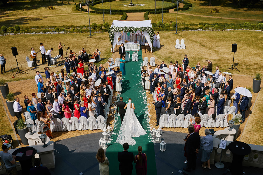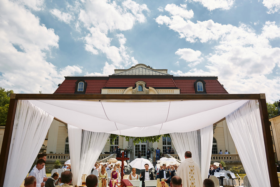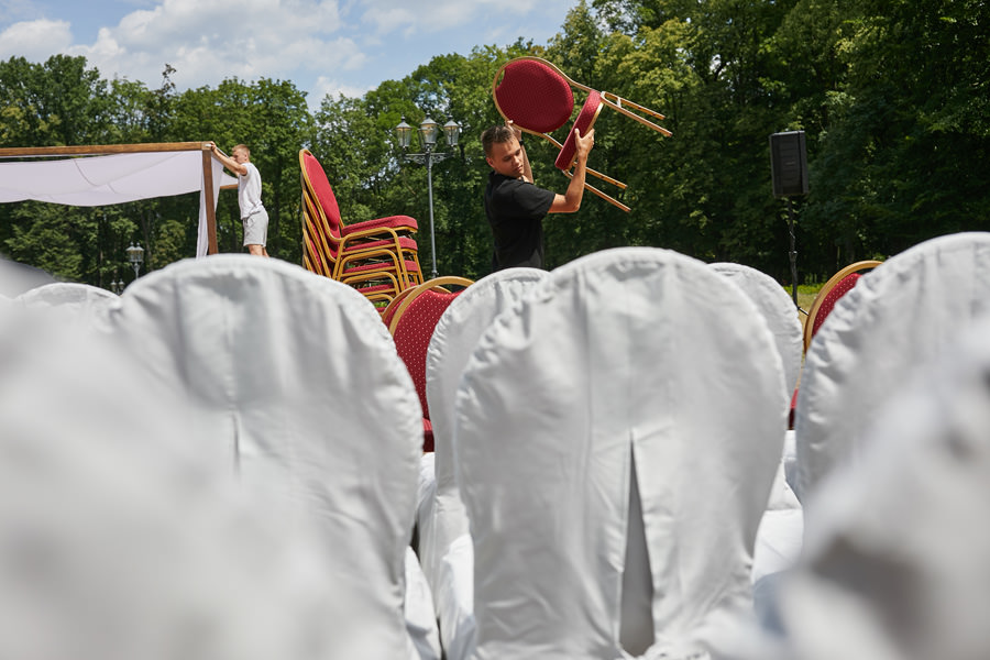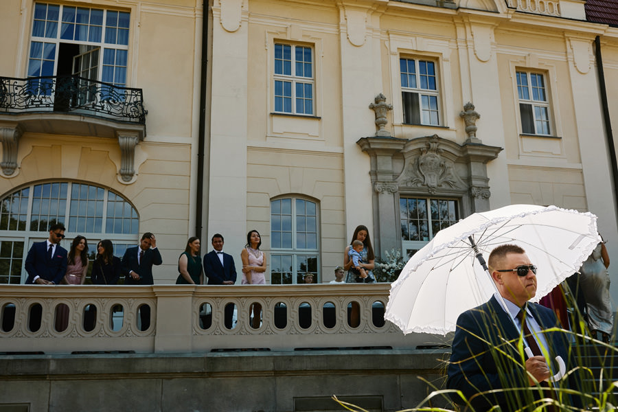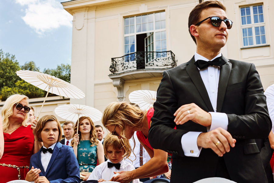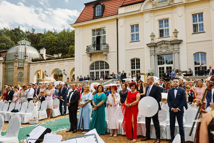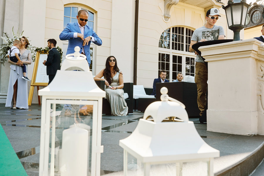 Wielki dzień Ali i Jacka był tak pomyślany, aby wszystko działo się w jednym miejscu. Chodziło o to, by było to slow wedding. Nie było więc szalonego pędu, aby zdążyć do wizażystek i fryzjerów. Wręcz przeciwnie – to oni zostali zaproszeni do pałacu. Dzięki temu nie było zamieszania, a wszystkie panie mogły się w spokoju napić szampana. Tymczasem w pałacowym parku trwały już przygotowania, gdyż do ceremonia ślubna odbywała się w plenerze. Goście powoli przybywali na miejsce. Każdy element tego dnia był zgodny z wizją młodej pary, dlatego wszystko idealnie do siebie pasowało. Użyłam sformułowania 'slow wedding’, bo faktycznie wszystko było w tym nurcie. Niespiesznie. Z dbałością o każdy detal. Niemniej jednak samo wesele wcale nie było slow. I przede wszystkim było to wesele wcale niemałe, o nie! Zdecydowanie dwóch fotografów miało co robić i to przez cały czas.