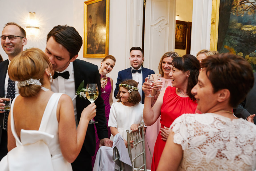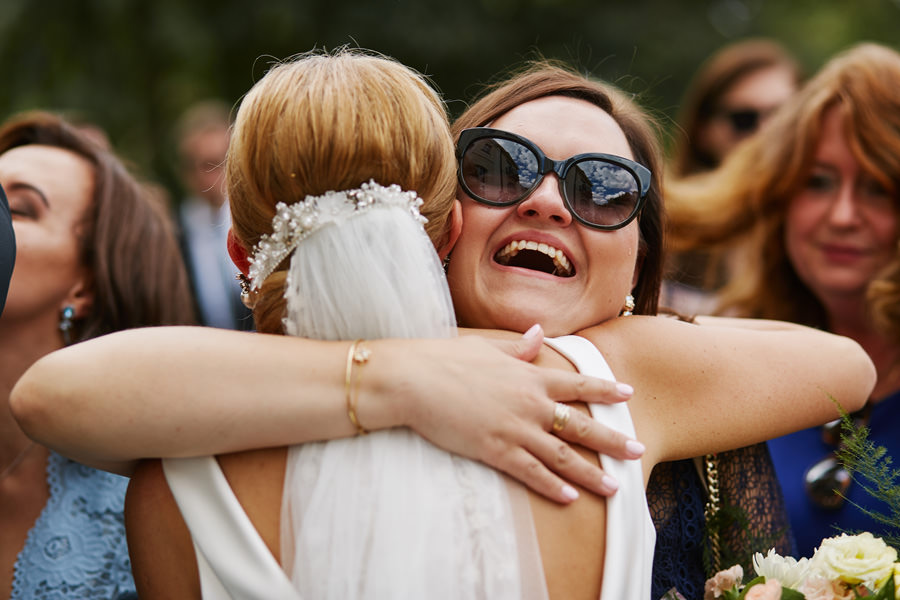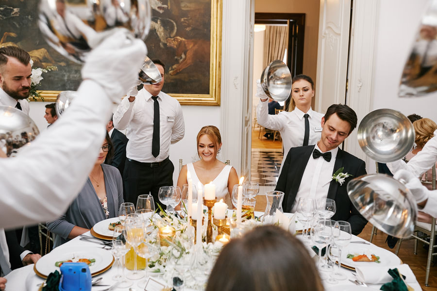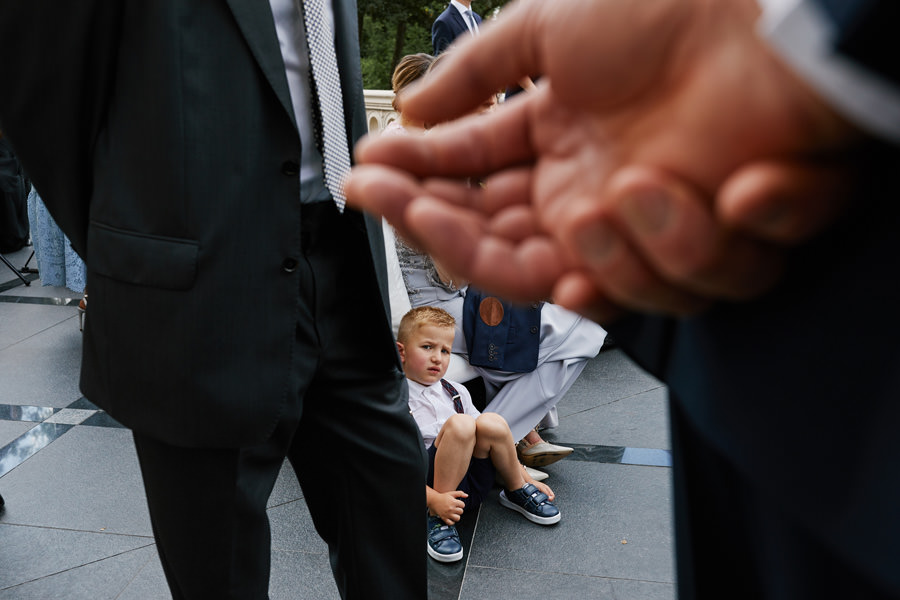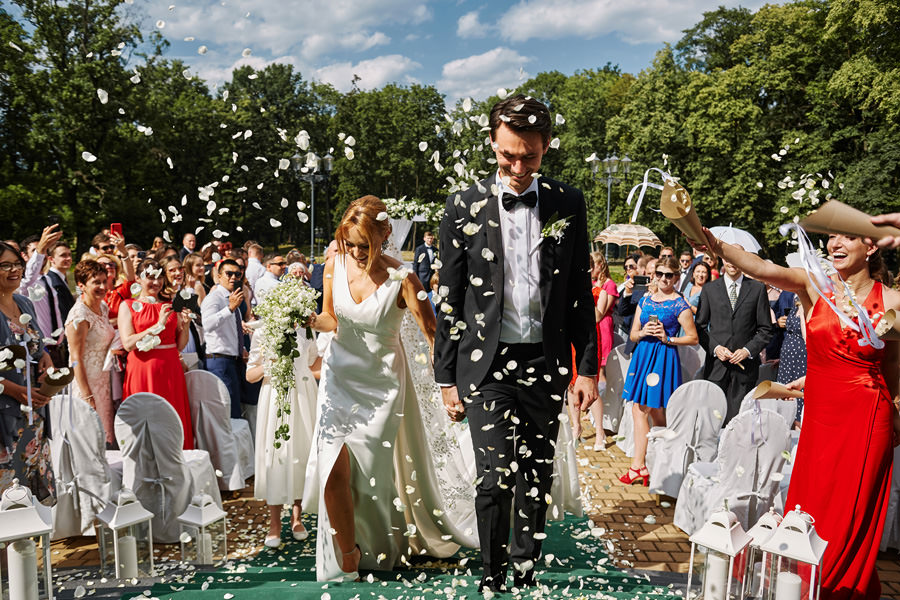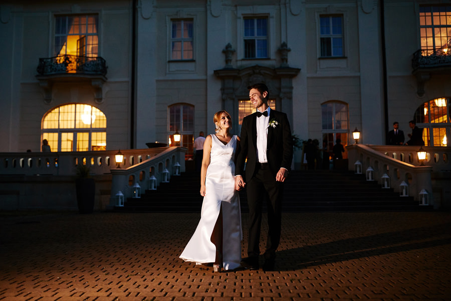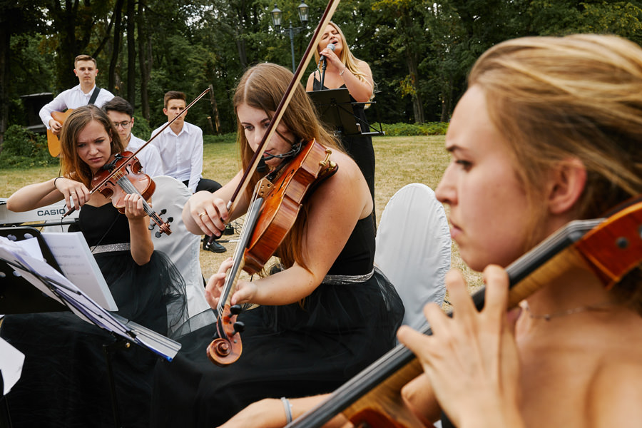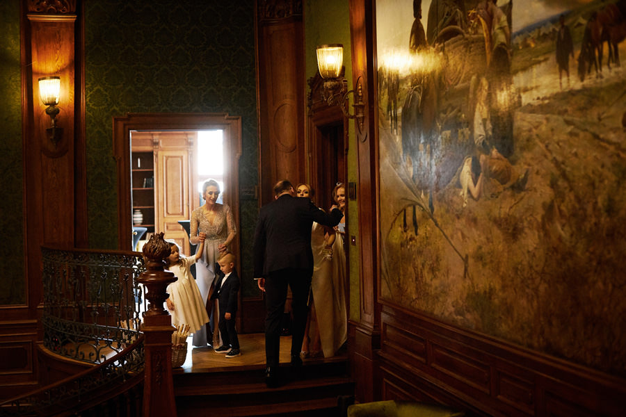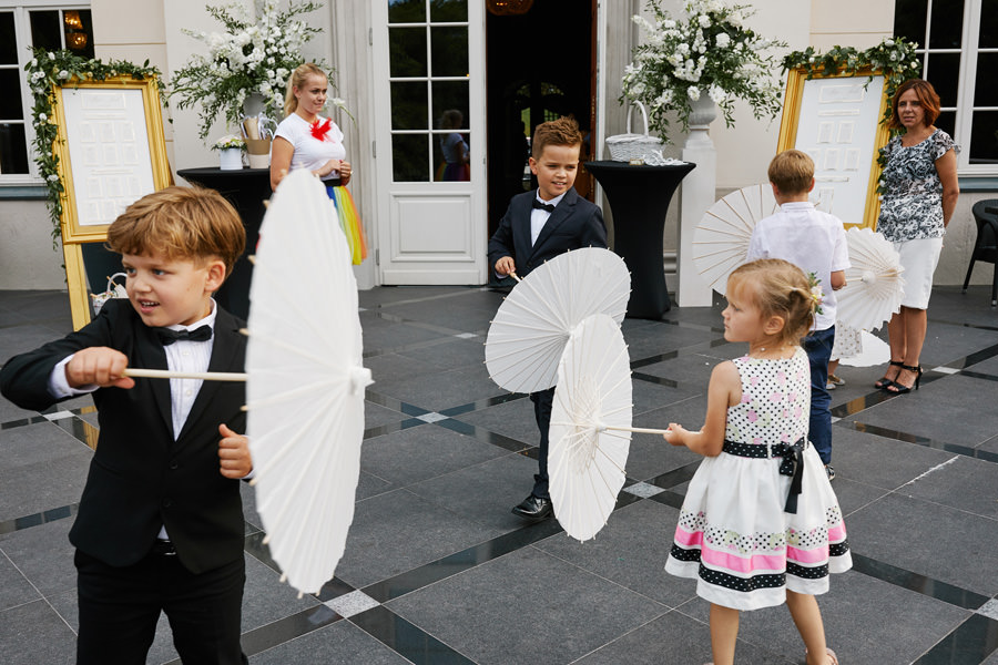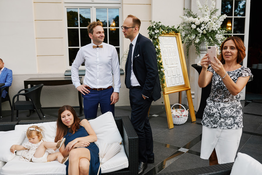 Wielki dzień Ali i Jacka był tak pomyślany, aby wszystko działo się w jednym miejscu. Chodziło o to, by było to slow wedding. Nie było więc szalonego pędu, aby zdążyć do wizażystek i fryzjerów. Wręcz przeciwnie – to oni zostali zaproszeni do pałacu. Dzięki temu nie było zamieszania, a wszystkie panie mogły się w spokoju napić szampana. Tymczasem w pałacowym parku trwały już przygotowania, gdyż do ceremonia ślubna odbywała się w plenerze. Goście powoli przybywali na miejsce. Każdy element tego dnia był zgodny z wizją młodej pary, dlatego wszystko idealnie do siebie pasowało. Użyłam sformułowania 'slow wedding’, bo faktycznie wszystko było w tym nurcie. Niespiesznie. Z dbałością o każdy detal. Niemniej jednak samo wesele wcale nie było slow. I przede wszystkim było to wesele wcale niemałe, o nie! Zdecydowanie dwóch fotografów miało co robić i to przez cały czas.