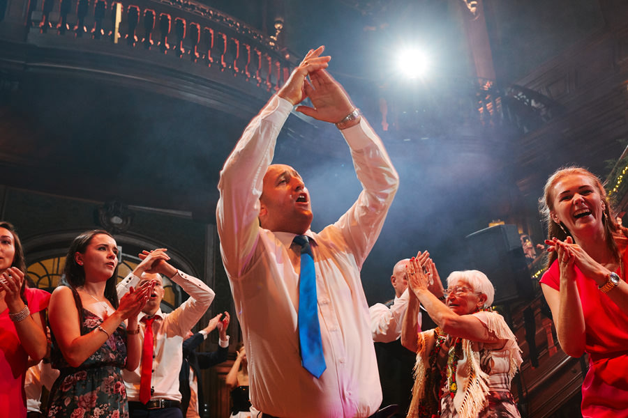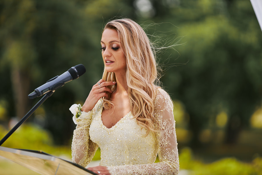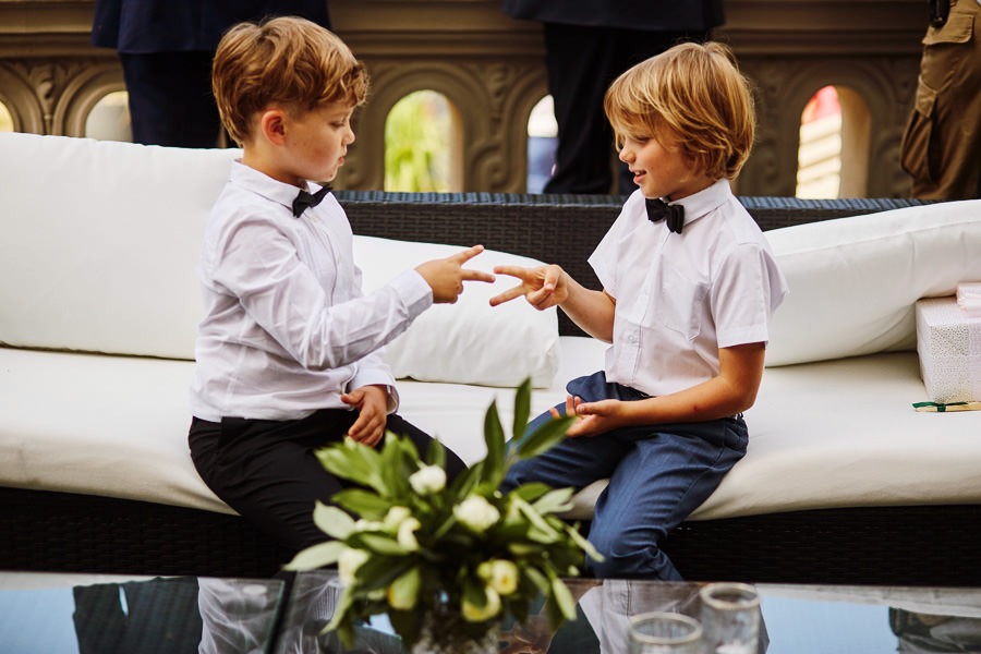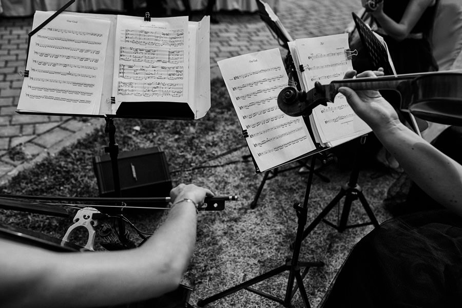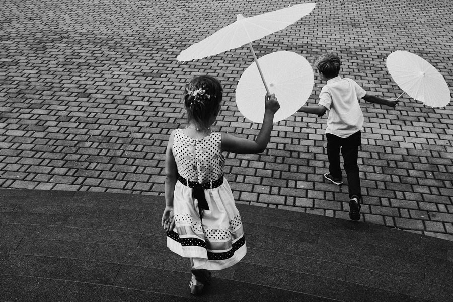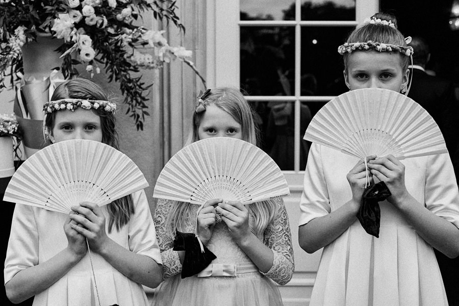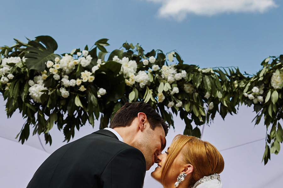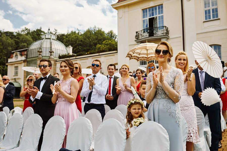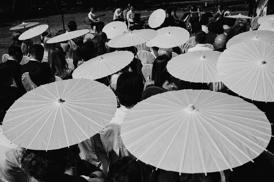 Przysięgam, nawet milion stopni Celsjusza, bo taka była wówczas odczuwalna temperatura, nie przeszkodziło nikomu pięknie przeżyć tę ceremonię. Do tego te cokolwiek ciężkie warunki pogodowe dały nam jakże piękny leitmotiv – czyli białe parasolki i wachlarze, w które wyposażeni zostali goście. Po pięknej ceremonii zaczęło się to, na co wszyscy czekali – czyli prawdziwie ogniste wesele.