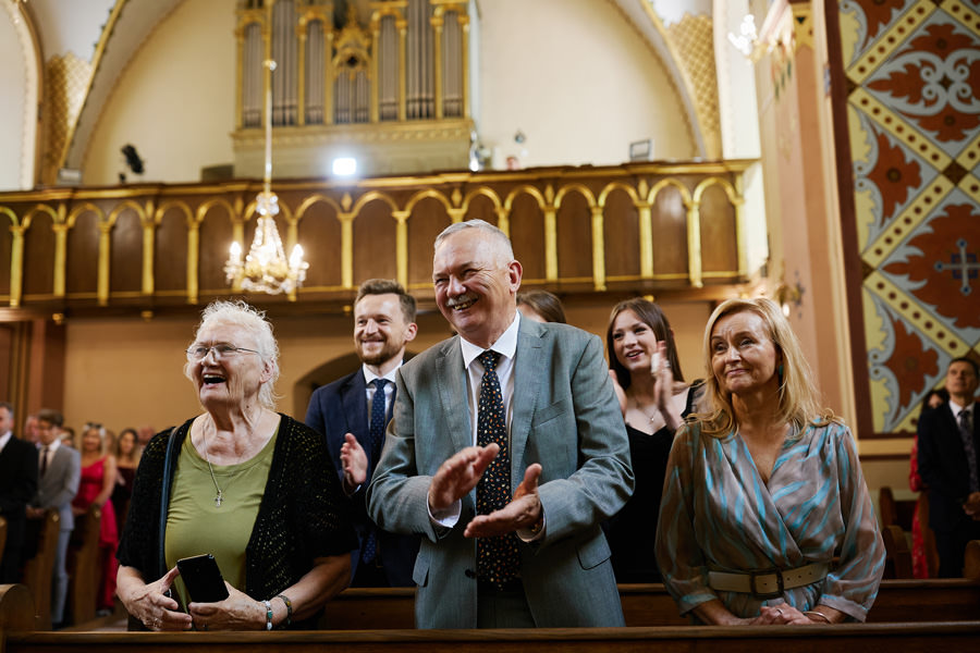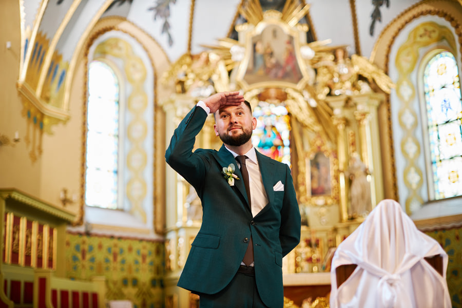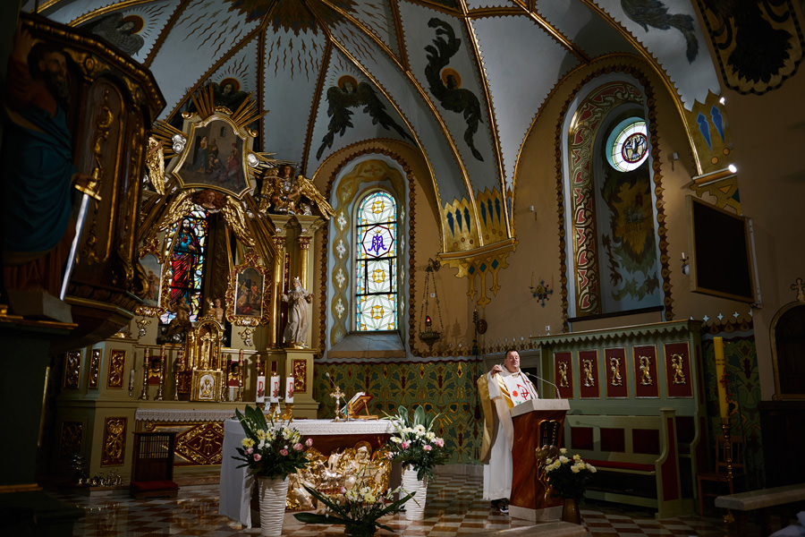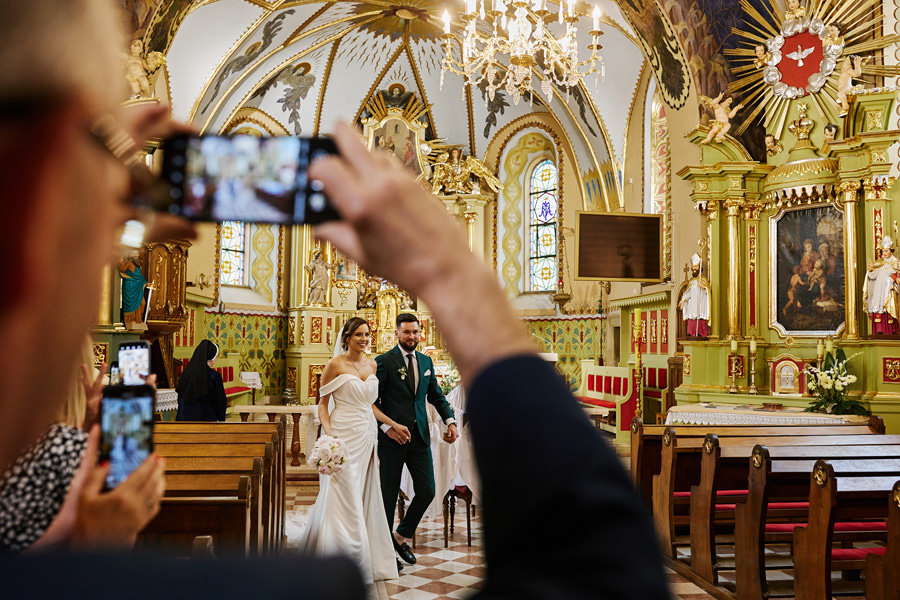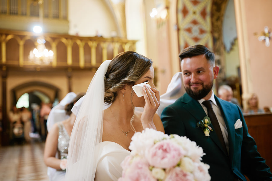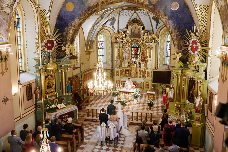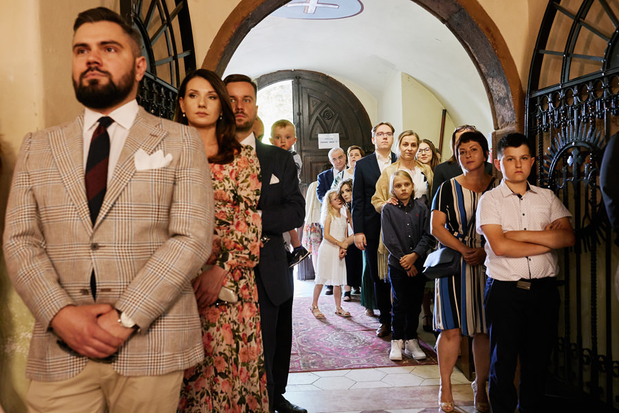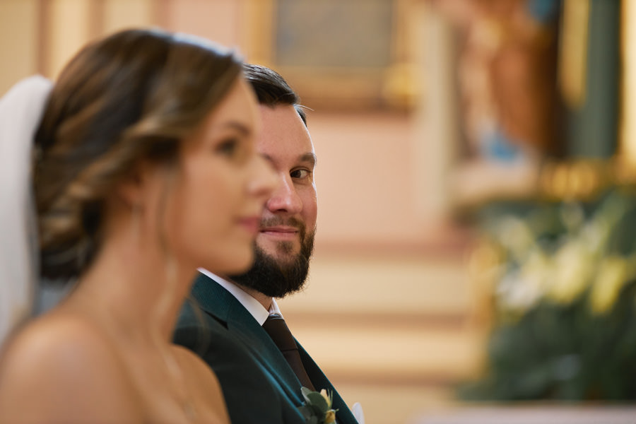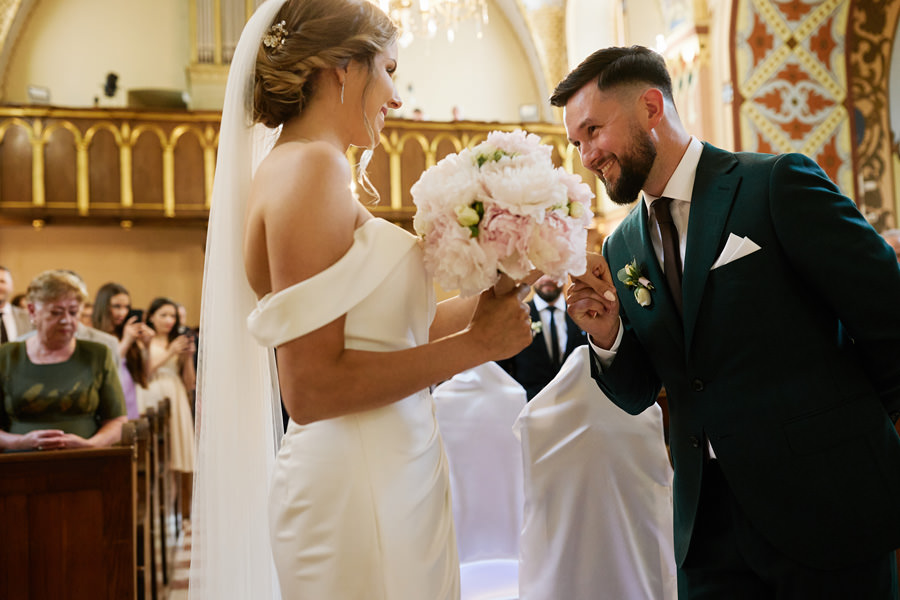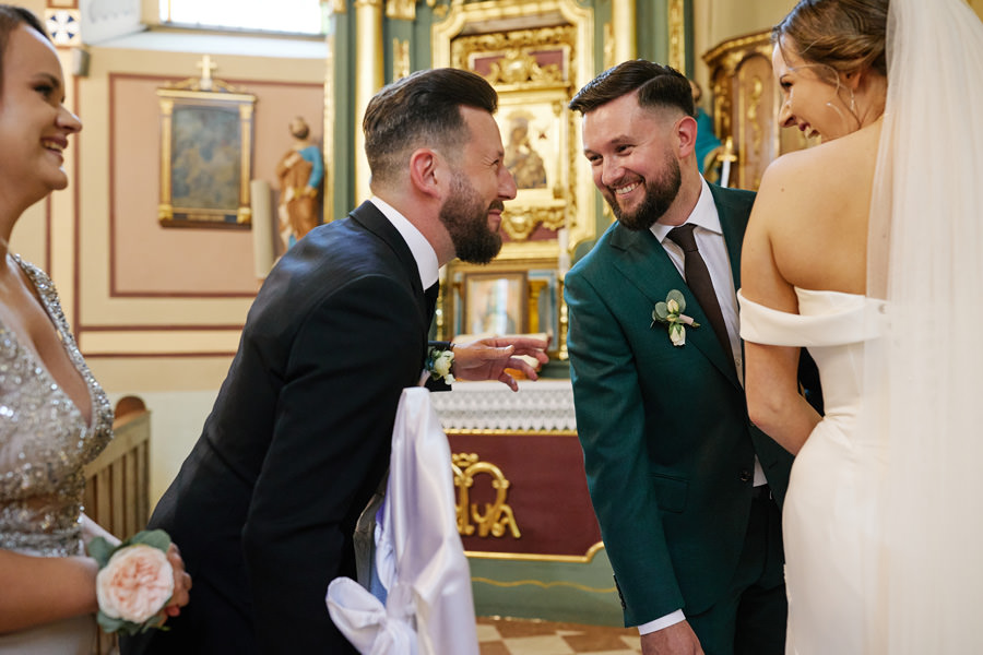 Kasia i Karol pobrali się w kościele, w atmosferze wsparcia i bliskości rodziny i przyjaciół. Ksiądz był niezwykle przychylny, ale na wszelki wypadek mamy opracowaną technikę fotografowania ceremonii kościelnych w taki sposób, by jak najmniej rzucać się w oczy. Szczególnie jest to istotne w małych kościołach, jak ten. Pracujemy we dwoje, więc tym bardziej istotne jest to, by nie wprowadzać zamieszania. Dlatego dzielimy się zadaniami. Moim zadaniem jest bycie blisko pary młodej, polowanie na każde spojrzenie i emocję, jaka się między nimi pojawi. Zadaniem mojego męża jest pokazanie szerszego kontekstu. Teraz być może łatwiej będzie wytropić w tym wpisie, które zdjęcia z ceremonii są czyje. Choć jak sama oglądam te zdjęcia, to może to jednak wcale nie aż tak oczywiste ;).
