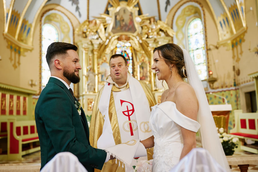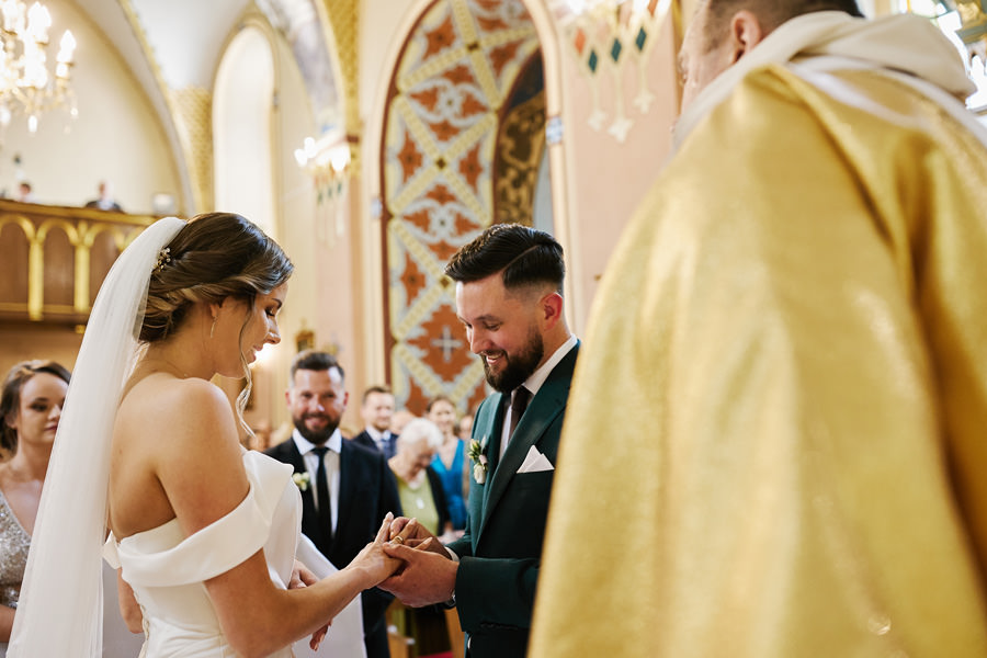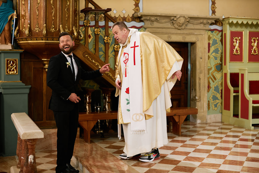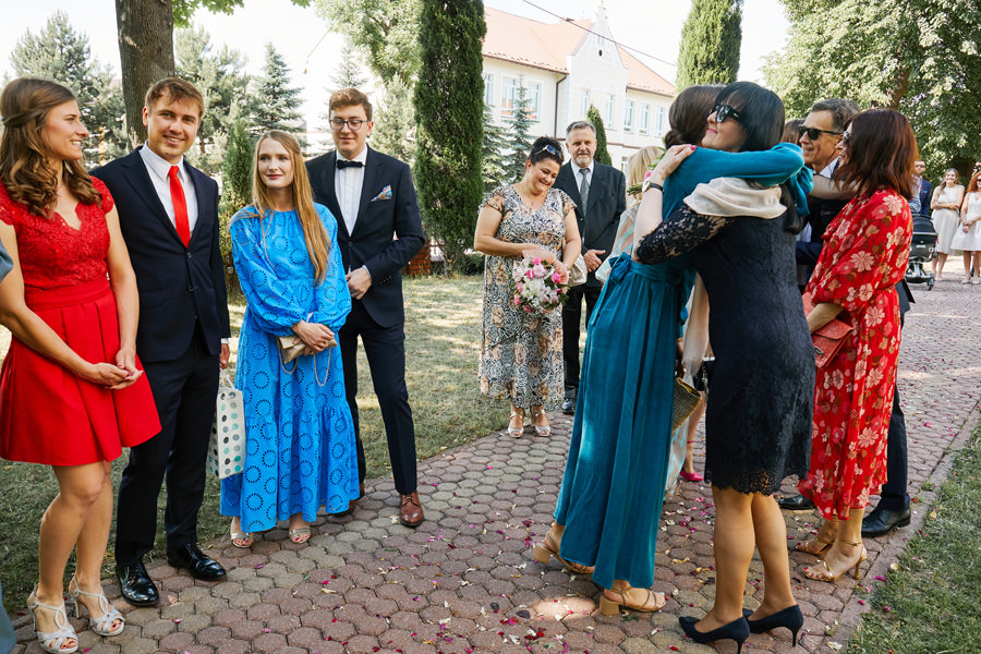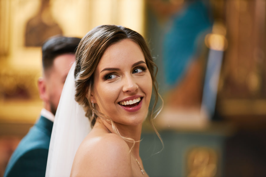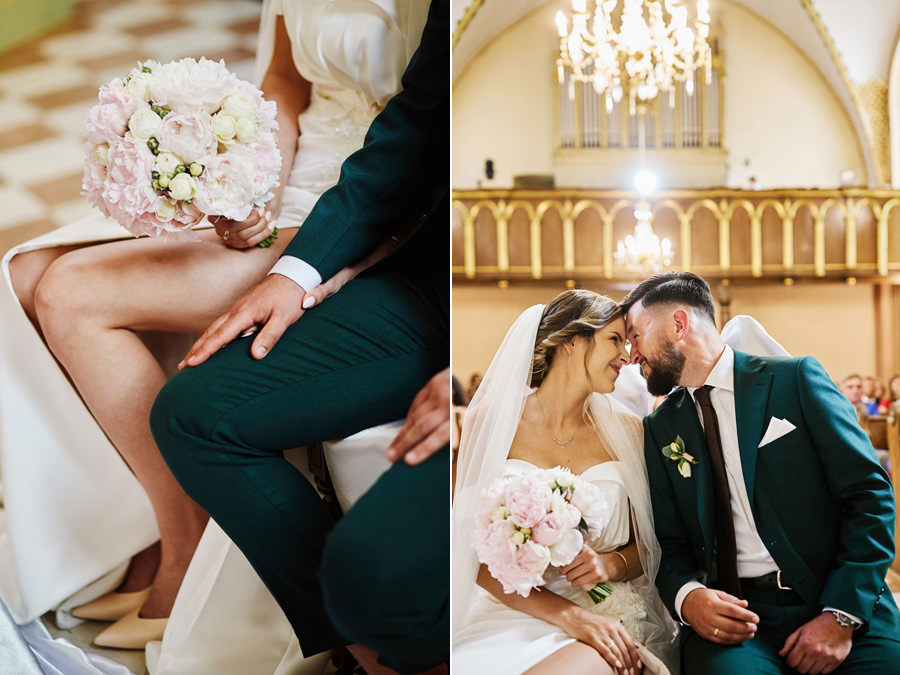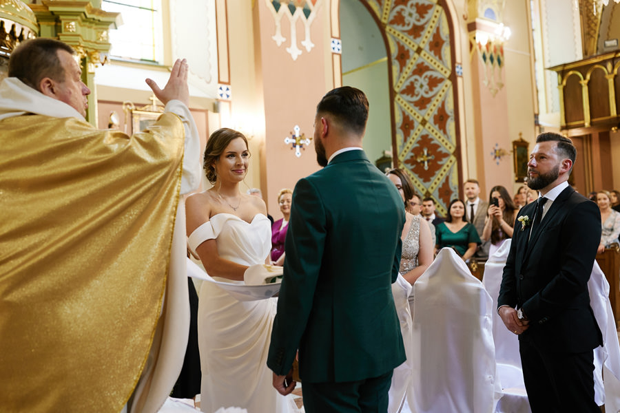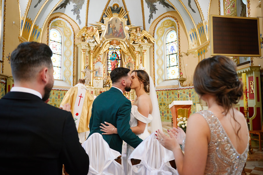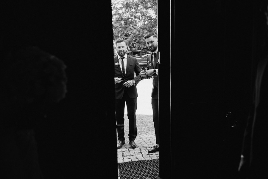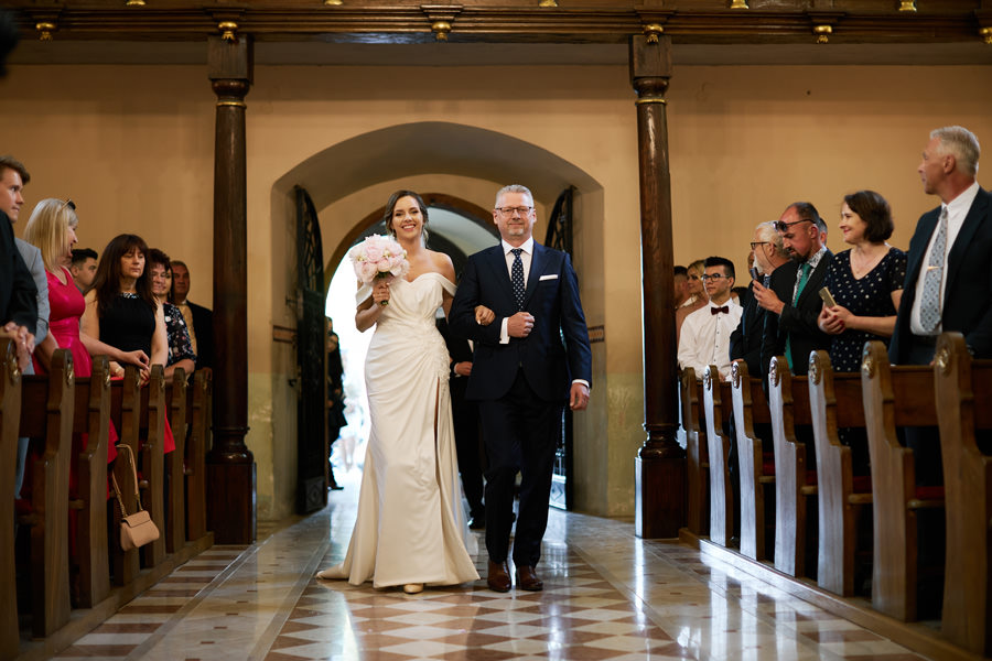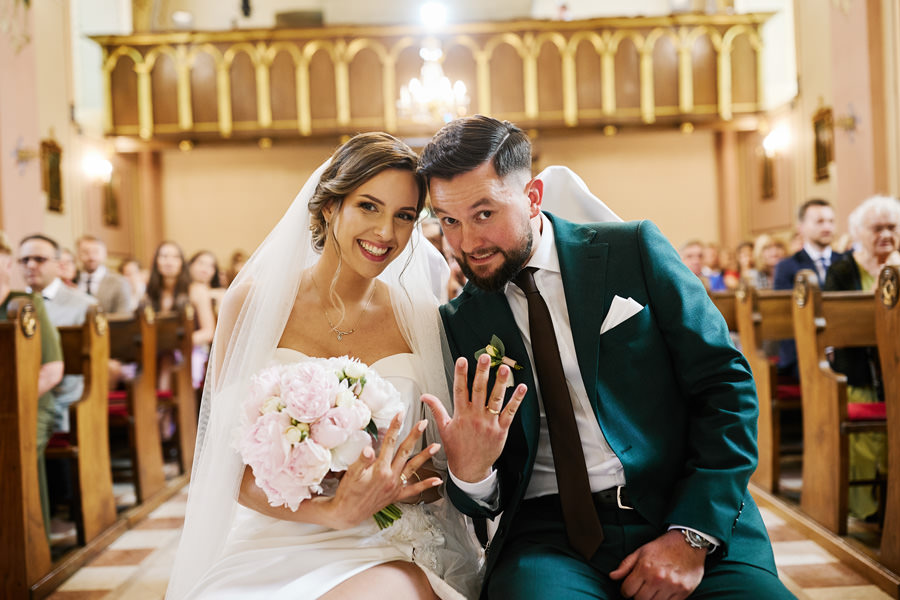Kasia i Karol pobrali się w kościele, w atmosferze wsparcia i bliskości rodziny i przyjaciół. Ksiądz był niezwykle przychylny, ale na wszelki wypadek mamy opracowaną technikę fotografowania ceremonii kościelnych w taki sposób, by jak najmniej rzucać się w oczy. Szczególnie jest to istotne w małych kościołach, jak ten. Pracujemy we dwoje, więc tym bardziej istotne jest to, by nie wprowadzać zamieszania. Dlatego dzielimy się zadaniami. Moim zadaniem jest bycie blisko pary młodej, polowanie na każde spojrzenie i emocję, jaka się między nimi pojawi. Zadaniem mojego męża jest pokazanie szerszego kontekstu. Teraz być może łatwiej będzie wytropić w tym wpisie, które zdjęcia z ceremonii są czyje. Choć jak sama oglądam te zdjęcia, to może to jednak wcale nie aż tak oczywiste ;).
