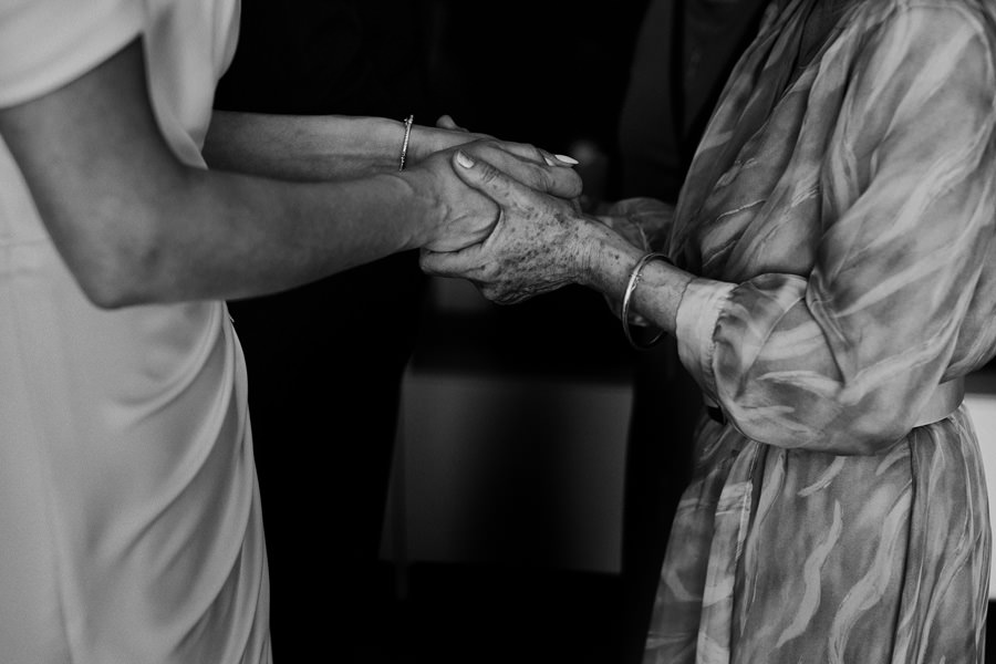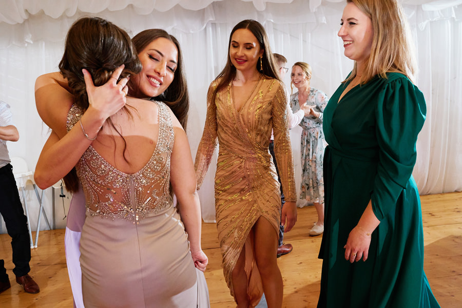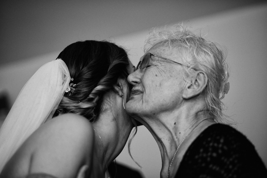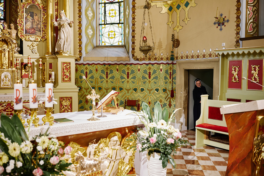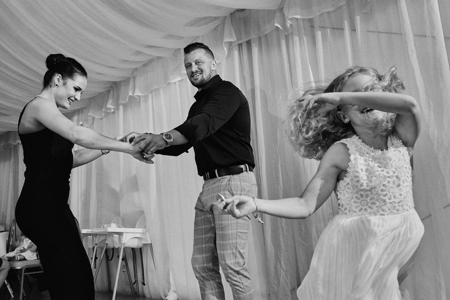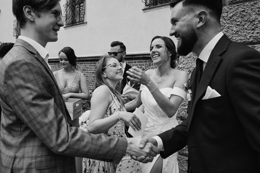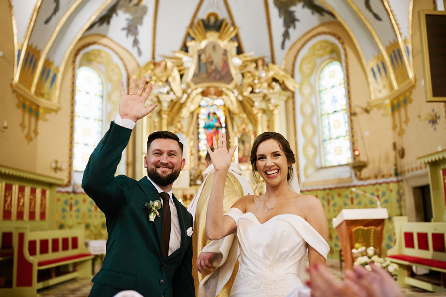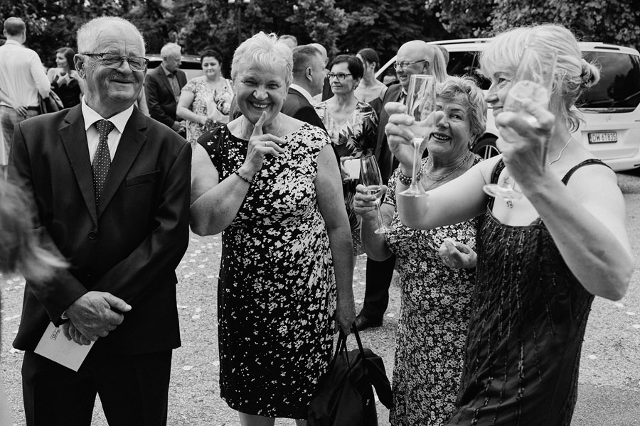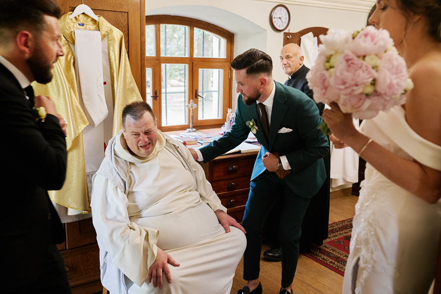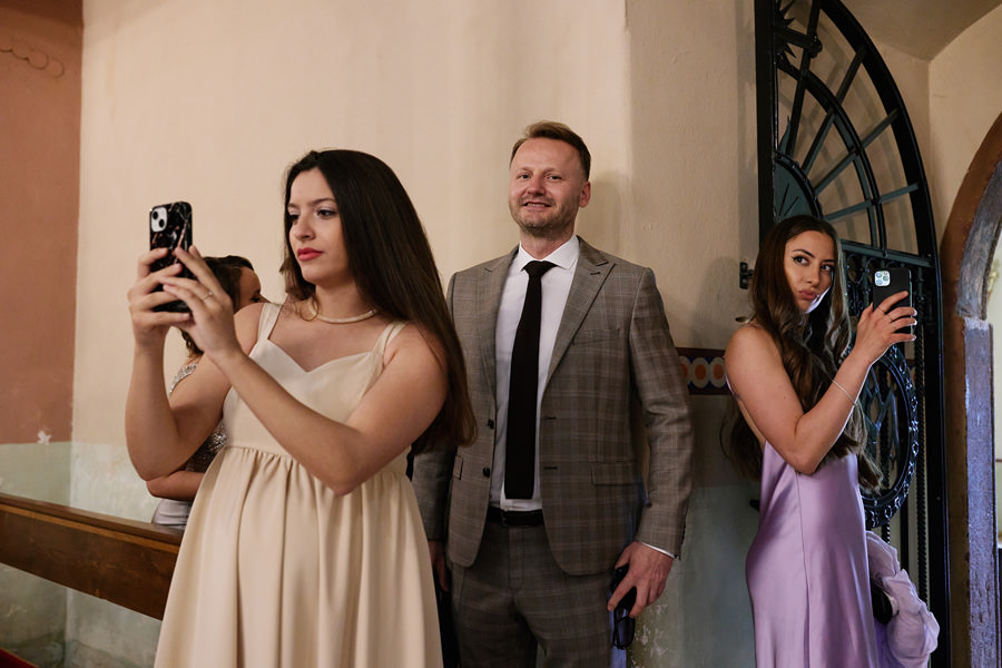 Kasia i Karol pobrali się w kościele, w atmosferze wsparcia i bliskości rodziny i przyjaciół. Ksiądz był niezwykle przychylny, ale na wszelki wypadek mamy opracowaną technikę fotografowania ceremonii kościelnych w taki sposób, by jak najmniej rzucać się w oczy. Szczególnie jest to istotne w małych kościołach, jak ten. Pracujemy we dwoje, więc tym bardziej istotne jest to, by nie wprowadzać zamieszania. Dlatego dzielimy się zadaniami. Moim zadaniem jest bycie blisko pary młodej, polowanie na każde spojrzenie i emocję, jaka się między nimi pojawi. Zadaniem mojego męża jest pokazanie szerszego kontekstu. Teraz być może łatwiej będzie wytropić w tym wpisie, które zdjęcia z ceremonii są czyje. Choć jak sama oglądam te zdjęcia, to może to jednak wcale nie aż tak oczywiste ;).