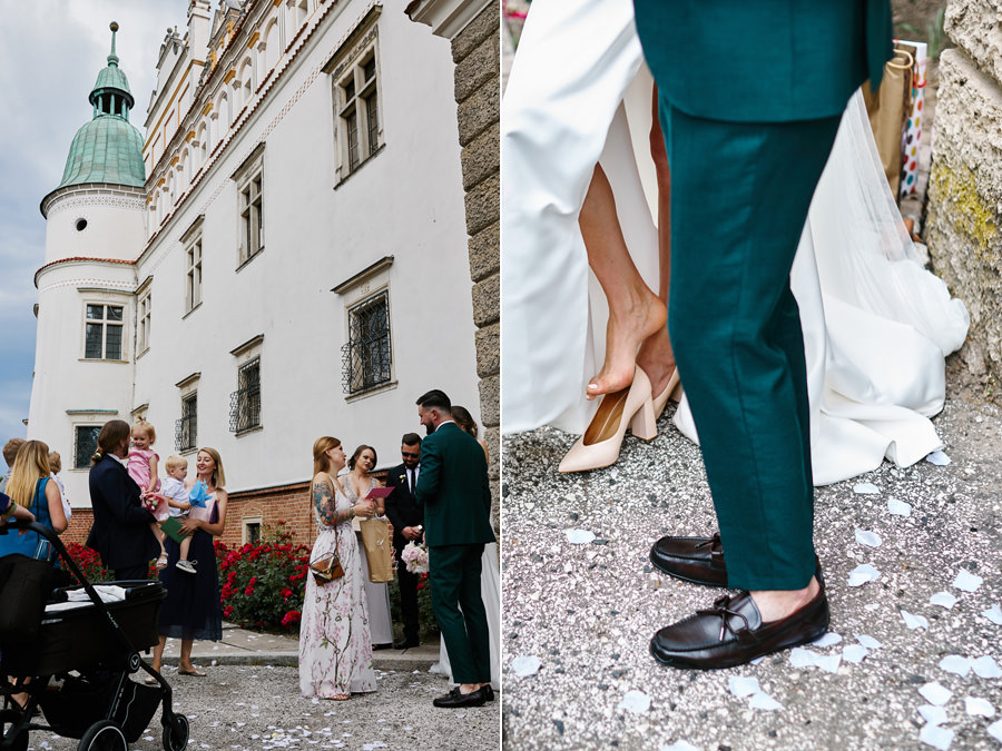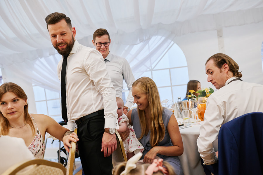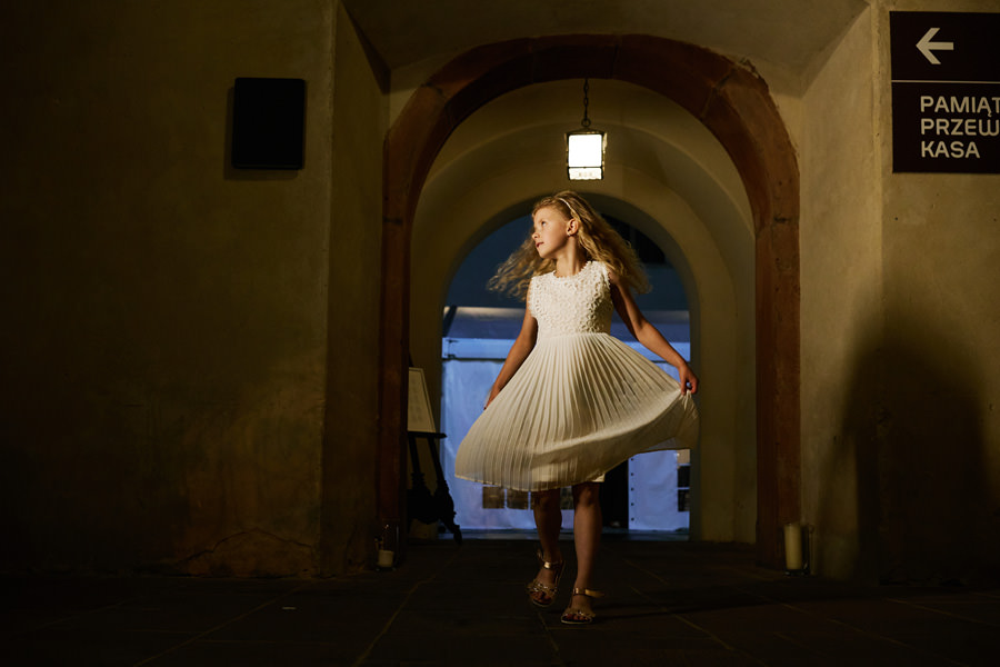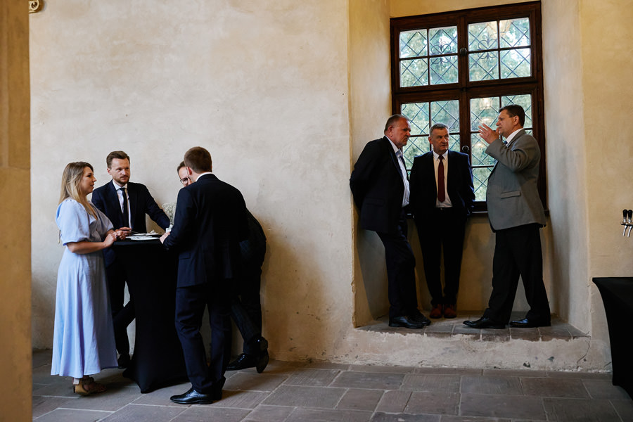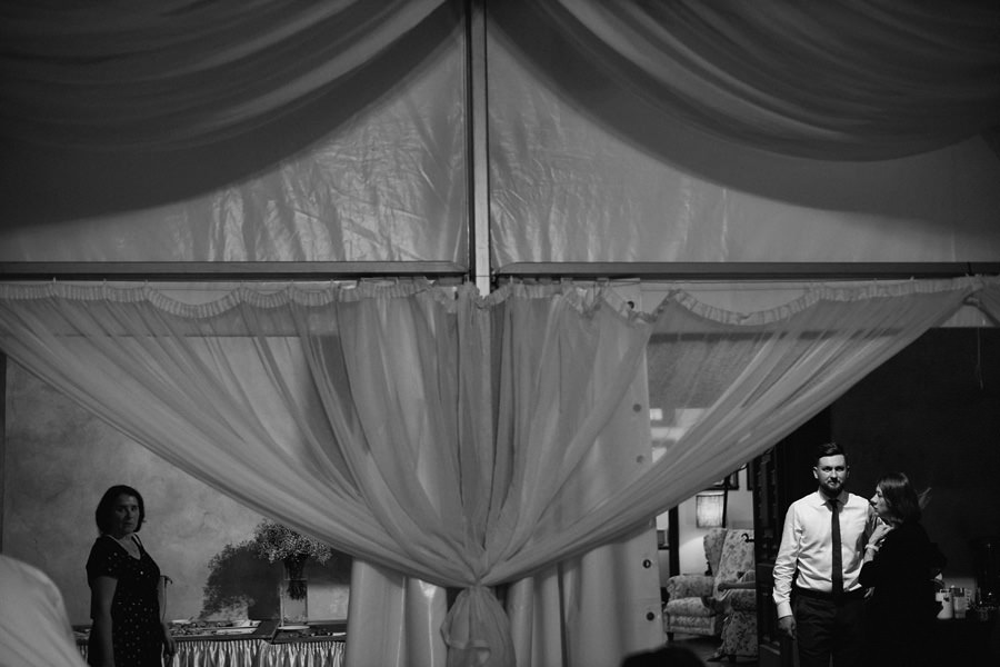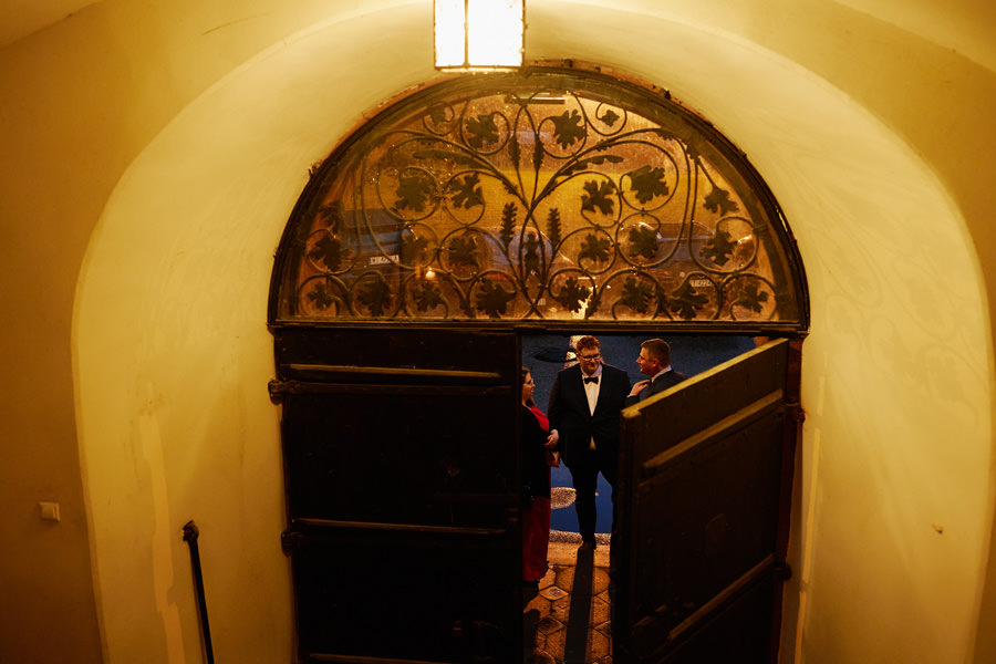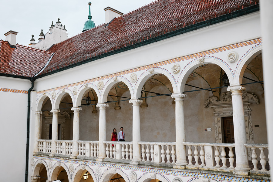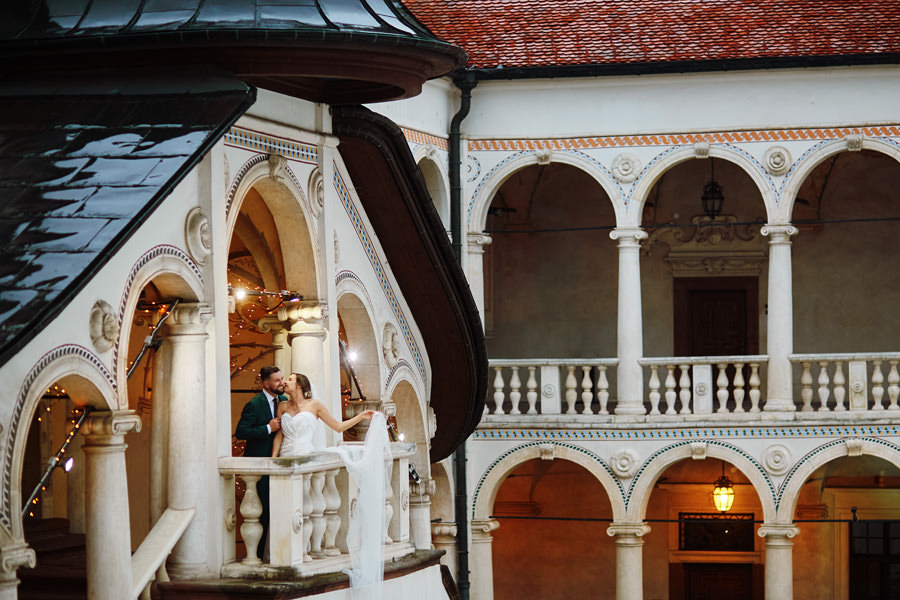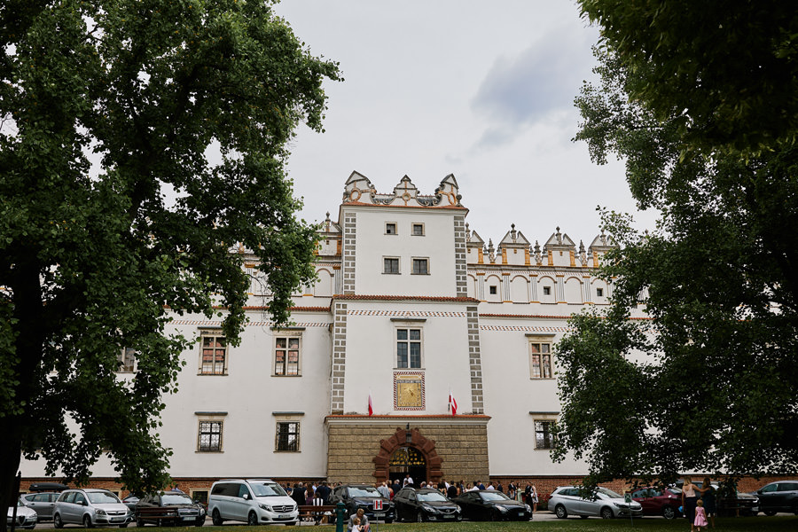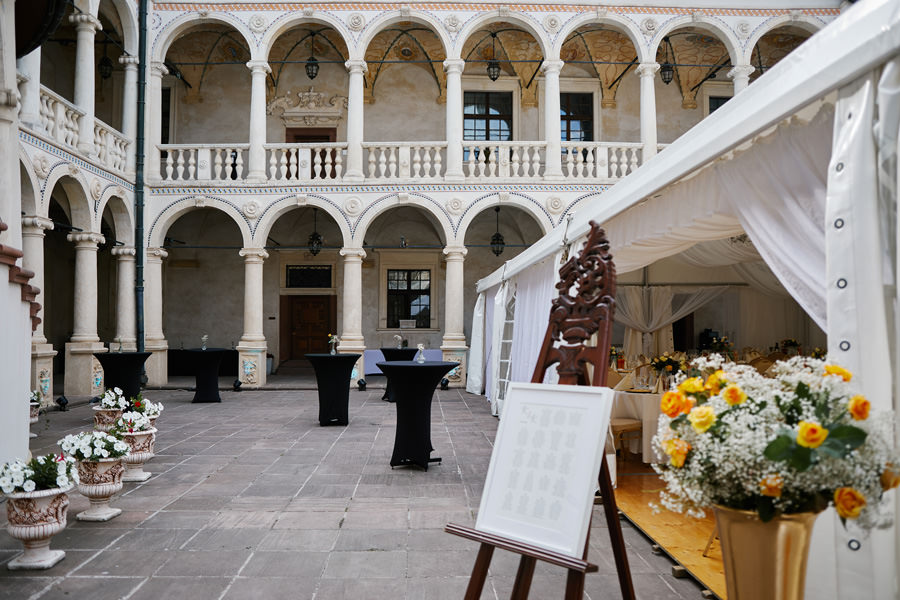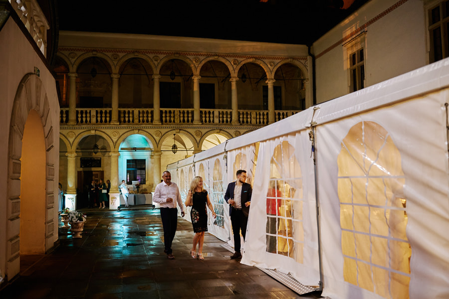 Zamek w Baranowie Sandomierskich posiada przestronny dziedziniec, na którym rozłożony jest namiot. To właśnie w nim odbywają się wesela. Jest to świetna opcja dla par, które z jednej strony marzą o weselu na zamku, ale z drugiej strony boją się, żeby ten ciężki klasycystyczny styl nie zdominował i nie przytłoczył wesela. Namioty na wesela to najczęściej proste i ascetyczne wnętrza, ale ten konkretny miał w sobie element glamour, czyli kryształowe żyrandole :). Niemniej jednak prostota namiotowego wnętrza bardzo pięknie kontrastowała z efektownym dziedzińcem i jego dwoma piętrami arkad. Żałujemy tylko tego, że był to deszczowy dzień, co zresztą widać w zdjęciach. Ale może następnym razem, jeśli jeszcze tam kiedyś wrócimy, będzie nam dane sfotografować wesele w zamku w Baranowie Sandomierskim w promieniach słońca.