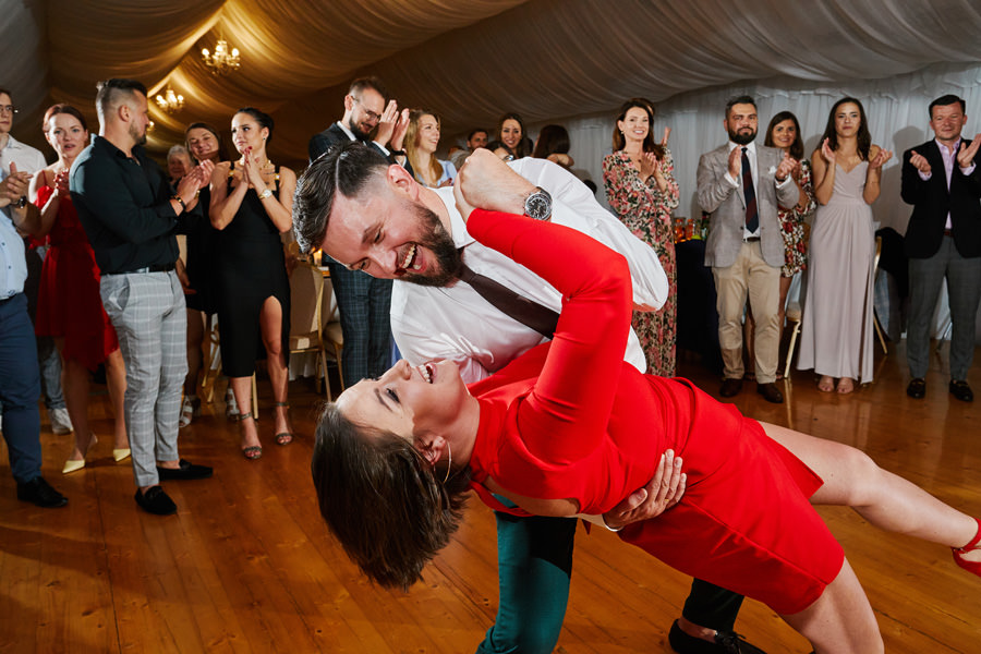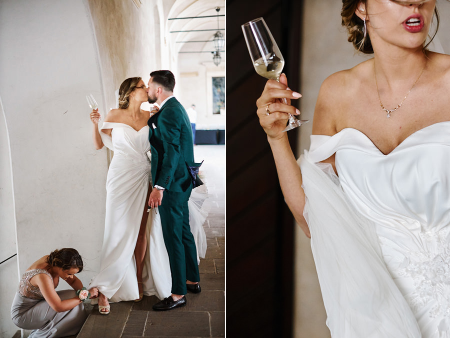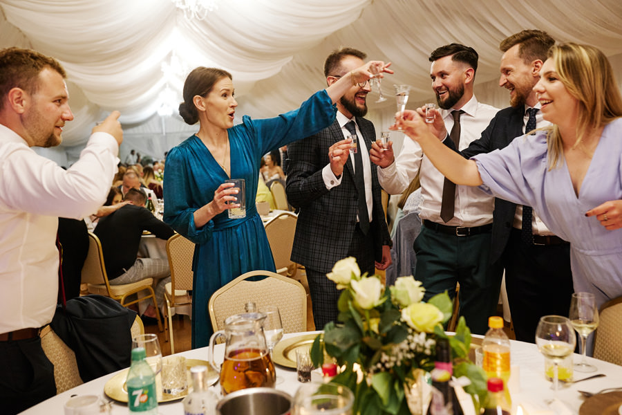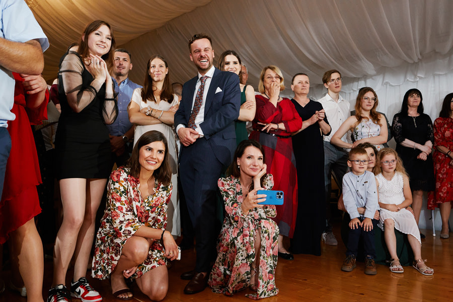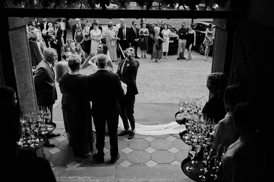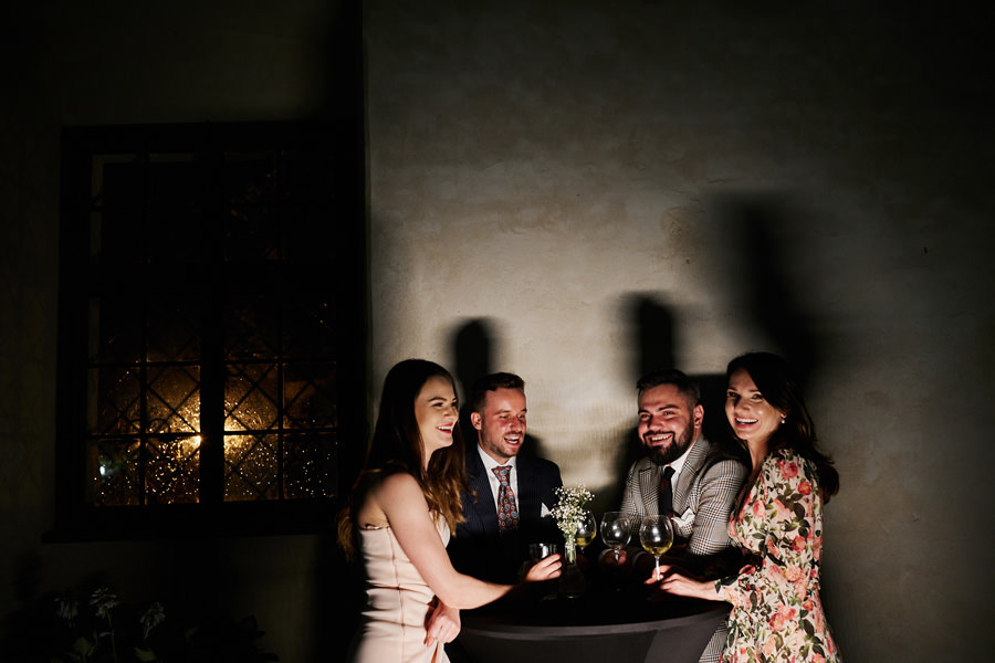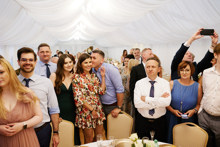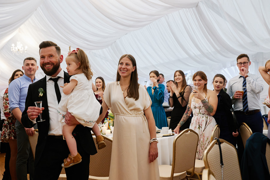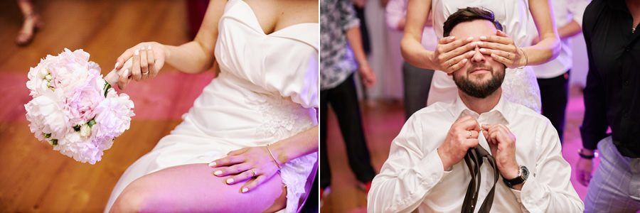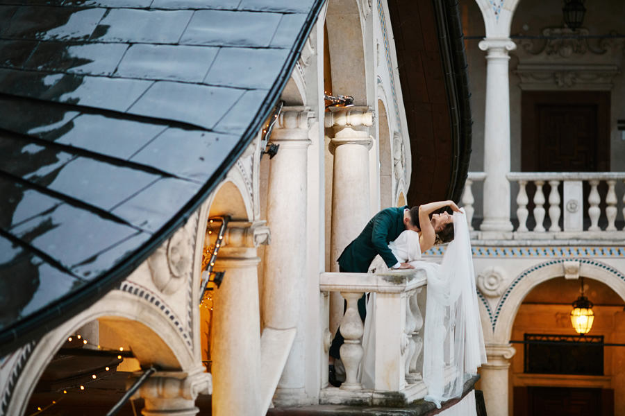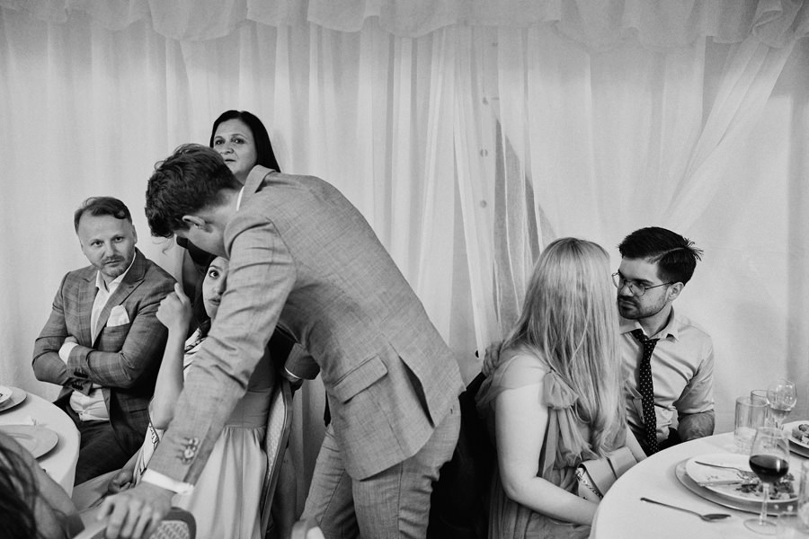 Zamek w Baranowie Sandomierskich posiada przestronny dziedziniec, na którym rozłożony jest namiot. To właśnie w nim odbywają się wesela. Jest to świetna opcja dla par, które z jednej strony marzą o weselu na zamku, ale z drugiej strony boją się, żeby ten ciężki klasycystyczny styl nie zdominował i nie przytłoczył wesela. Namioty na wesela to najczęściej proste i ascetyczne wnętrza, ale ten konkretny miał w sobie element glamour, czyli kryształowe żyrandole :). Niemniej jednak prostota namiotowego wnętrza bardzo pięknie kontrastowała z efektownym dziedzińcem i jego dwoma piętrami arkad. Żałujemy tylko tego, że był to deszczowy dzień, co zresztą widać w zdjęciach. Ale może następnym razem, jeśli jeszcze tam kiedyś wrócimy, będzie nam dane sfotografować wesele w zamku w Baranowie Sandomierskim w promieniach słońca.