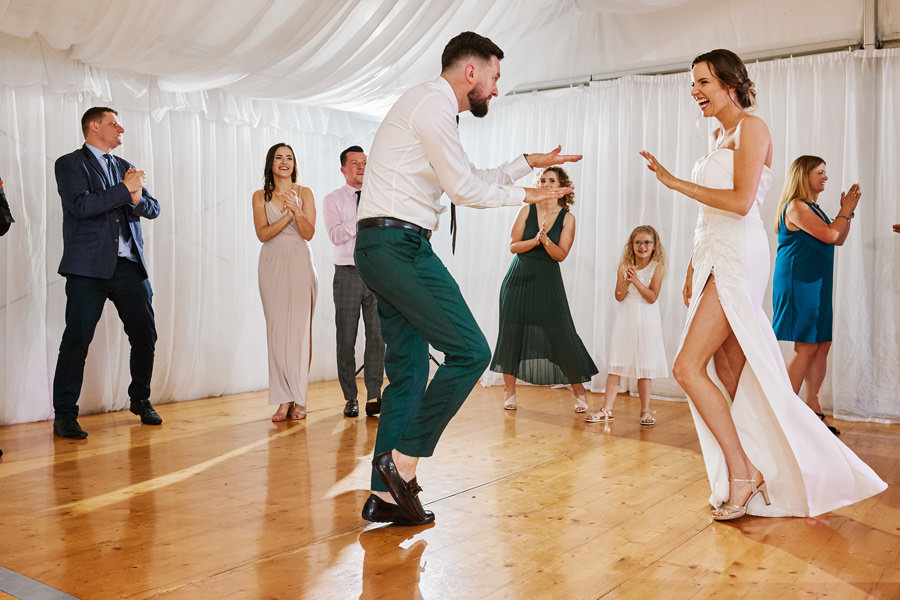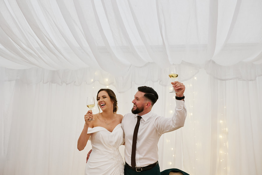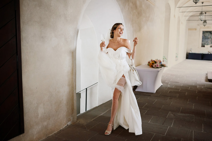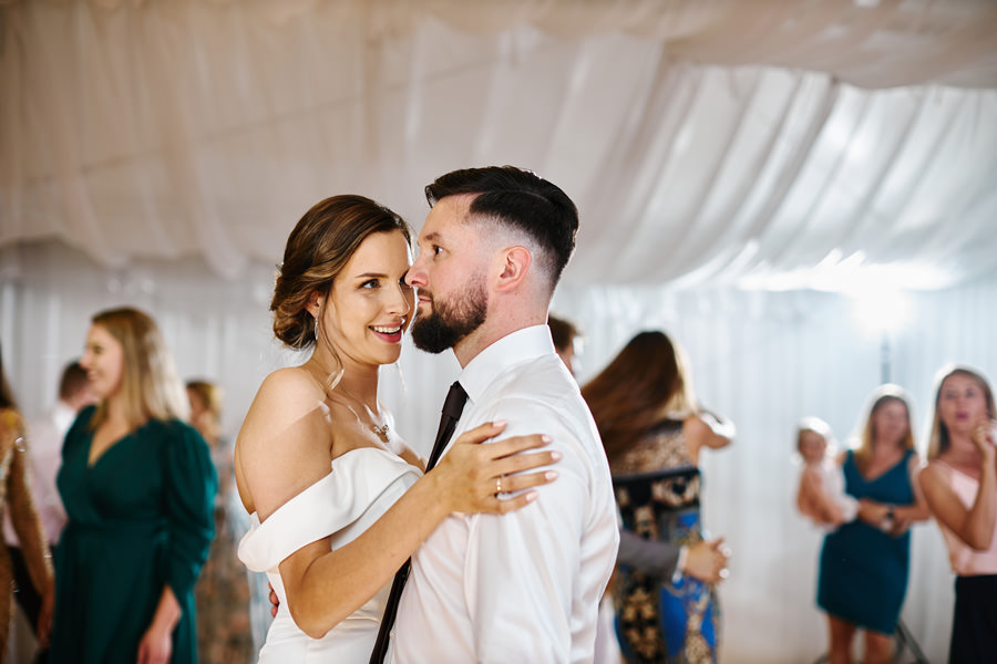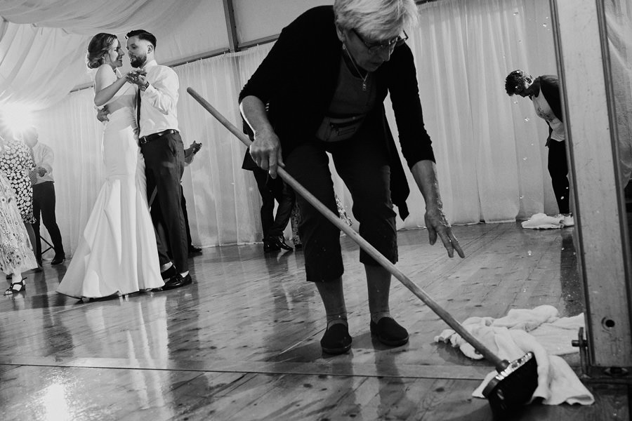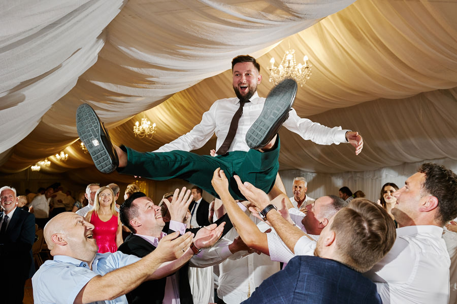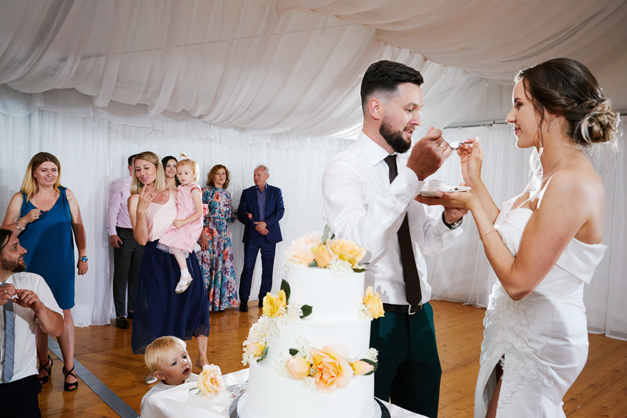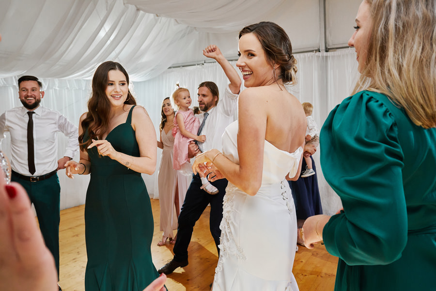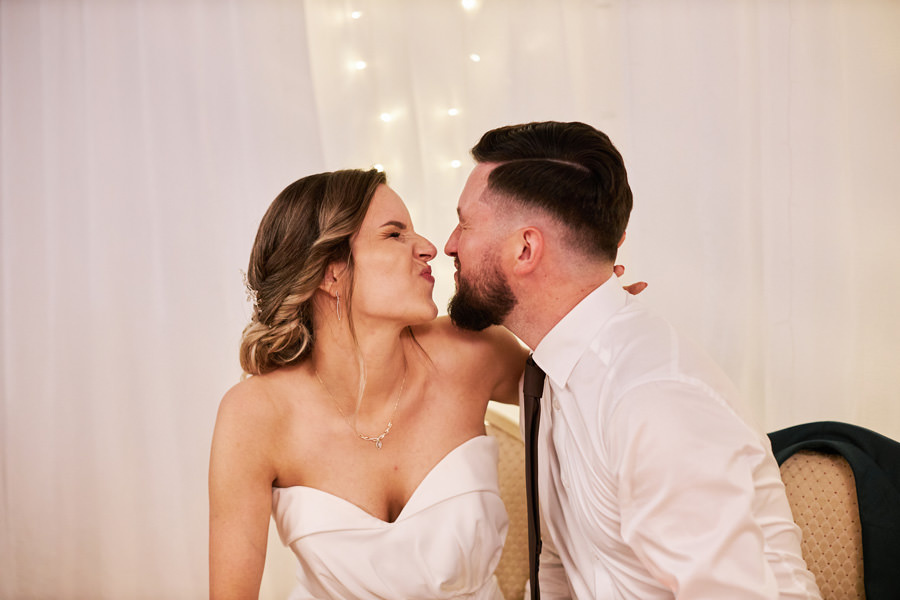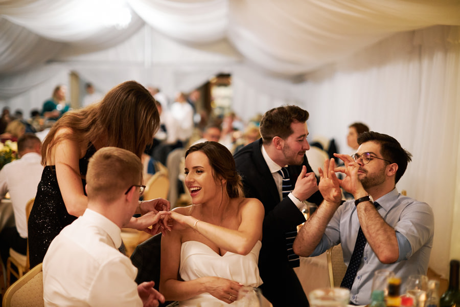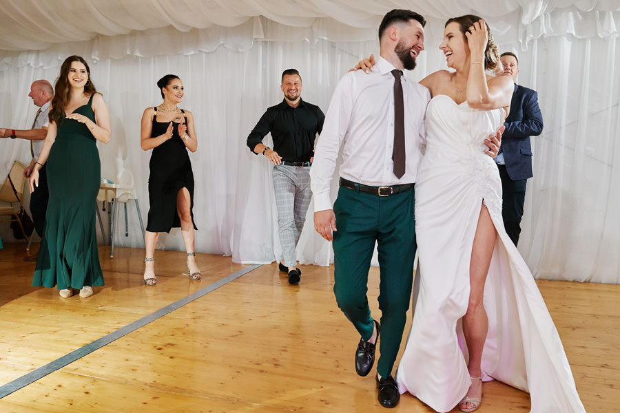 Zamek w Baranowie Sandomierskich posiada przestronny dziedziniec, na którym rozłożony jest namiot. To właśnie w nim odbywają się wesela. Jest to świetna opcja dla par, które z jednej strony marzą o weselu na zamku, ale z drugiej strony boją się, żeby ten ciężki klasycystyczny styl nie zdominował i nie przytłoczył wesela. Namioty na wesela to najczęściej proste i ascetyczne wnętrza, ale ten konkretny miał w sobie element glamour, czyli kryształowe żyrandole :). Niemniej jednak prostota namiotowego wnętrza bardzo pięknie kontrastowała z efektownym dziedzińcem i jego dwoma piętrami arkad. Żałujemy tylko tego, że był to deszczowy dzień, co zresztą widać w zdjęciach. Ale może następnym razem, jeśli jeszcze tam kiedyś wrócimy, będzie nam dane sfotografować wesele w zamku w Baranowie Sandomierskim w promieniach słońca.