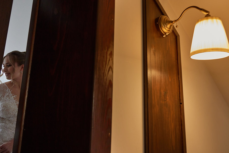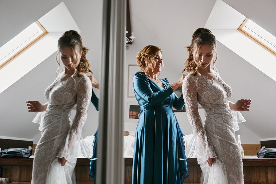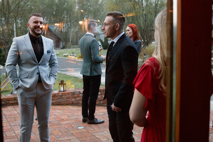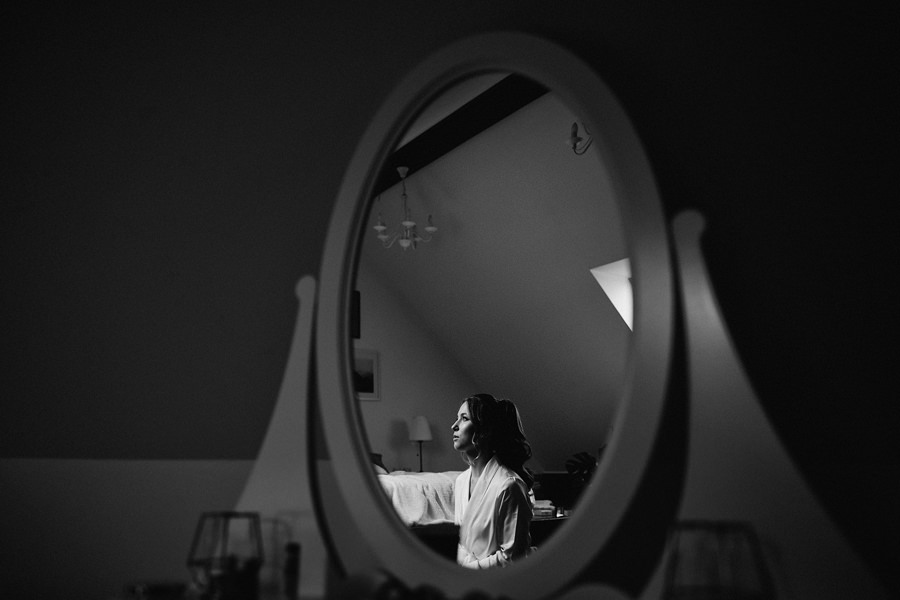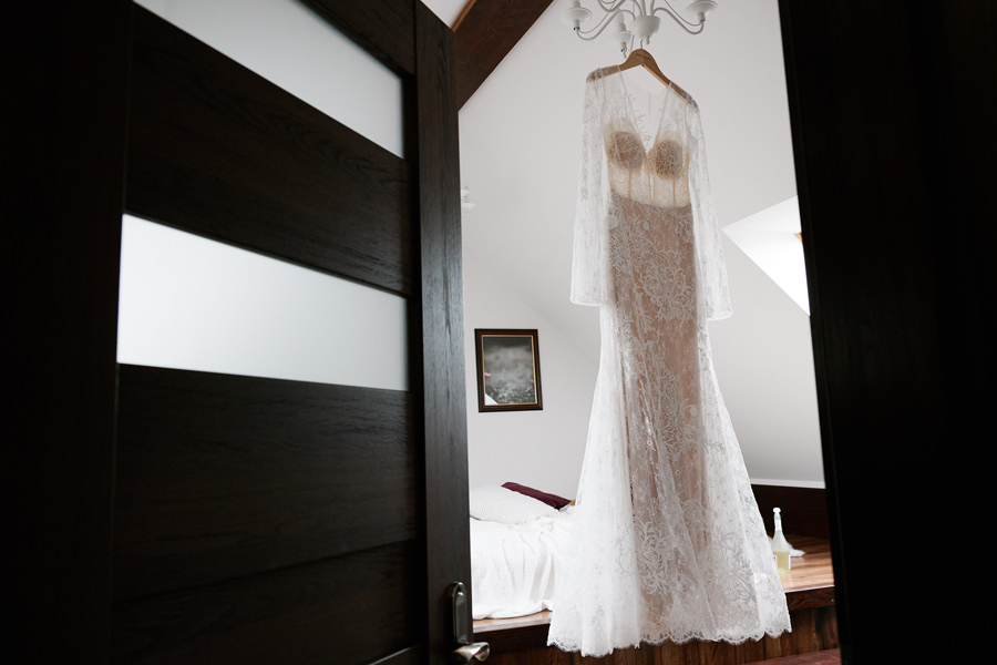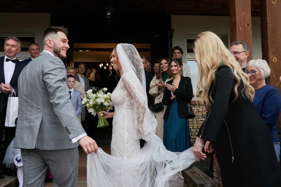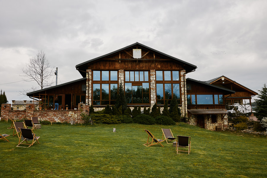 Kiedy przyjechaliśmy tu pierwszy raz, byliśmy absolutnie urzeczeni tym miejscem. Położone z dala od zgiełku miasta, ale jednocześnie na tyle blisko, że dojazd nie jest problemem. Otoczone łąkami i polami ma prawdziwie sielski klimat. Budynek wzniesiony z cegły, kamienia i drewna jest jednocześnie rustykalny w swoim charakterze. Ale z kolei wielkie przeszklenia sprawiają, że ma w sobie też nowoczesność. Na swoje wesele w Dworzyszczu Wola zaprosili nas w pewien kwietniowy dzień Laura i Aleksander. Choć padał deszcz i nie mogliśmy w pełni wykorzystać dobrodziejstw tego miejsca, udało się stworzyć bardzo intensywny reportaż :).