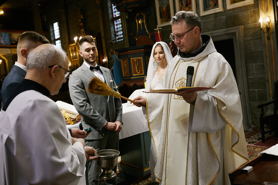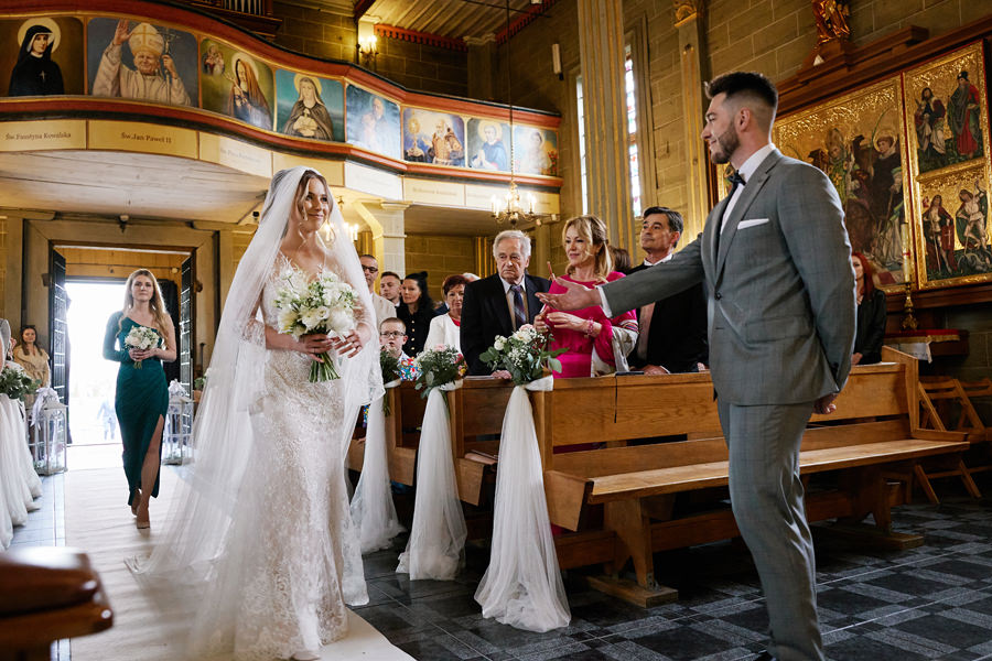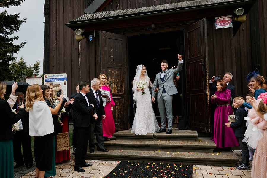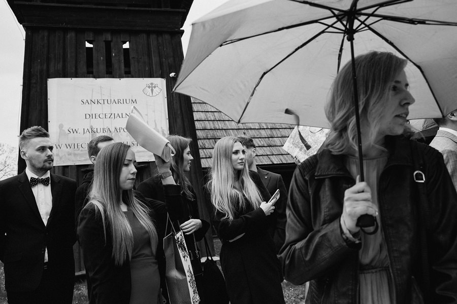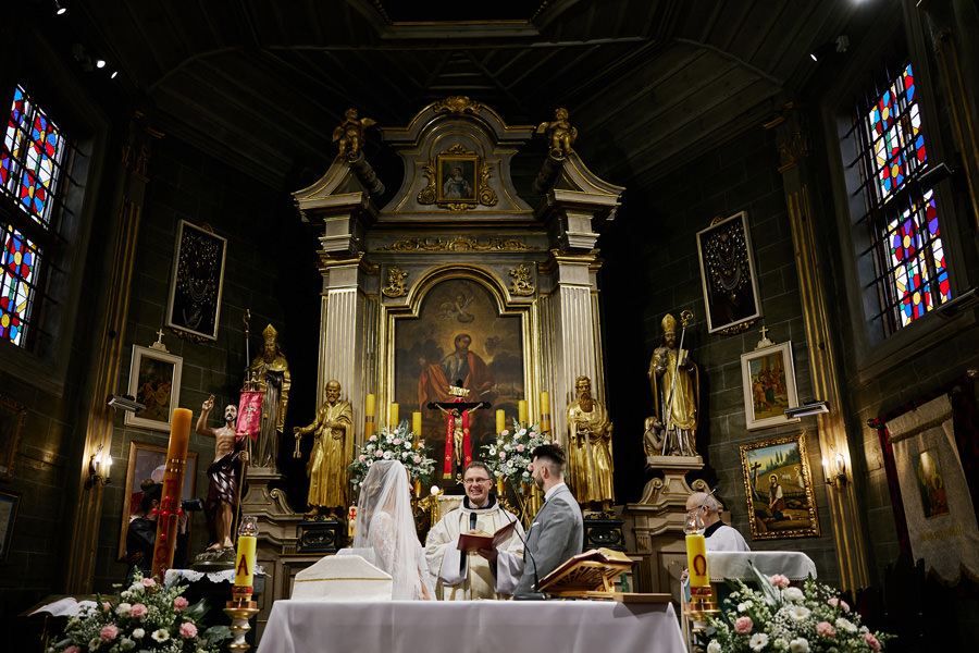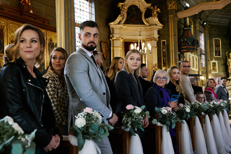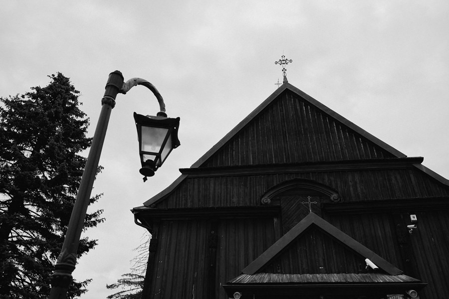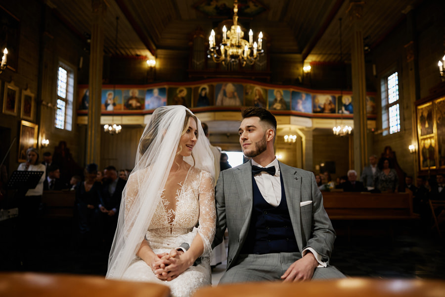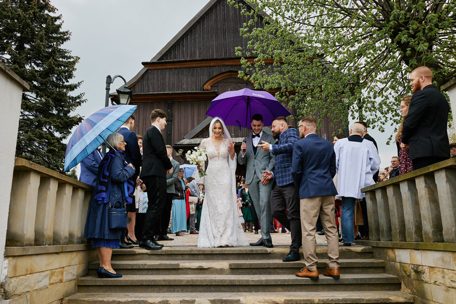 Na miejsce ceremonii para młoda wybrała kościół położony w bliskiej okolicy, który swoim klimatem nawiązywał do miejsca wesela. Stary, drewniany, niewielki kościółek był idealnym wyborem na tę wzruszającą ceremonię. Nawet niebo nie mogło się powstrzymać, też było wzruszone, zapewne stąd ten deszcz ;). Ale tak znakomitych nastrojów zdecydowanie nie mogła popsuć pogoda.