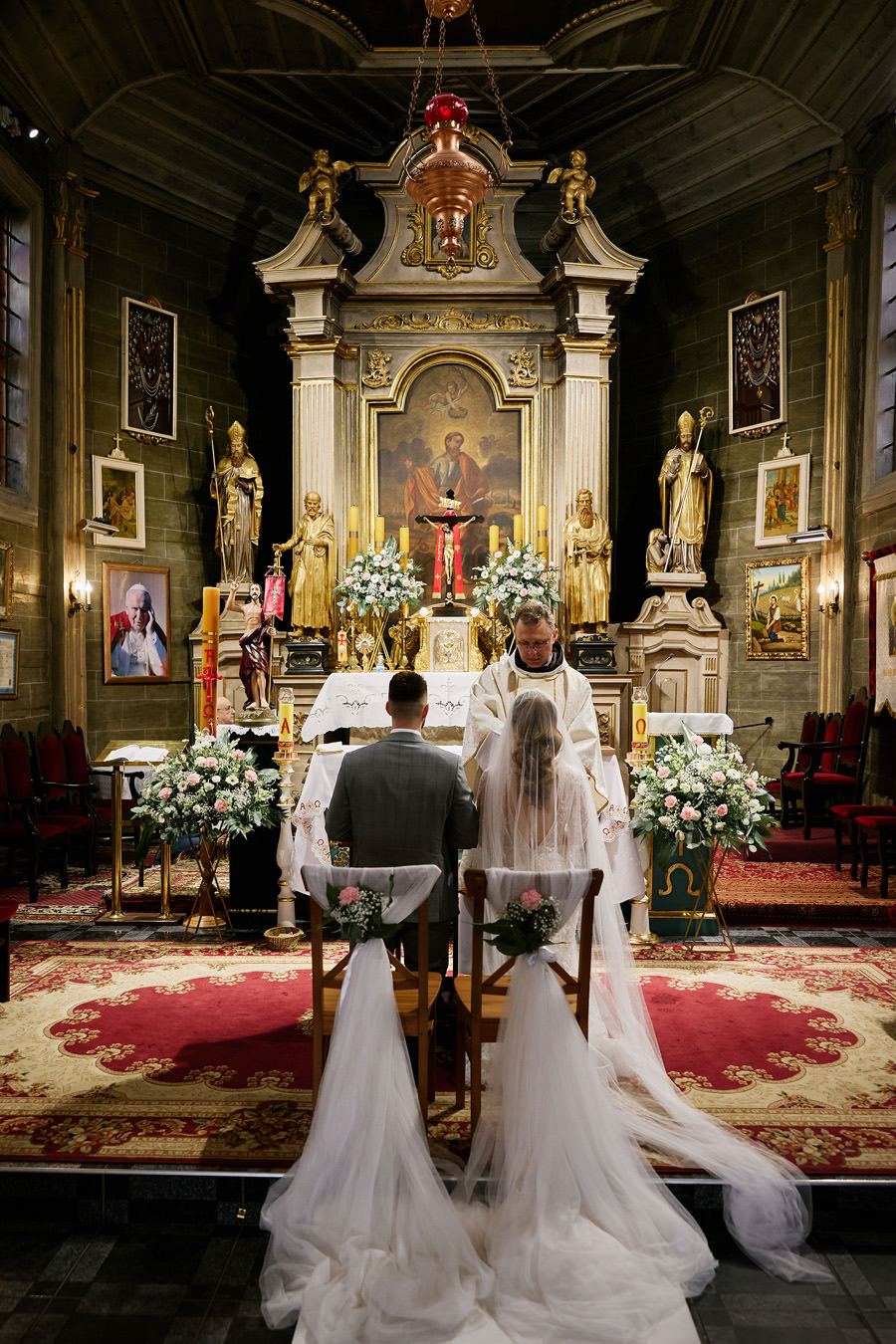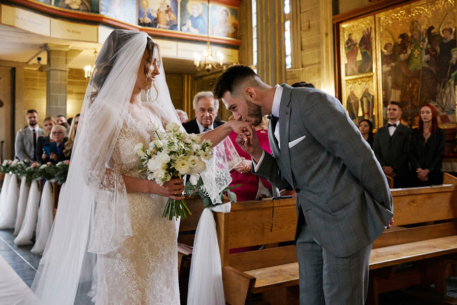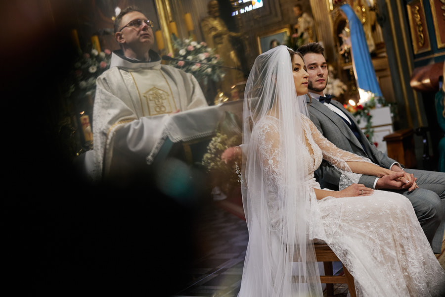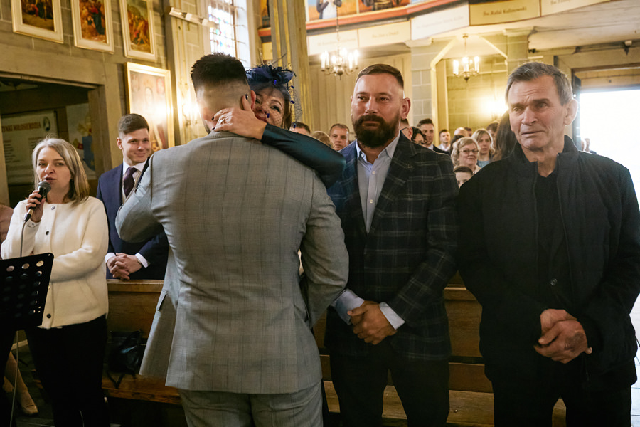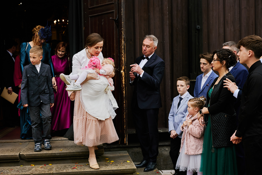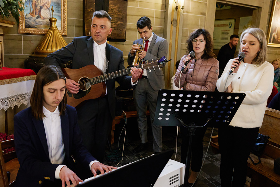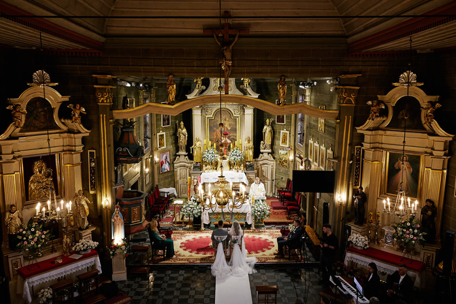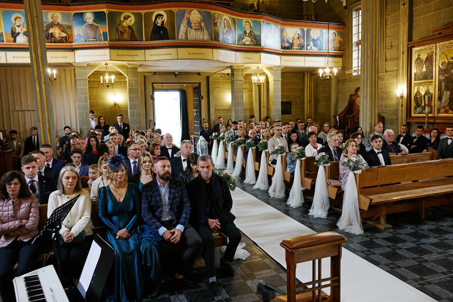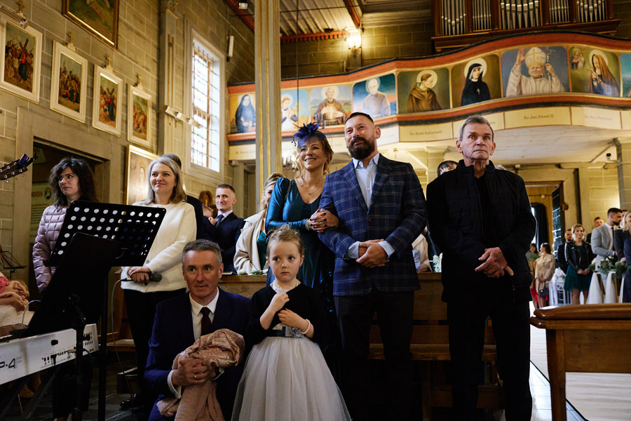 Na miejsce ceremonii para młoda wybrała kościół położony w bliskiej okolicy, który swoim klimatem nawiązywał do miejsca wesela. Stary, drewniany, niewielki kościółek był idealnym wyborem na tę wzruszającą ceremonię. Nawet niebo nie mogło się powstrzymać, też było wzruszone, zapewne stąd ten deszcz ;). Ale tak znakomitych nastrojów zdecydowanie nie mogła popsuć pogoda.