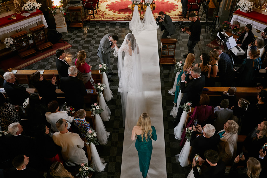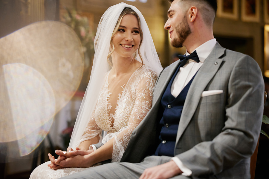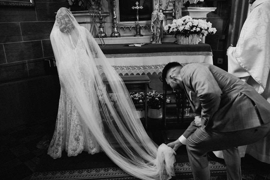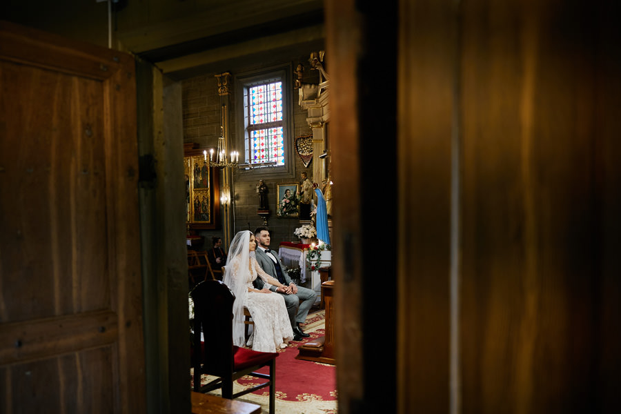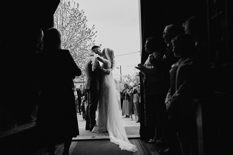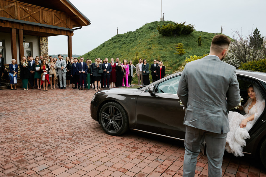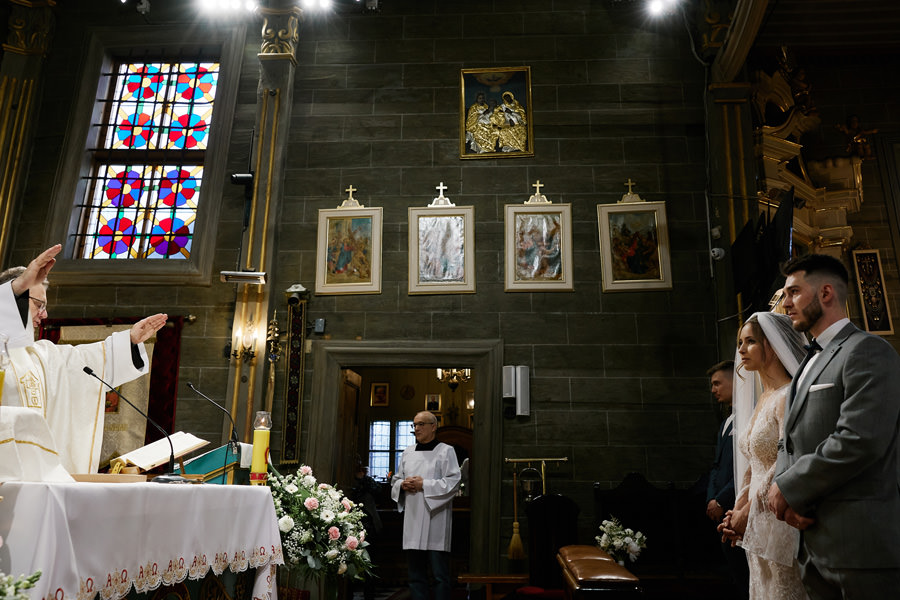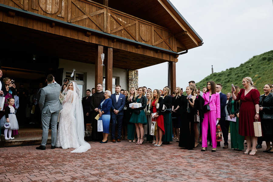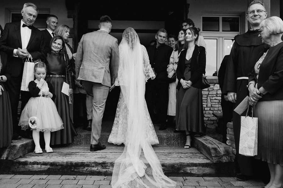 Na miejsce ceremonii para młoda wybrała kościół położony w bliskiej okolicy, który swoim klimatem nawiązywał do miejsca wesela. Stary, drewniany, niewielki kościółek był idealnym wyborem na tę wzruszającą ceremonię. Nawet niebo nie mogło się powstrzymać, też było wzruszone, zapewne stąd ten deszcz ;). Ale tak znakomitych nastrojów zdecydowanie nie mogła popsuć pogoda.