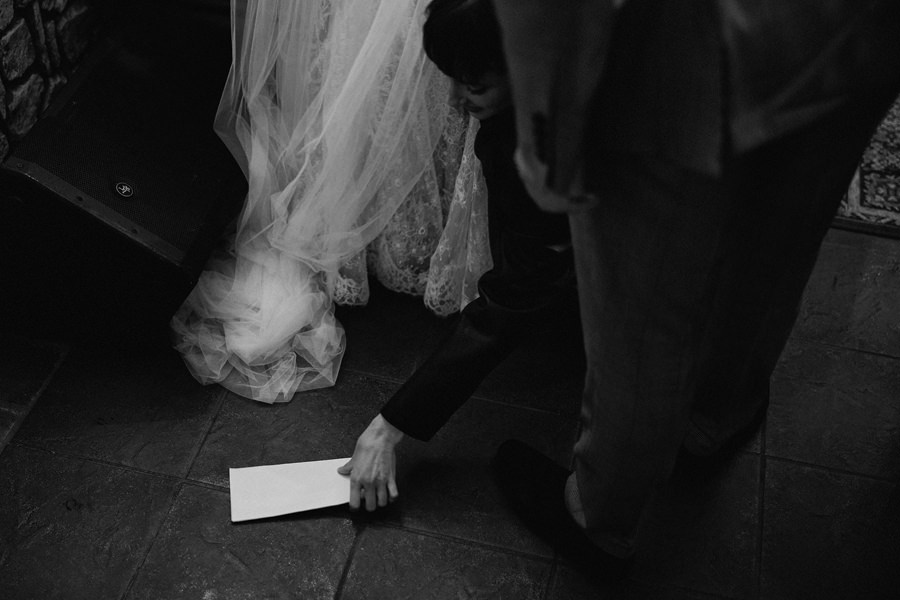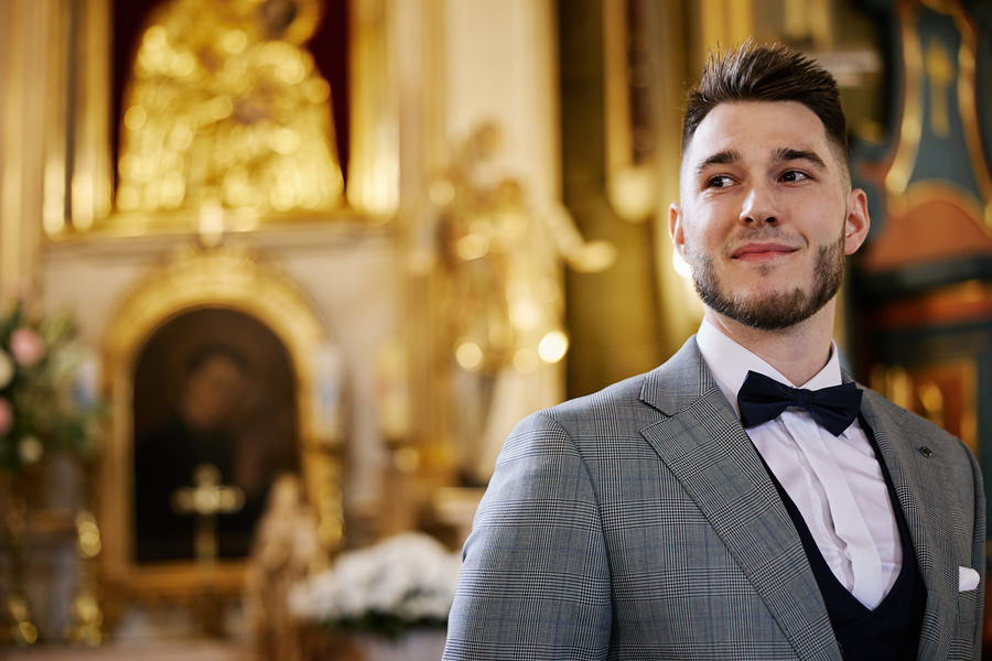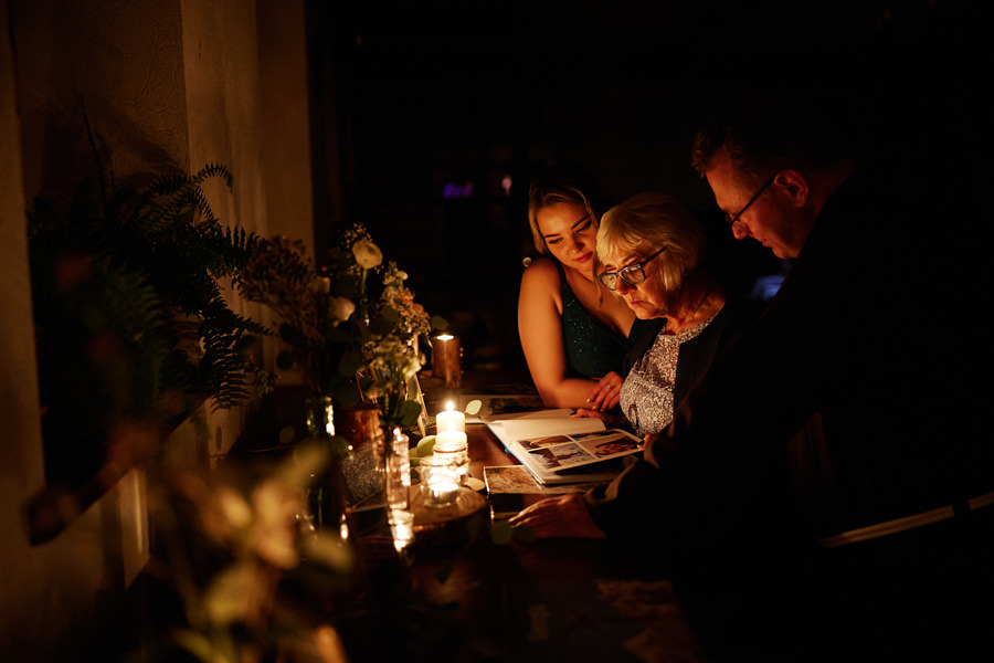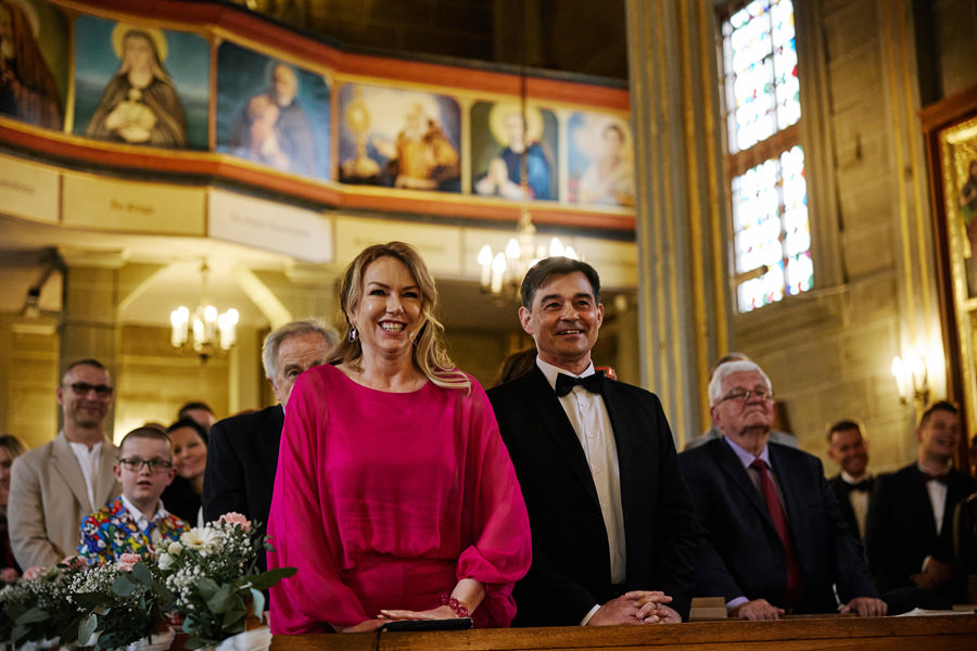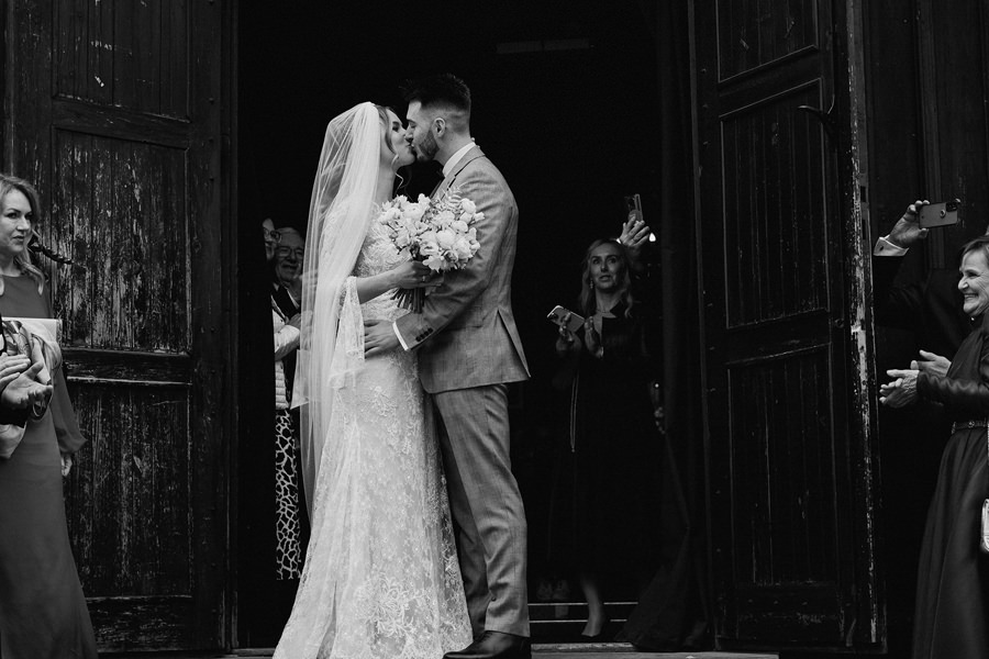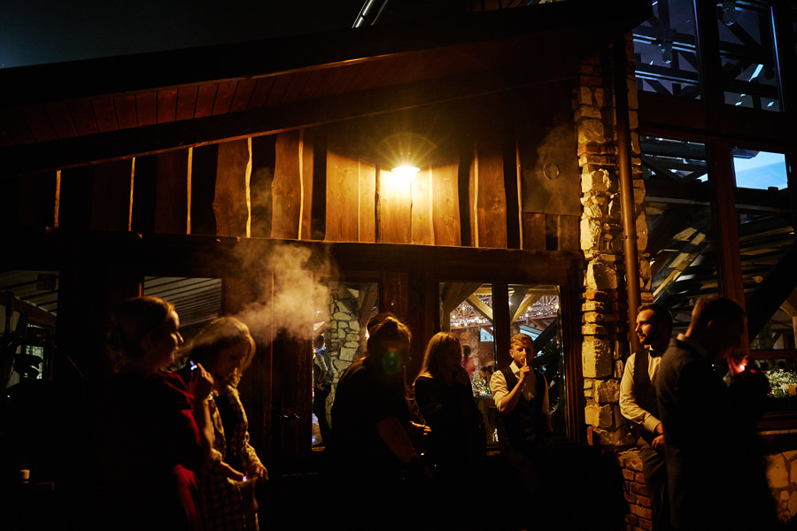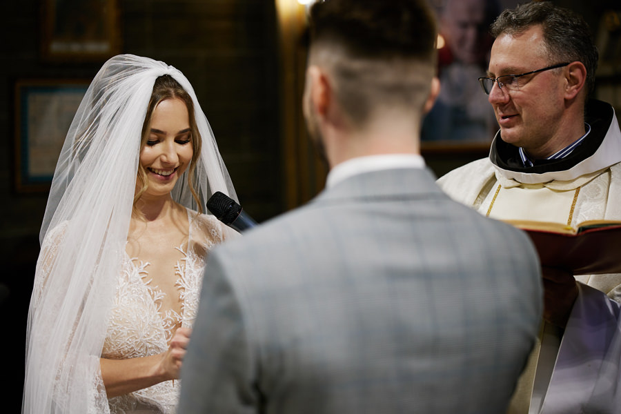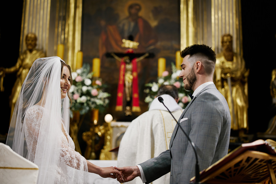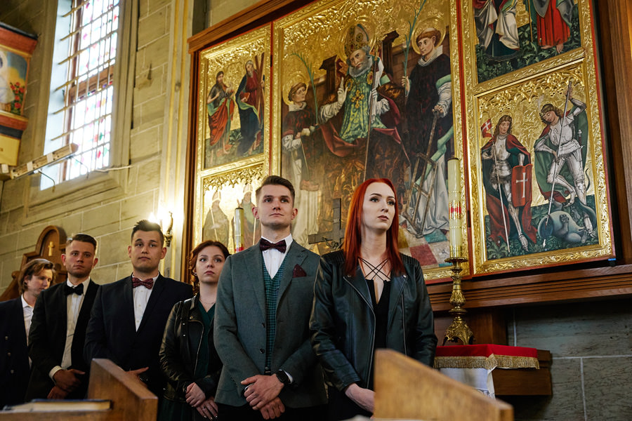 Na miejsce ceremonii para młoda wybrała kościół położony w bliskiej okolicy, który swoim klimatem nawiązywał do miejsca wesela. Stary, drewniany, niewielki kościółek był idealnym wyborem na tę wzruszającą ceremonię. Nawet niebo nie mogło się powstrzymać, też było wzruszone, zapewne stąd ten deszcz ;). Ale tak znakomitych nastrojów zdecydowanie nie mogła popsuć pogoda.