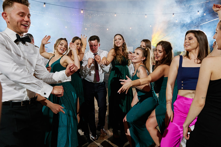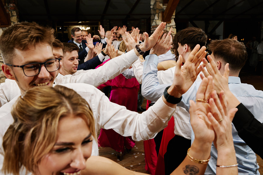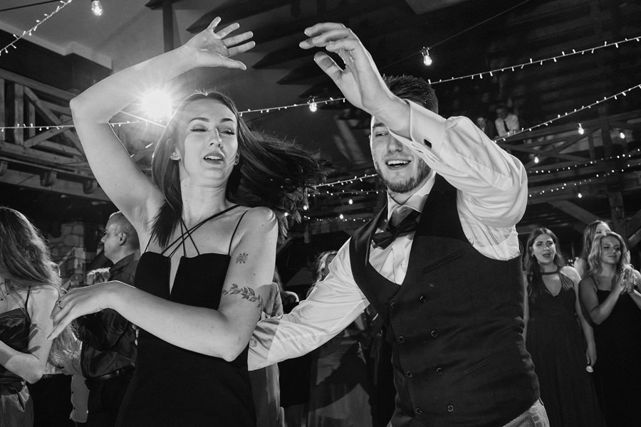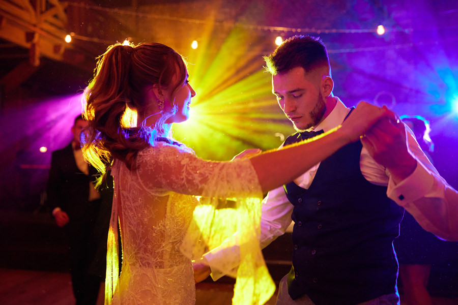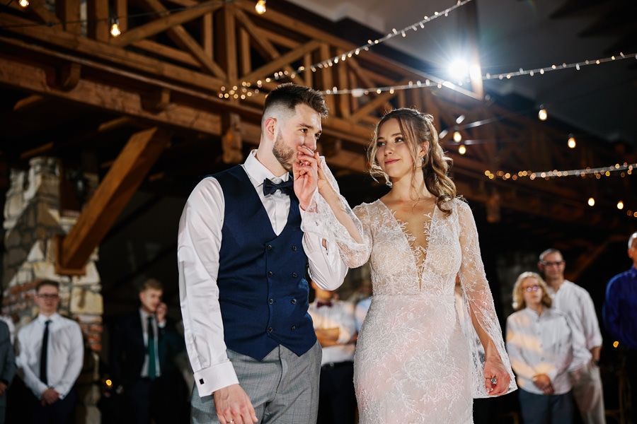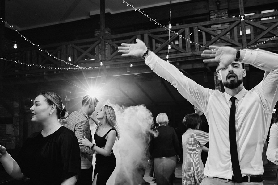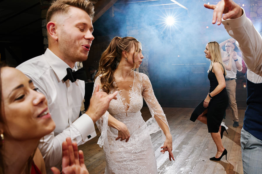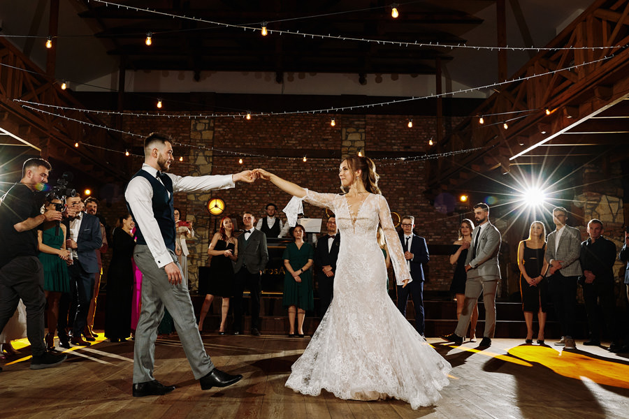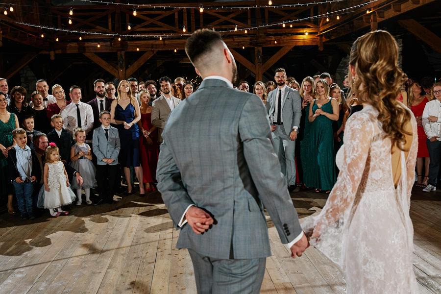 Po ceremonii udaliśmy się na wesele do Dworzyszcza. Miejsce wyglądało przepięknie. Drobne światełka rozciągnięte nad parkietem sprzyjały romantycznemu nastrojowi. A stylowe lampy w klimacie retro, dające piękne ciepłe światło, i przepiękna konsola DJa od BrosArt również idealnie wpisały się w klimat tego miejsca.