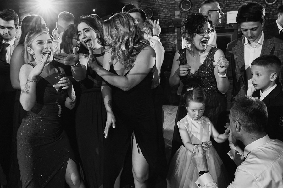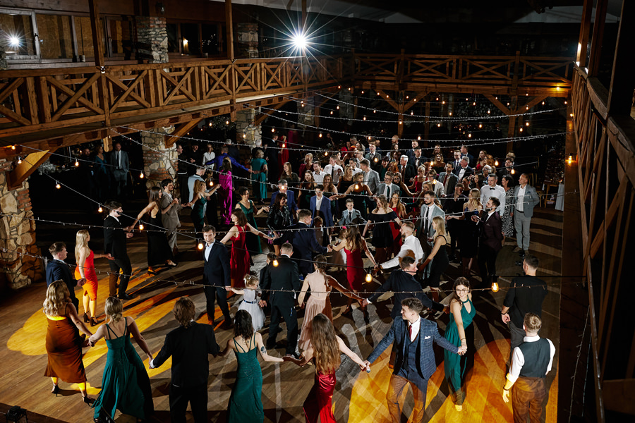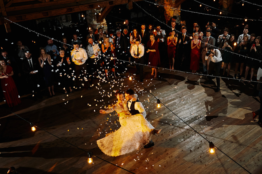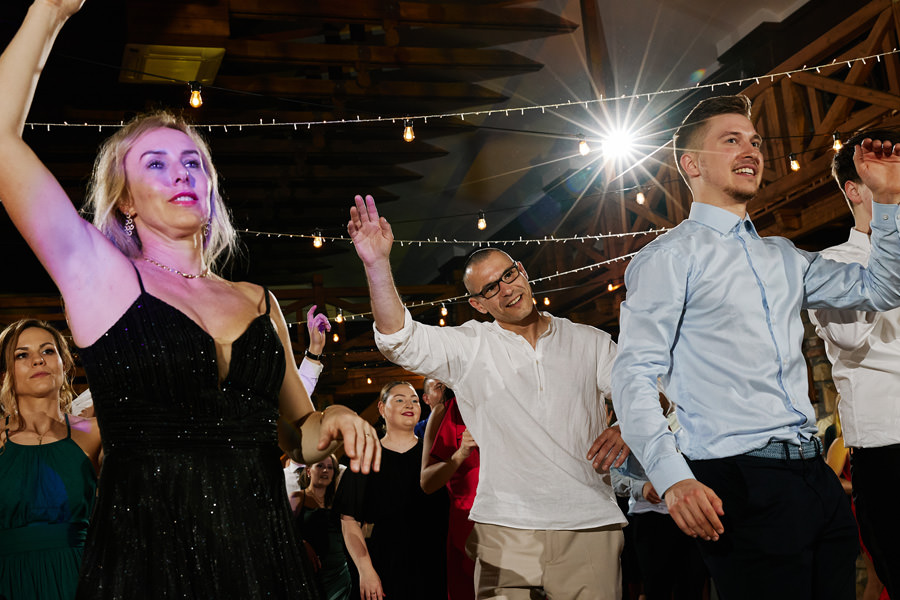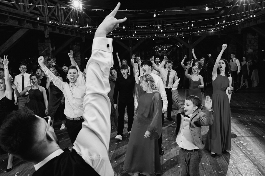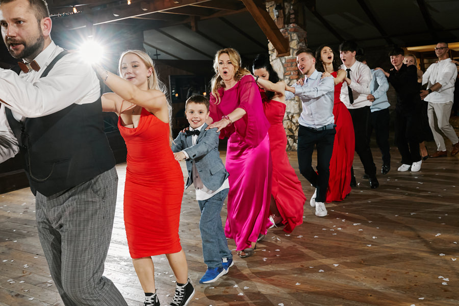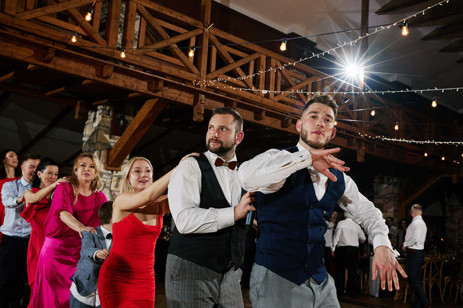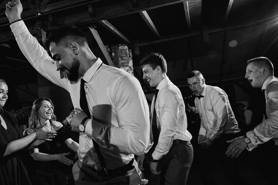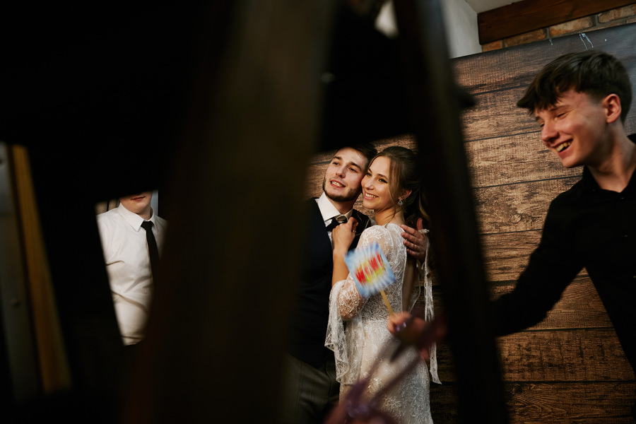 Po ceremonii udaliśmy się na wesele do Dworzyszcza. Miejsce wyglądało przepięknie. Drobne światełka rozciągnięte nad parkietem sprzyjały romantycznemu nastrojowi. A stylowe lampy w klimacie retro, dające piękne ciepłe światło, i przepiękna konsola DJa od BrosArt również idealnie wpisały się w klimat tego miejsca.