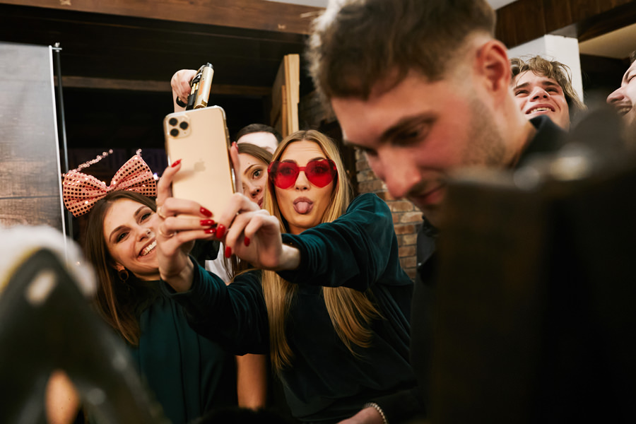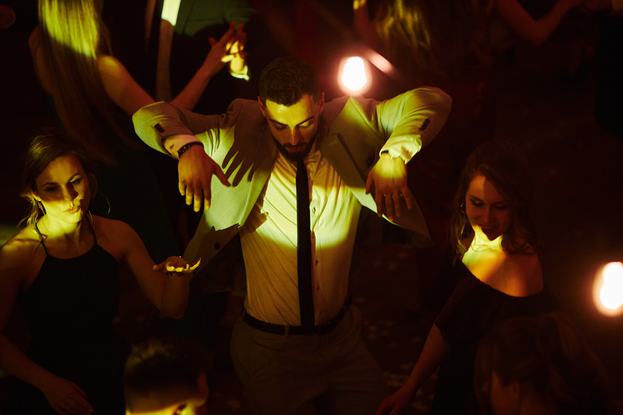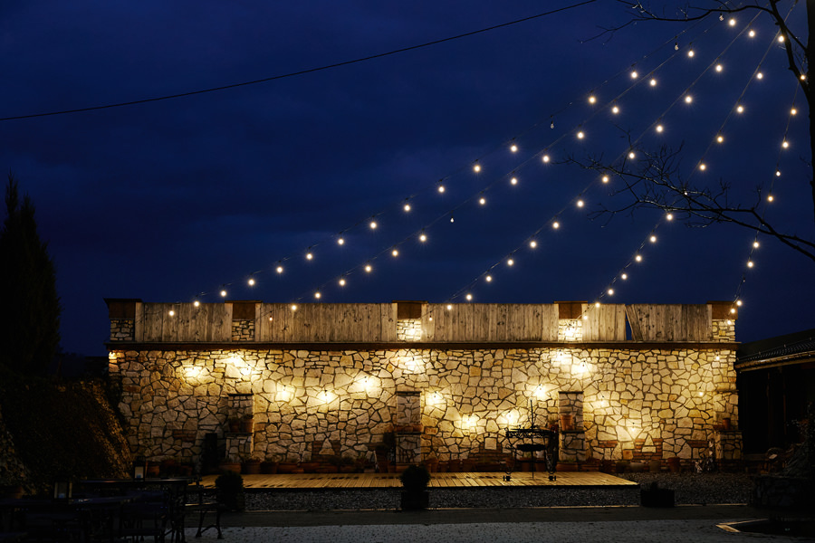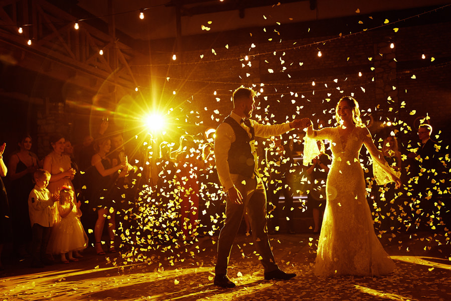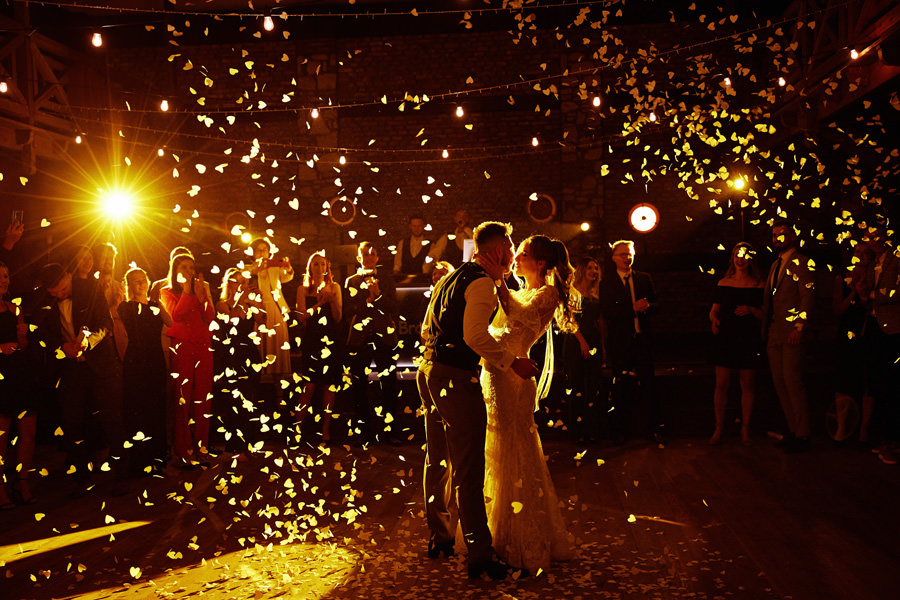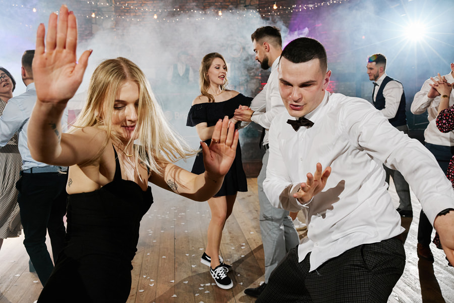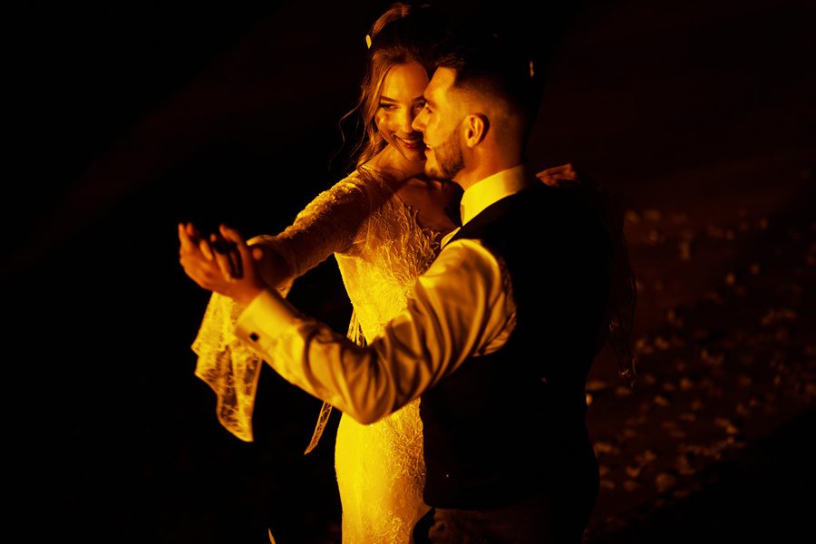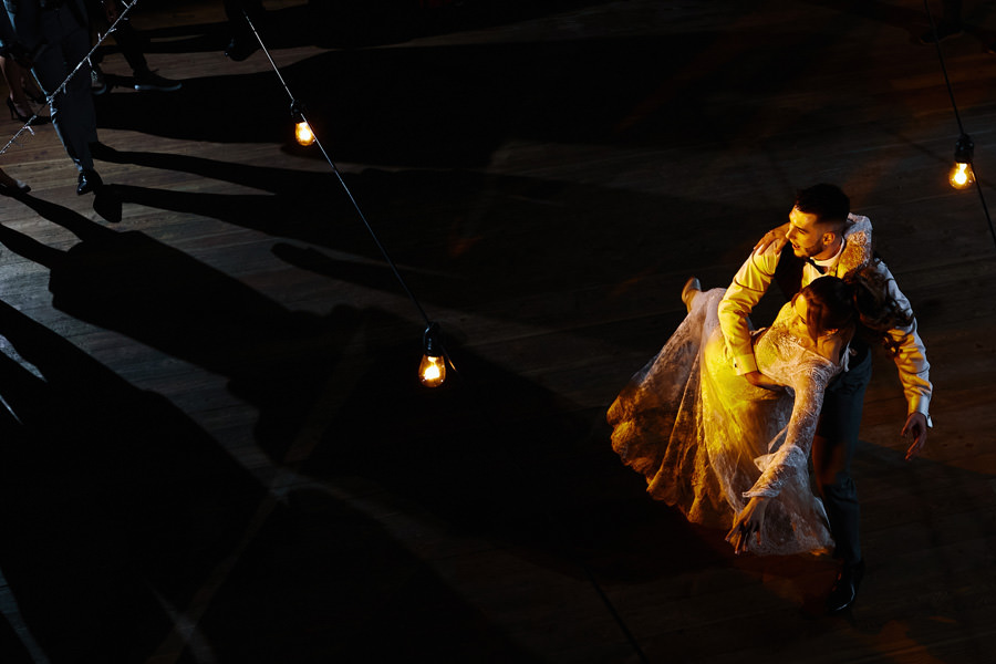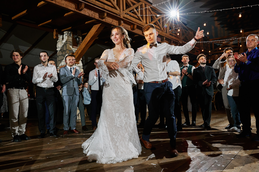 Po ceremonii udaliśmy się na wesele do Dworzyszcza. Miejsce wyglądało przepięknie. Drobne światełka rozciągnięte nad parkietem sprzyjały romantycznemu nastrojowi. A stylowe lampy w klimacie retro, dające piękne ciepłe światło, i przepiękna konsola DJa od BrosArt również idealnie wpisały się w klimat tego miejsca.