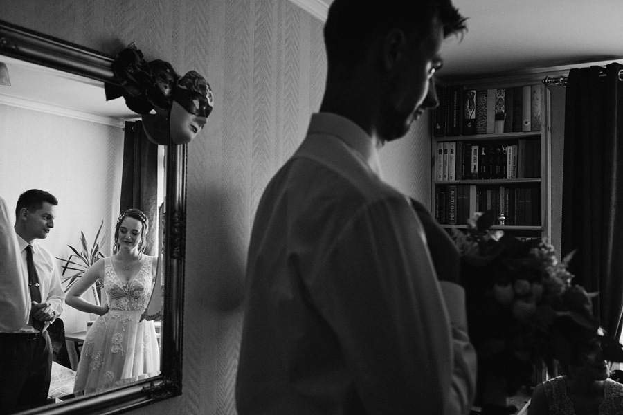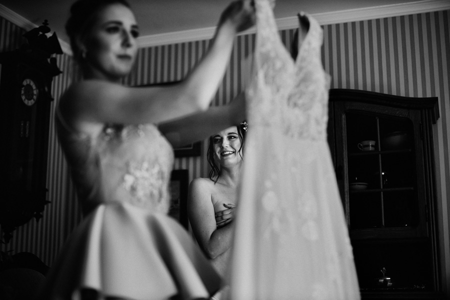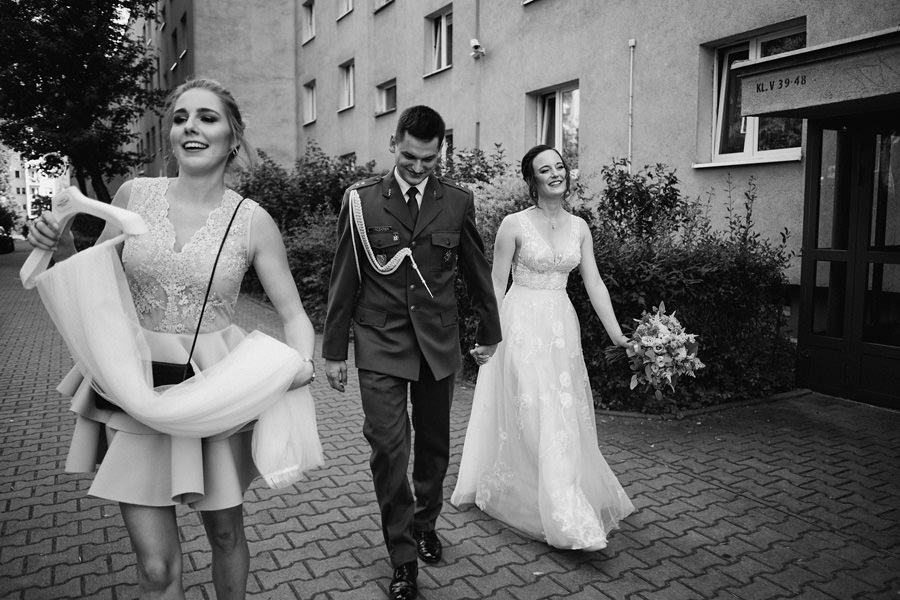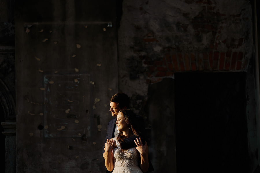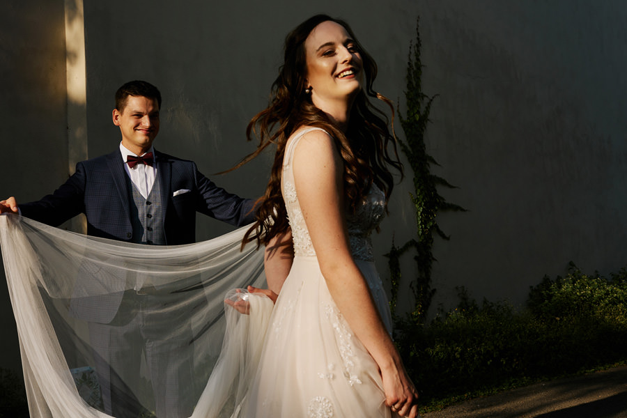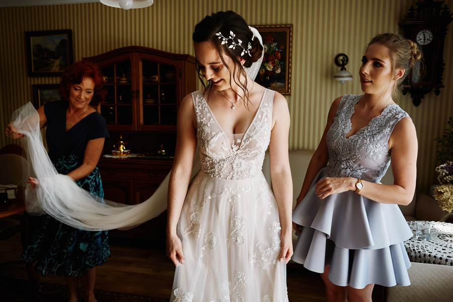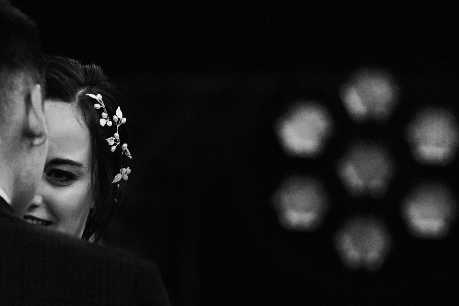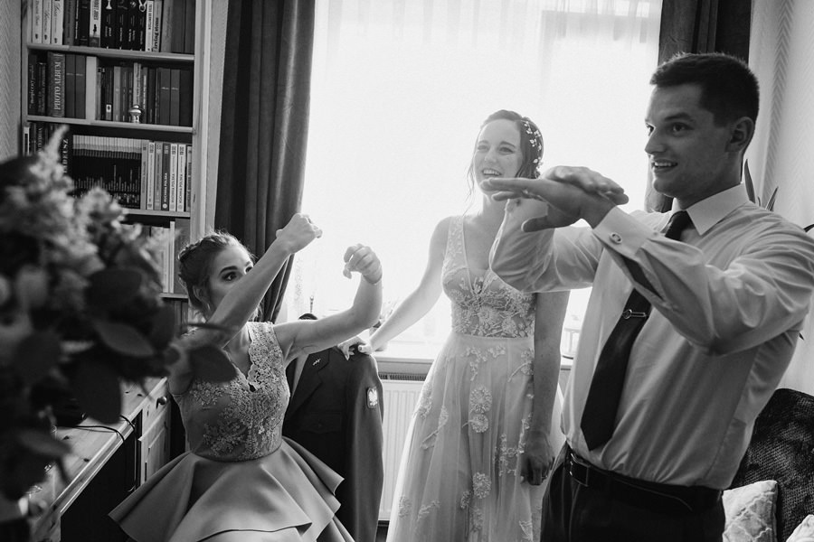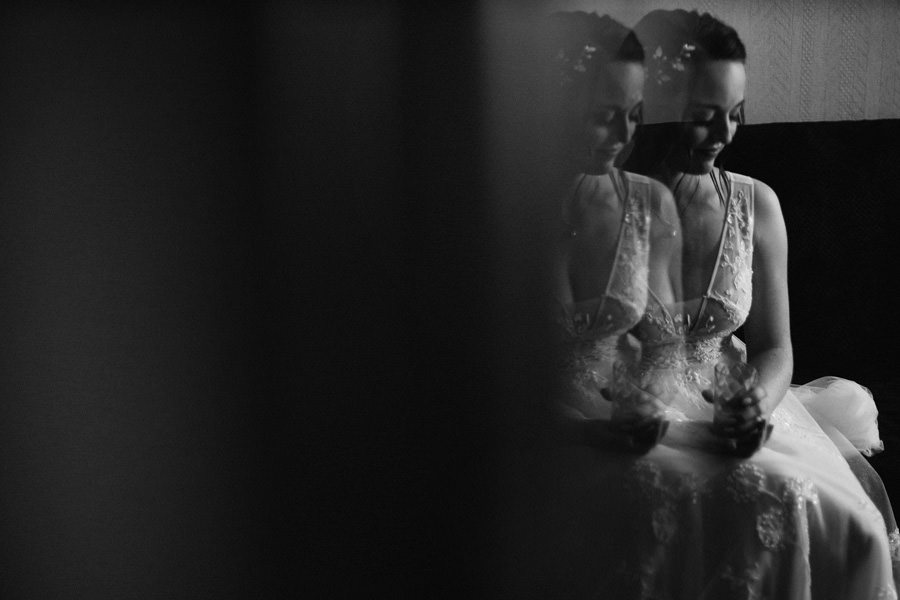 Oczywiście wszystko miało swój klasyczny porządek. Zatem najpierw przygotowania, które ciągle w parach młodych budzą pewien niepokój. Czy nie będzie zbytniego chaosu, czy nie zje ich stres, czy okażą się wystarczająco ciekawi? Z perspektywy fotografa ślubnego, którego ambicją jest reportaż ślubny, nie ma czegoś takiego jak zbyt duży chaos. W chaosie tkwi potencjał czegoś niestandardowego. Stres? To akurat wykluczone, bo w ilość ślubno-weselnych anegdot, które ma w zanadrzu każdy doświadczony fotograf, zapewne wyeliminuje wszelki stres ;). A co do ostatniego pytania – fenomen tej pracy polega na tym, że choć śluby i wesela są do siebie podobne, to jednak Wy – czyli główni bohaterowie tych wydarzeń, jesteście zupełnie inni. To jest to, co podkręca naszą kreatywność. Wasza inność, sposób bycia, temperament :).