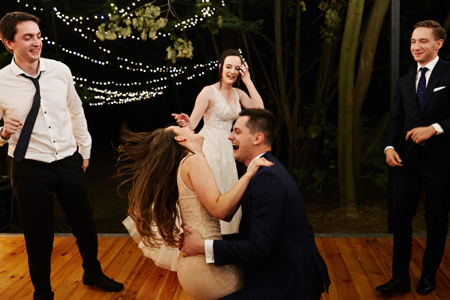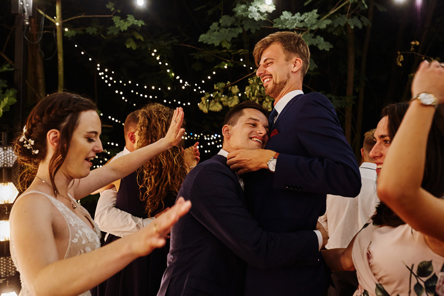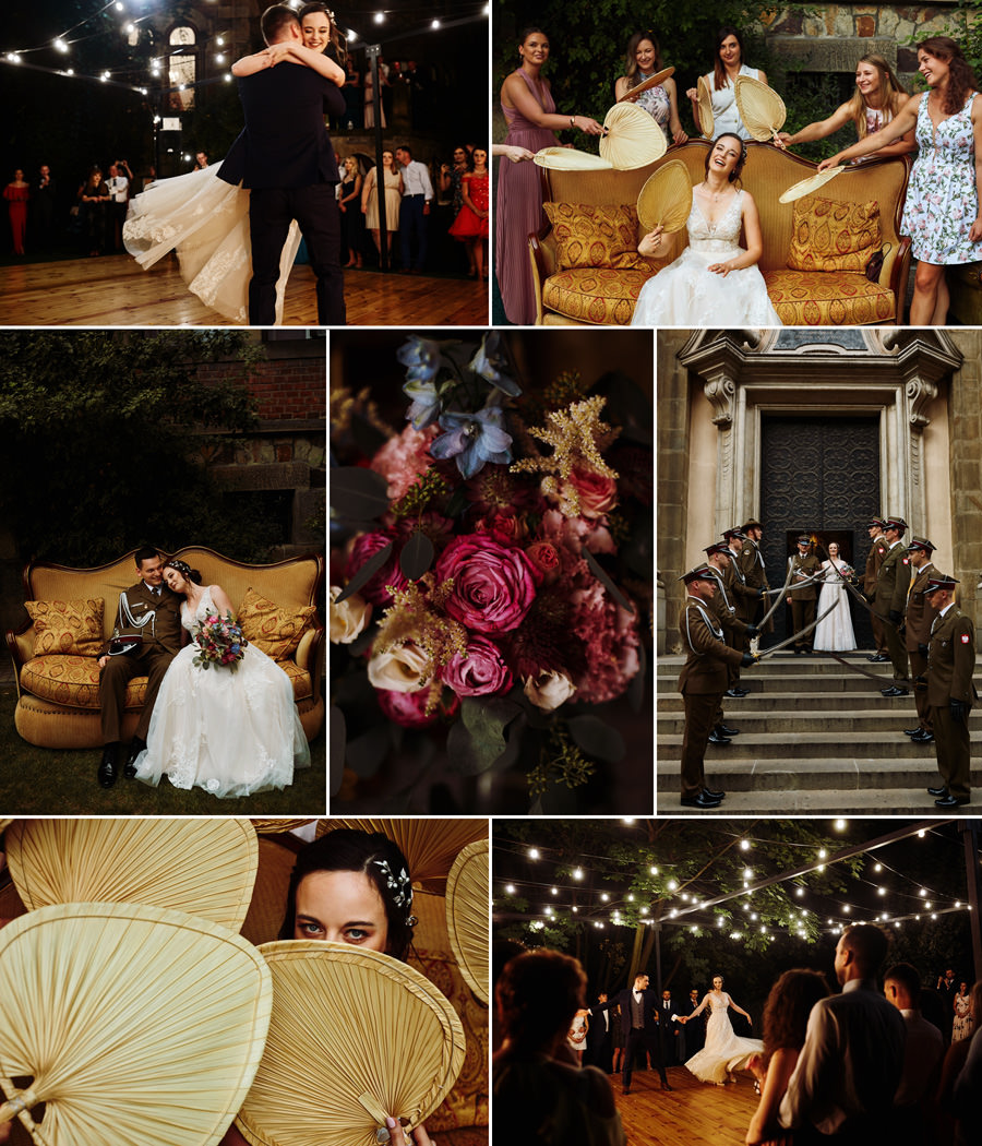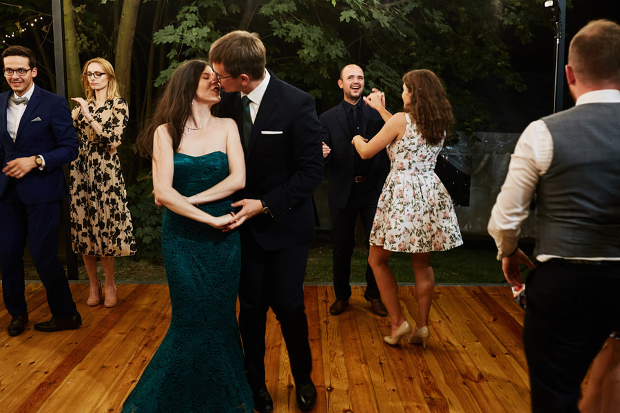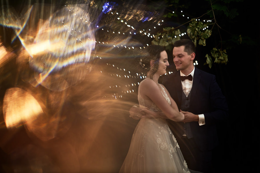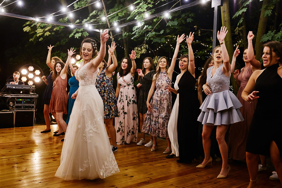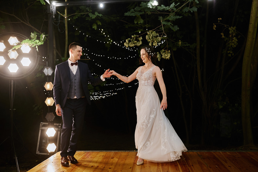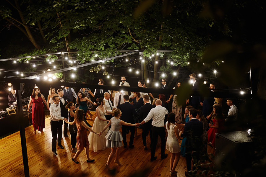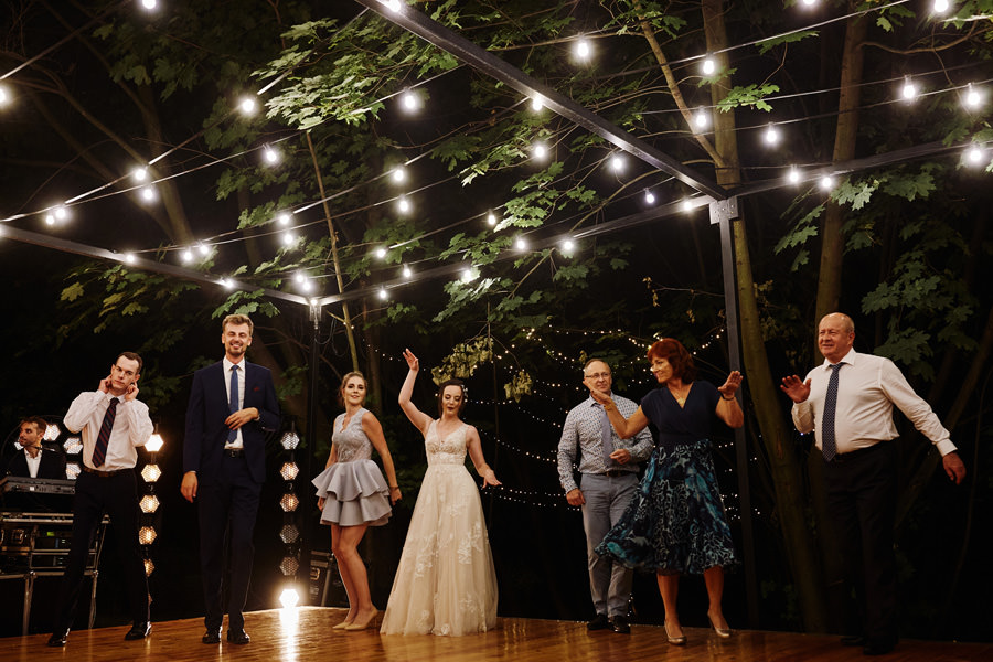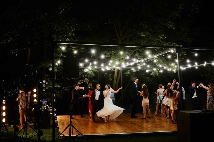 Urządzenie wesela w Pałacu Żeleńskich w Grodkowicach ma jeszcze jedną wielką zaletę. Mianowicie jest tam możliwość imprezy tanecznej na zewnątrz. Piękny, drewniany podest, oświetlony przez dużą ilość drobnych światełek. To idealna taneczna podłoga i idealny sufit, zwłaszcza jeśli dodać jeszcze gwiazdy :). No dobrze, zapytacie, ale co w przypadku deszczu? Jest to słuszna obawa, bo faktycznie, pogodę mamy kapryśną. Pałac Żeleńskich w Grodkowicach jest oczywiście na to gotowy i piękne miejsce do tańca ma również w środku. Pytanie brzmi, czy DJ lub zespół będą gotowi na ewentualną ekspresową przeprowadzkę. Wesele Karoliny i Michała było pod koniec sierpnia. W ciągu dnia temperatura osiągała jakieś milion stopni (czyli w przybliżeniu 38). Wieczorem czuć było burzę w powietrzu. Oprawą muzyczną zajmował się Kordian Baran. Był przygotowany na wszystko. Prowadzenie wesela przebiło skalę, podobnie jak oświetlenie, które zrobiło niesamowity klimat i stworzyło znakomite warunki dla zdjęć. Kordian nie bał się burzy. Miał przygotowaną playlistę na wypadek, gdyby przyszło mu ekspresowo przenosić cały sprzęt. Myślę, że nie każdy DJ byłby na to gotowy. Tymczasem mimo niepewnej aury – zarówno DJ, jak i przede wszystkim właściciele i obsługa pałacu w Grodkowicach dała parze młodej możliwość zorganizowania niezwykle klimatycznego wesela.