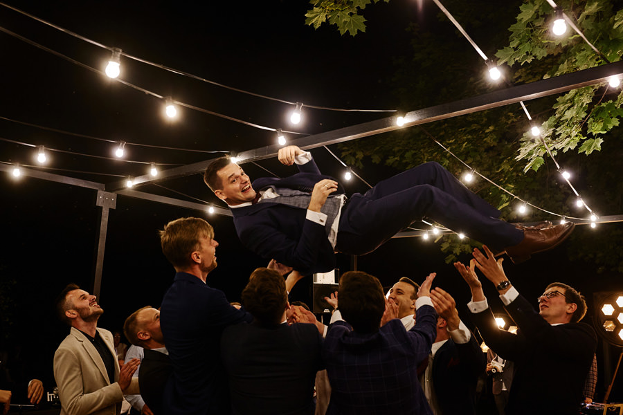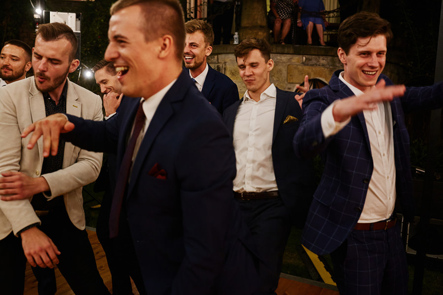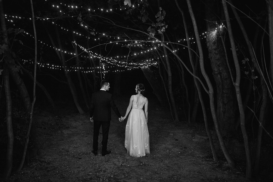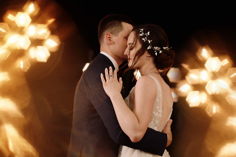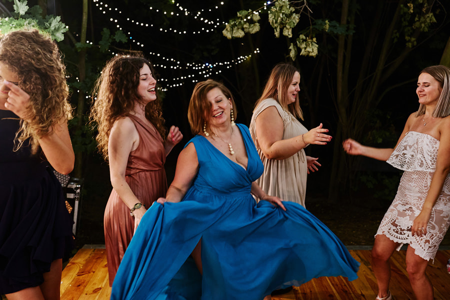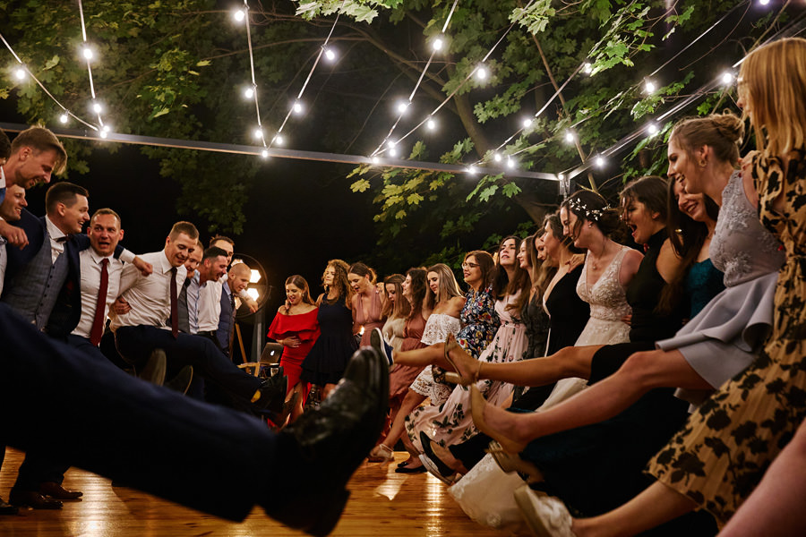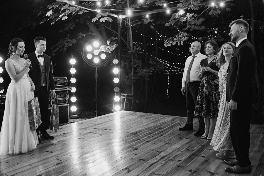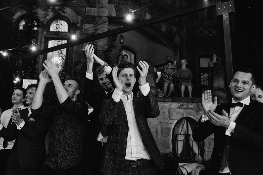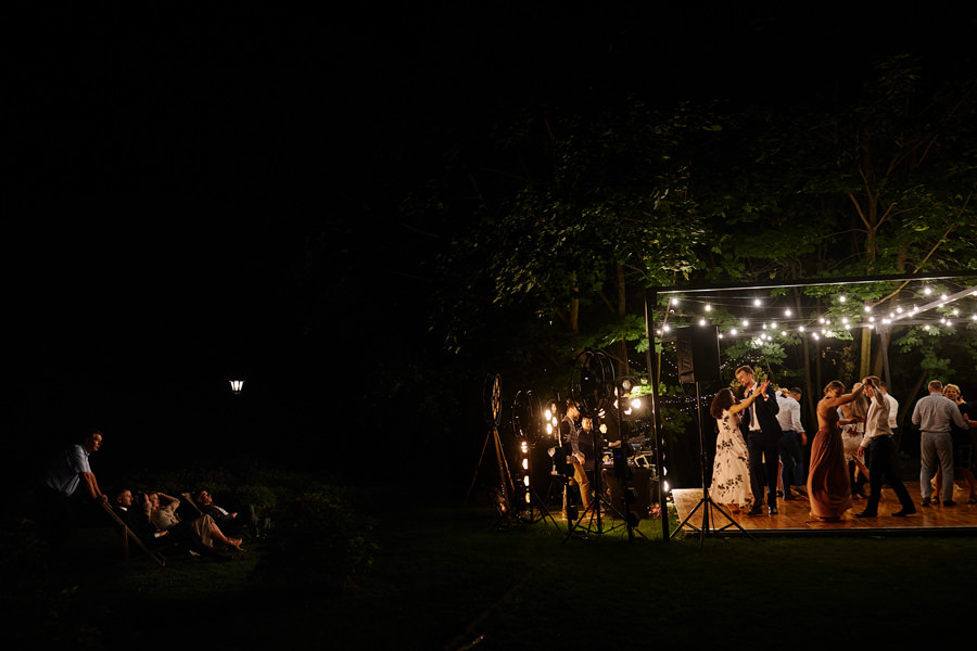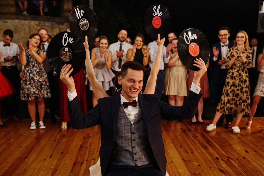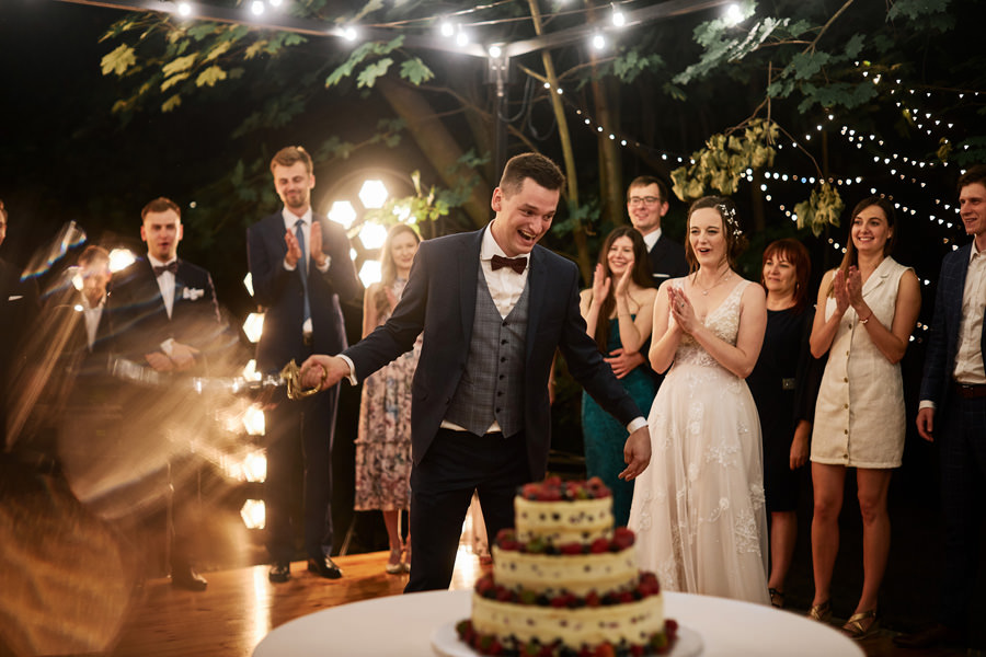 Urządzenie wesela w Pałacu Żeleńskich w Grodkowicach ma jeszcze jedną wielką zaletę. Mianowicie jest tam możliwość imprezy tanecznej na zewnątrz. Piękny, drewniany podest, oświetlony przez dużą ilość drobnych światełek. To idealna taneczna podłoga i idealny sufit, zwłaszcza jeśli dodać jeszcze gwiazdy :). No dobrze, zapytacie, ale co w przypadku deszczu? Jest to słuszna obawa, bo faktycznie, pogodę mamy kapryśną. Pałac Żeleńskich w Grodkowicach jest oczywiście na to gotowy i piękne miejsce do tańca ma również w środku. Pytanie brzmi, czy DJ lub zespół będą gotowi na ewentualną ekspresową przeprowadzkę. Wesele Karoliny i Michała było pod koniec sierpnia. W ciągu dnia temperatura osiągała jakieś milion stopni (czyli w przybliżeniu 38). Wieczorem czuć było burzę w powietrzu. Oprawą muzyczną zajmował się Kordian Baran. Był przygotowany na wszystko. Prowadzenie wesela przebiło skalę, podobnie jak oświetlenie, które zrobiło niesamowity klimat i stworzyło znakomite warunki dla zdjęć. Kordian nie bał się burzy. Miał przygotowaną playlistę na wypadek, gdyby przyszło mu ekspresowo przenosić cały sprzęt. Myślę, że nie każdy DJ byłby na to gotowy. Tymczasem mimo niepewnej aury – zarówno DJ, jak i przede wszystkim właściciele i obsługa pałacu w Grodkowicach dała parze młodej możliwość zorganizowania niezwykle klimatycznego wesela.