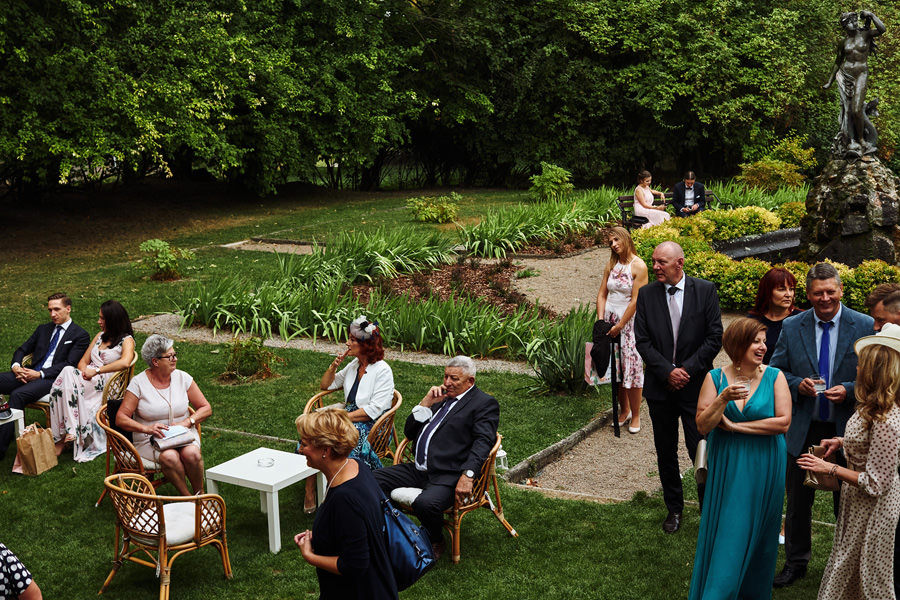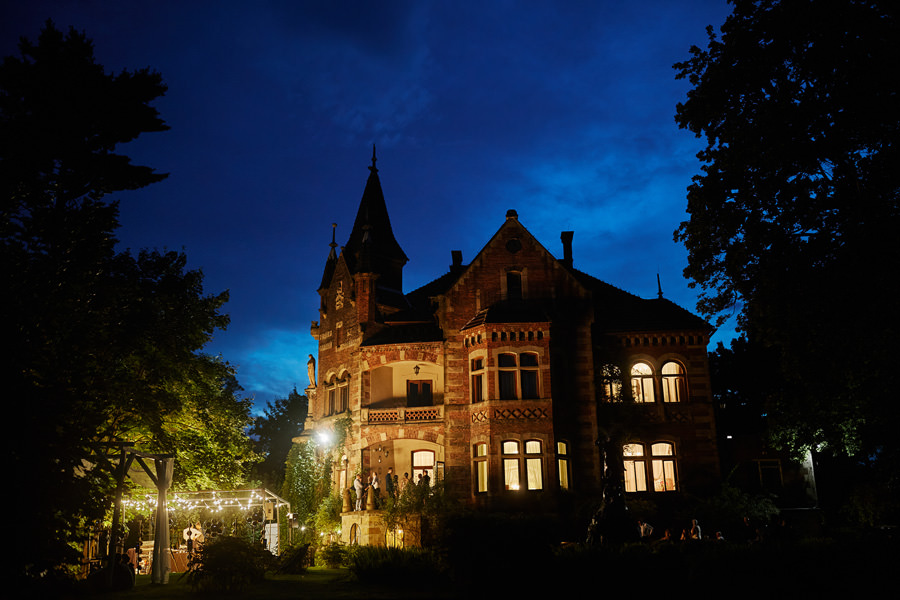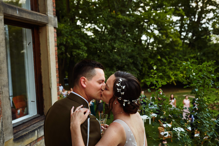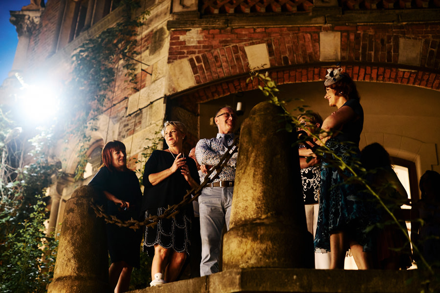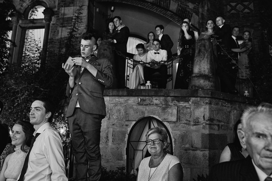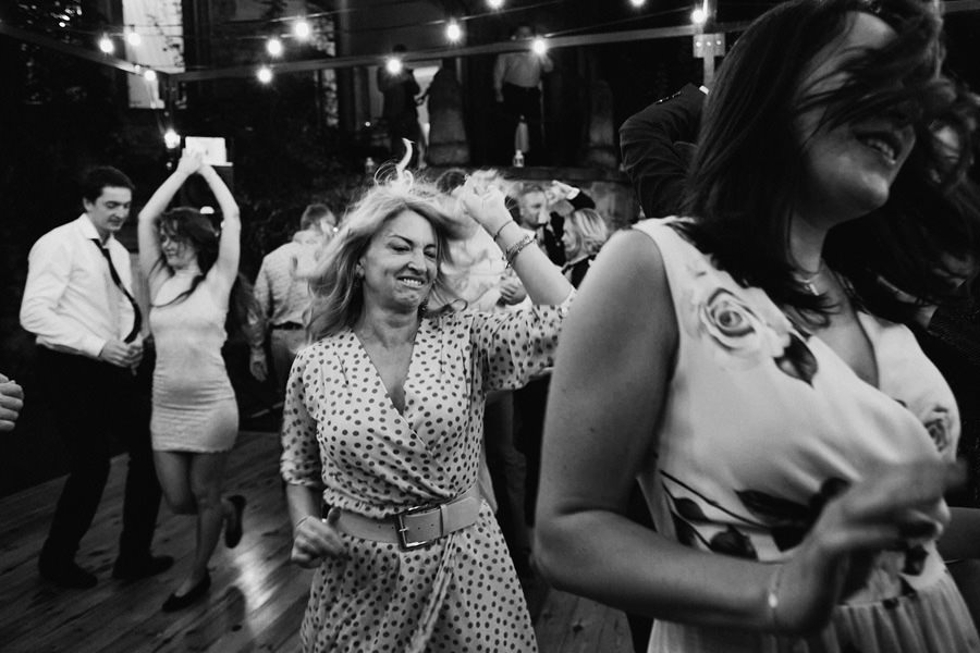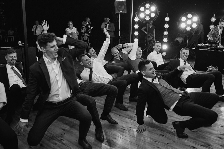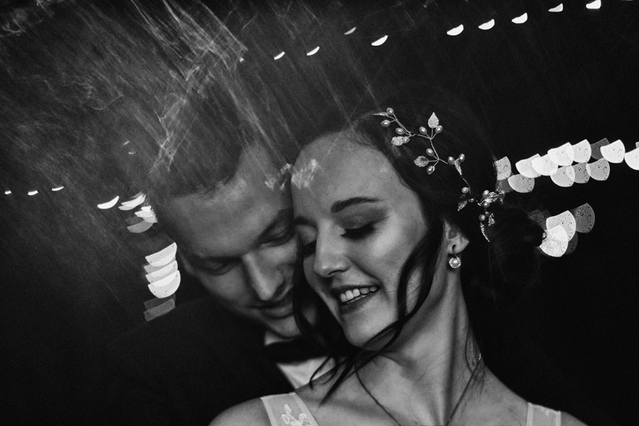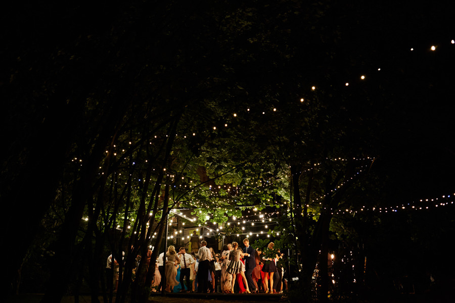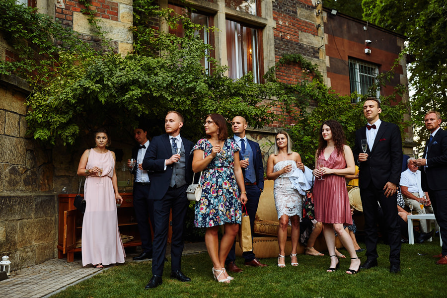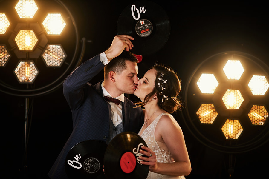 Urządzenie wesela w Pałacu Żeleńskich w Grodkowicach ma jeszcze jedną wielką zaletę. Mianowicie jest tam możliwość imprezy tanecznej na zewnątrz. Piękny, drewniany podest, oświetlony przez dużą ilość drobnych światełek. To idealna taneczna podłoga i idealny sufit, zwłaszcza jeśli dodać jeszcze gwiazdy :). No dobrze, zapytacie, ale co w przypadku deszczu? Jest to słuszna obawa, bo faktycznie, pogodę mamy kapryśną. Pałac Żeleńskich w Grodkowicach jest oczywiście na to gotowy i piękne miejsce do tańca ma również w środku. Pytanie brzmi, czy DJ lub zespół będą gotowi na ewentualną ekspresową przeprowadzkę. Wesele Karoliny i Michała było pod koniec sierpnia. W ciągu dnia temperatura osiągała jakieś milion stopni (czyli w przybliżeniu 38). Wieczorem czuć było burzę w powietrzu. Oprawą muzyczną zajmował się Kordian Baran. Był przygotowany na wszystko. Prowadzenie wesela przebiło skalę, podobnie jak oświetlenie, które zrobiło niesamowity klimat i stworzyło znakomite warunki dla zdjęć. Kordian nie bał się burzy. Miał przygotowaną playlistę na wypadek, gdyby przyszło mu ekspresowo przenosić cały sprzęt. Myślę, że nie każdy DJ byłby na to gotowy. Tymczasem mimo niepewnej aury – zarówno DJ, jak i przede wszystkim właściciele i obsługa pałacu w Grodkowicach dała parze młodej możliwość zorganizowania niezwykle klimatycznego wesela.