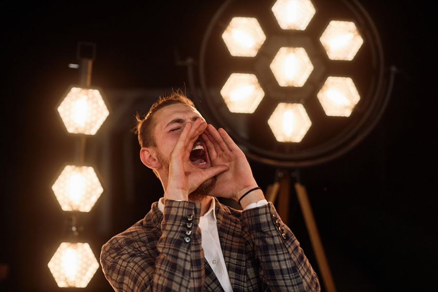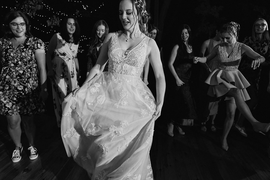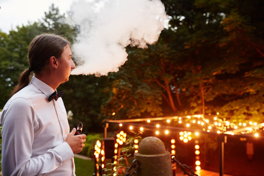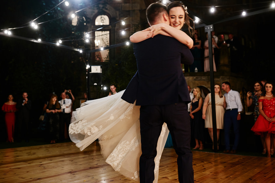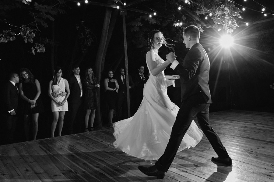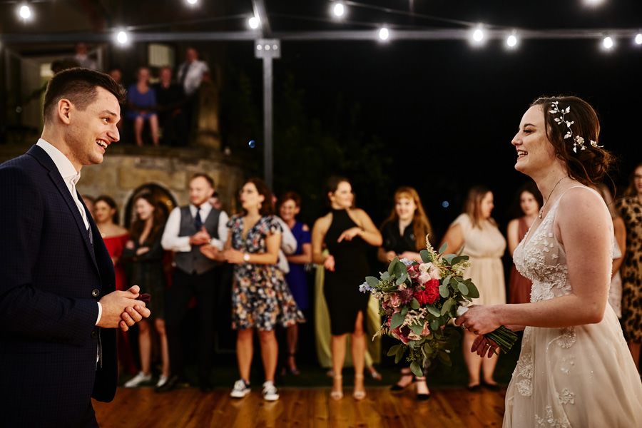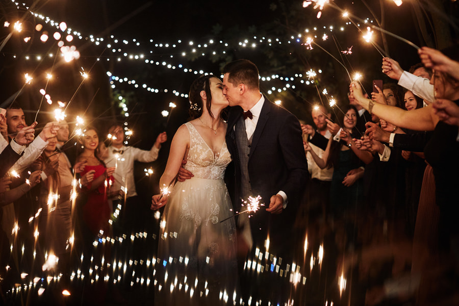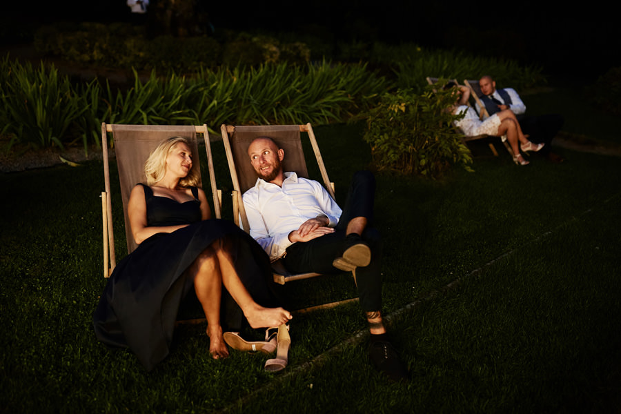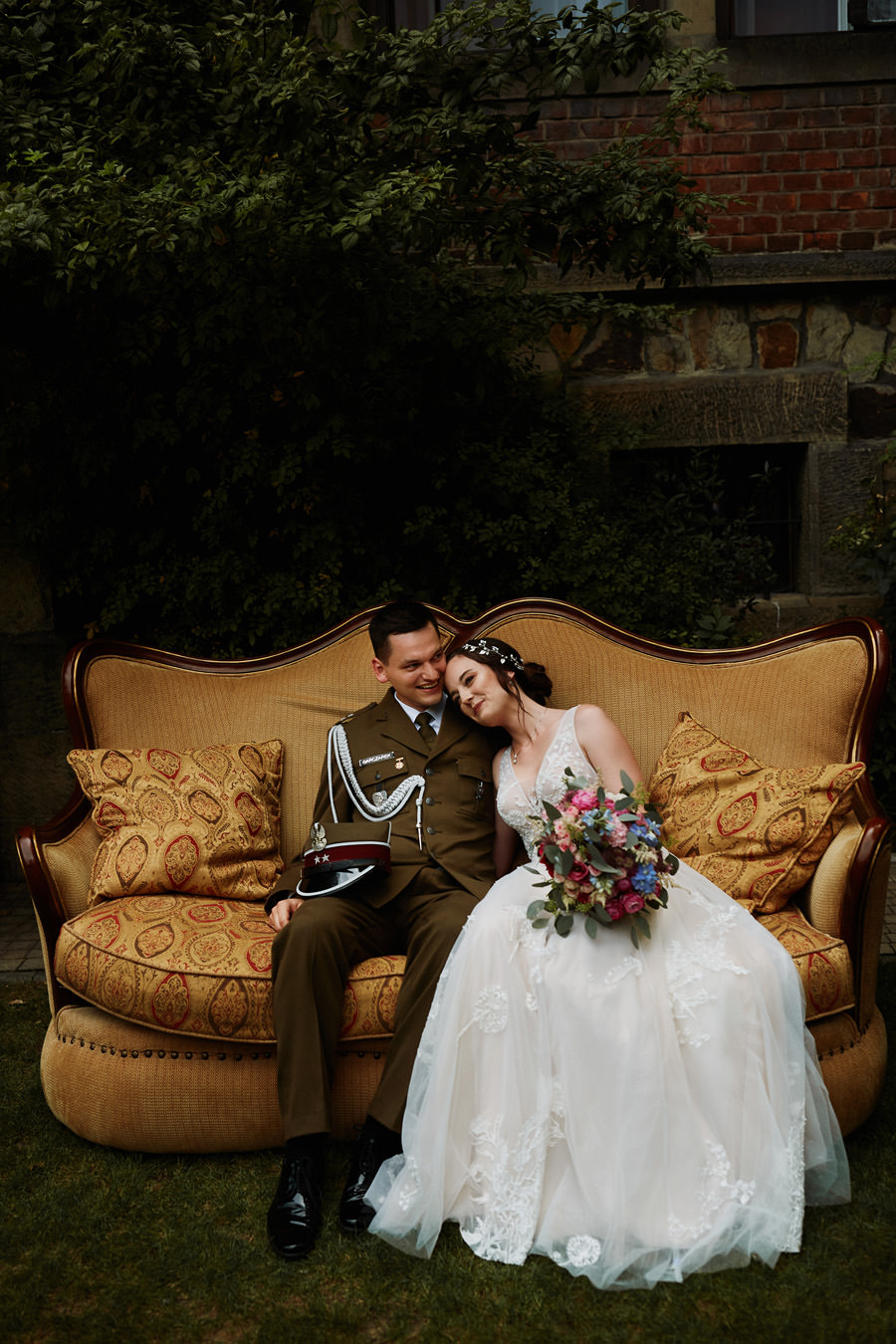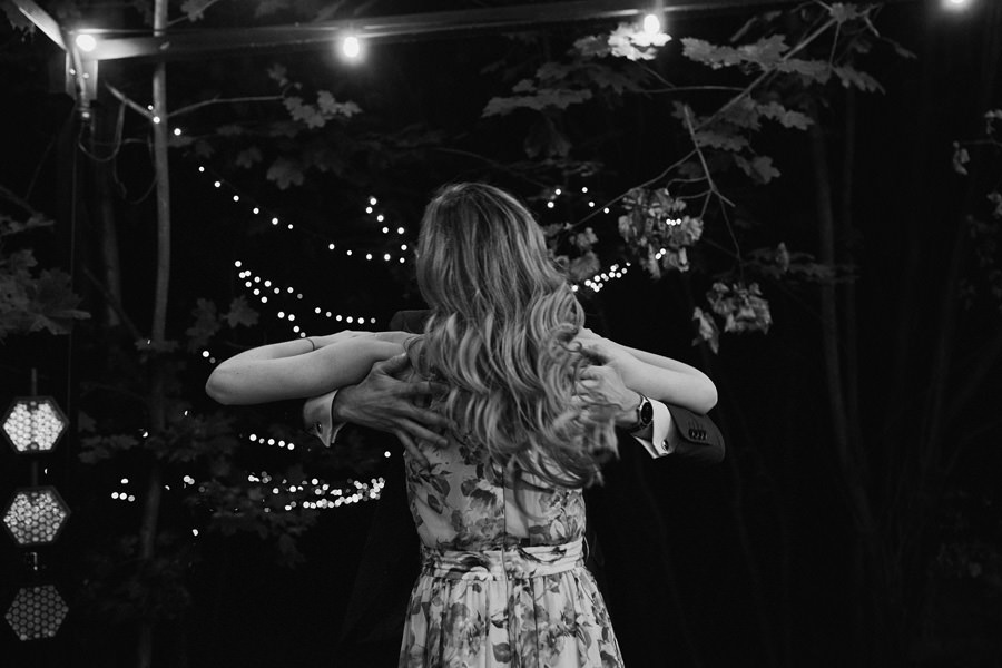 Urządzenie wesela w Pałacu Żeleńskich w Grodkowicach ma jeszcze jedną wielką zaletę. Mianowicie jest tam możliwość imprezy tanecznej na zewnątrz. Piękny, drewniany podest, oświetlony przez dużą ilość drobnych światełek. To idealna taneczna podłoga i idealny sufit, zwłaszcza jeśli dodać jeszcze gwiazdy :). No dobrze, zapytacie, ale co w przypadku deszczu? Jest to słuszna obawa, bo faktycznie, pogodę mamy kapryśną. Pałac Żeleńskich w Grodkowicach jest oczywiście na to gotowy i piękne miejsce do tańca ma również w środku. Pytanie brzmi, czy DJ lub zespół będą gotowi na ewentualną ekspresową przeprowadzkę. Wesele Karoliny i Michała było pod koniec sierpnia. W ciągu dnia temperatura osiągała jakieś milion stopni (czyli w przybliżeniu 38). Wieczorem czuć było burzę w powietrzu. Oprawą muzyczną zajmował się Kordian Baran. Był przygotowany na wszystko. Prowadzenie wesela przebiło skalę, podobnie jak oświetlenie, które zrobiło niesamowity klimat i stworzyło znakomite warunki dla zdjęć. Kordian nie bał się burzy. Miał przygotowaną playlistę na wypadek, gdyby przyszło mu ekspresowo przenosić cały sprzęt. Myślę, że nie każdy DJ byłby na to gotowy. Tymczasem mimo niepewnej aury – zarówno DJ, jak i przede wszystkim właściciele i obsługa pałacu w Grodkowicach dała parze młodej możliwość zorganizowania niezwykle klimatycznego wesela.