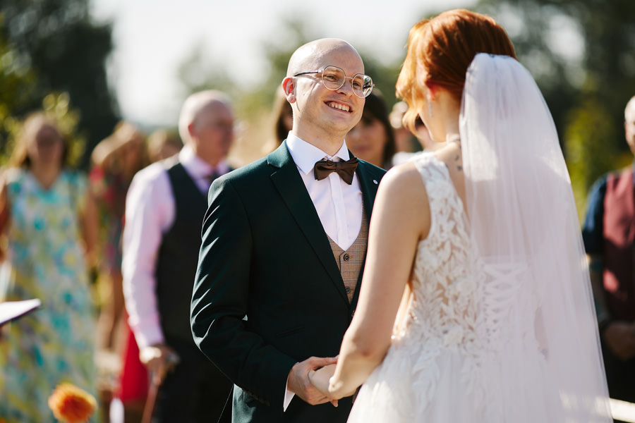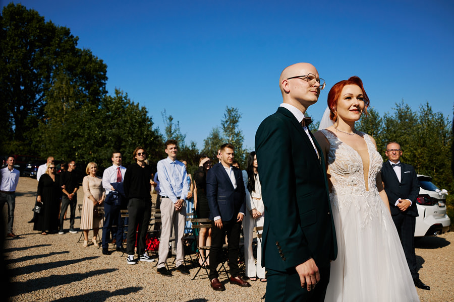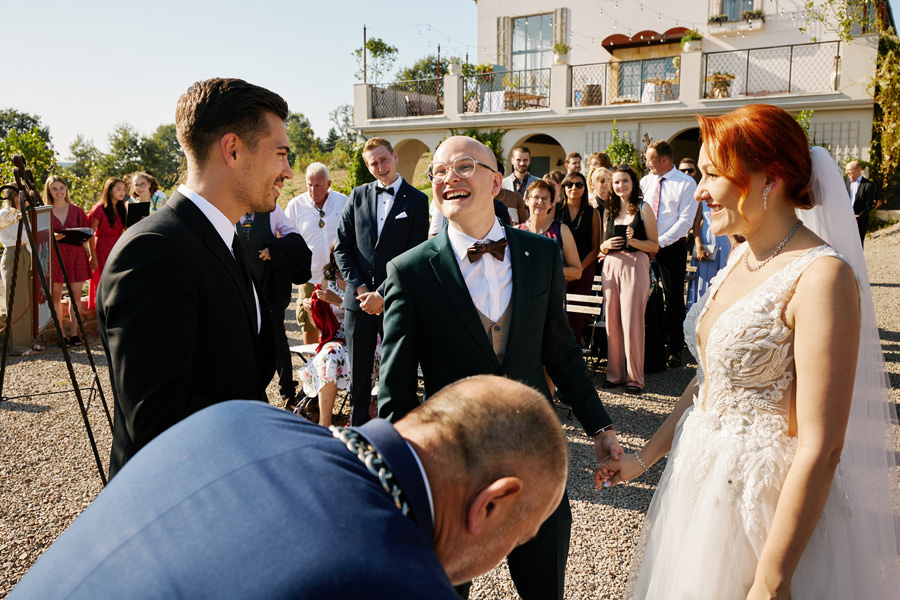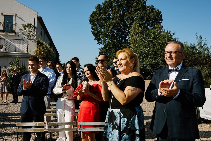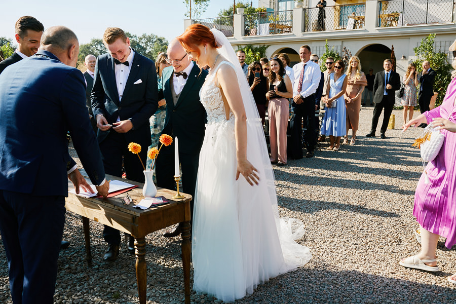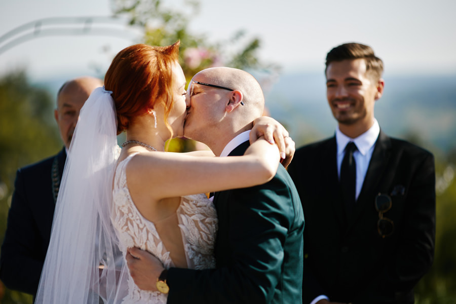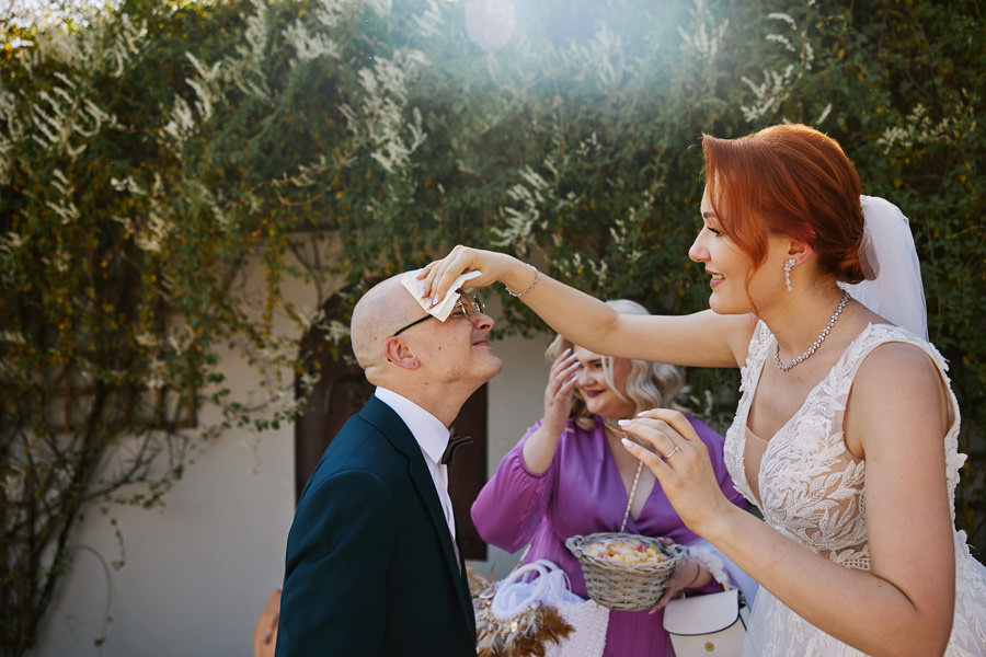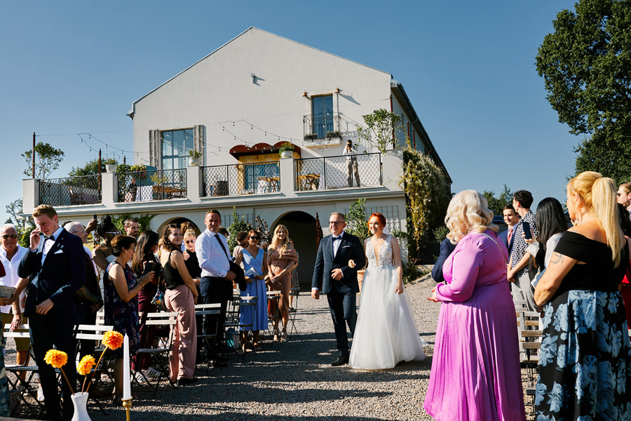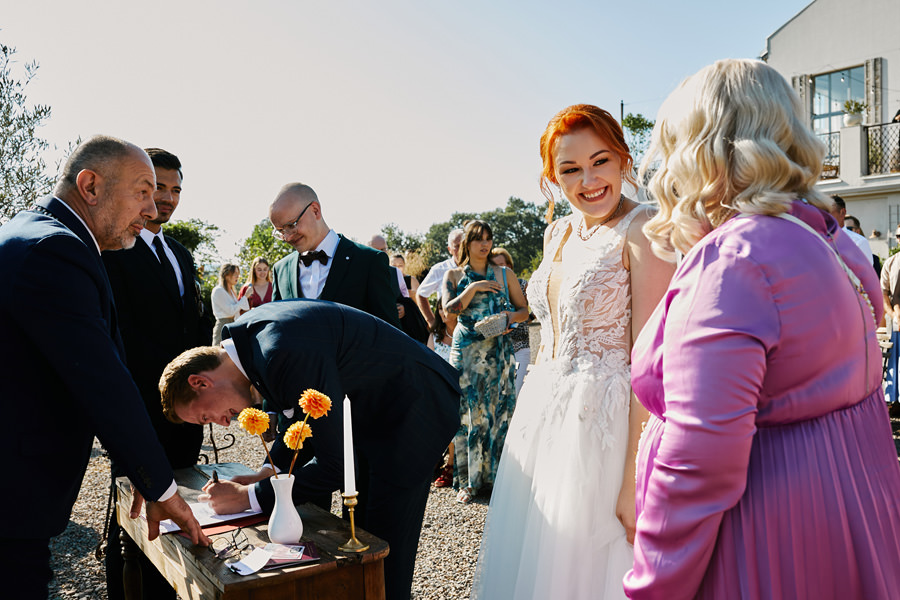 Wizualnie – Villa Love jest z pewnością bardzo blisko toskańskiego klimatu. Kamień, drewno, błękit, wielkie donice z roślinnością o charakterze śródziemnomorskim, do tego żywe kwiaty, bawełniane obrusy, złote sztućce, ogromne okna. To wszystko sprawia, że poczujemy się jak we Włoszech. I jedyny aspekt, którego nie sposób przewidzieć w naszym cudnym kraju, to pogoda. Jak dotąd – mieliśmy sporo szczęścia i w kwestii pogody w Villi Love dominowała raczej „włoskość”, niż „polskość”. Ola i Bas, których mieliśmy okazję fotografować w tym miejscu, zdecydowali, że odbędzie się tutaj też ich ślub. Ślub był cywilny, oczywiście w plenerze. Był to weekend wrześniowy, ale zdecydowanie nas nie oszczędził, jeśli chodzi o temperaturę. Nie wiem, ile mogło być stopni, ale w moim odczuciu grubo ponad 100 :D. Światło – ostre, bardzo kontrastowe, ogólnie rzecz biorąc – niełatwe. W takich sytuacjach zdecydowanie przydaje się wieloletnie doświadczenie w fotografowaniu – niemalże w każdych warunkach. Oraz fakt, że lubimy wyzwania. Zapraszamy Was zatem na ten piękny ślub i wesele w Villi Love, gdzie jest nie tylko pięknie, ale również gościnnie i przepysznie!