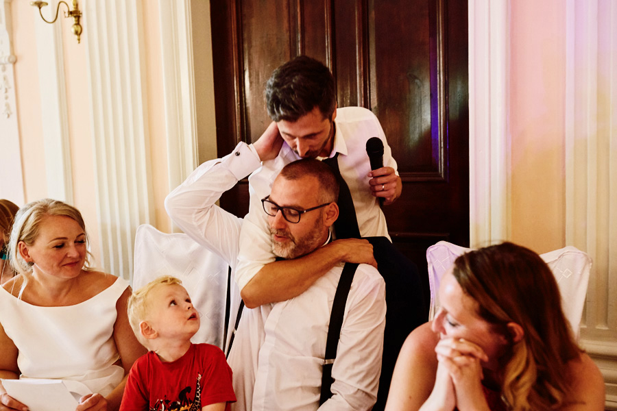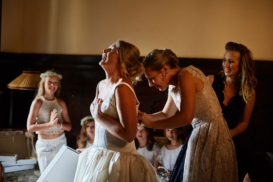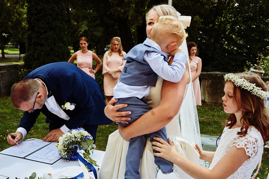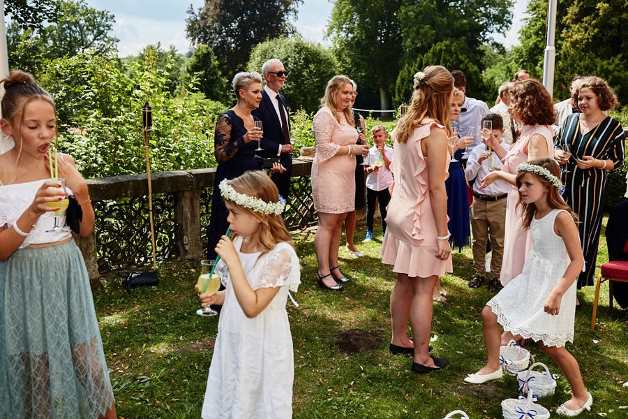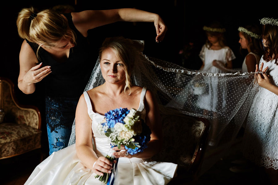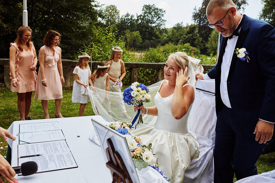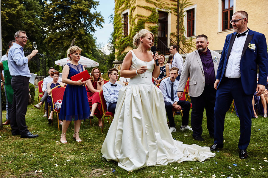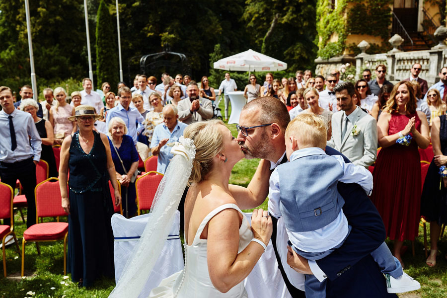 Ale nie możemy oczywiście zapominać o głównym wątku! A ten główny wątek to niezwykła para. Wieloletni związek, dwójka wspaniałych dzieciaków. Na swój ślub wybrali zamek w Kliczkowie – sam zachód Polski, żeby zarówno polscy, jak i holenderscy goście mieli przynajmniej trochę zbliżoną odległość do przebycia. Zamkowe wnętrza na przygotowania ślubne – absolutna bajka. Po pierwsze wielkie i przestronne komnaty, a po drugie absolutnie zjawiskowe światło. Nieco trudniej było ze światłem na plenerowej ceremonii, która odbywała się w środku dnia, w środku lata przy jakimś milionie stopni. Naszym wesołym gościom jednak absolutnie nijak nie przeszkadzało to w pięknym i emocjonalnym przeżywaniu ceremonii 🙂