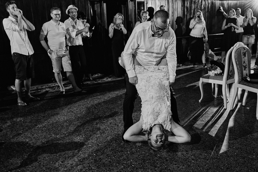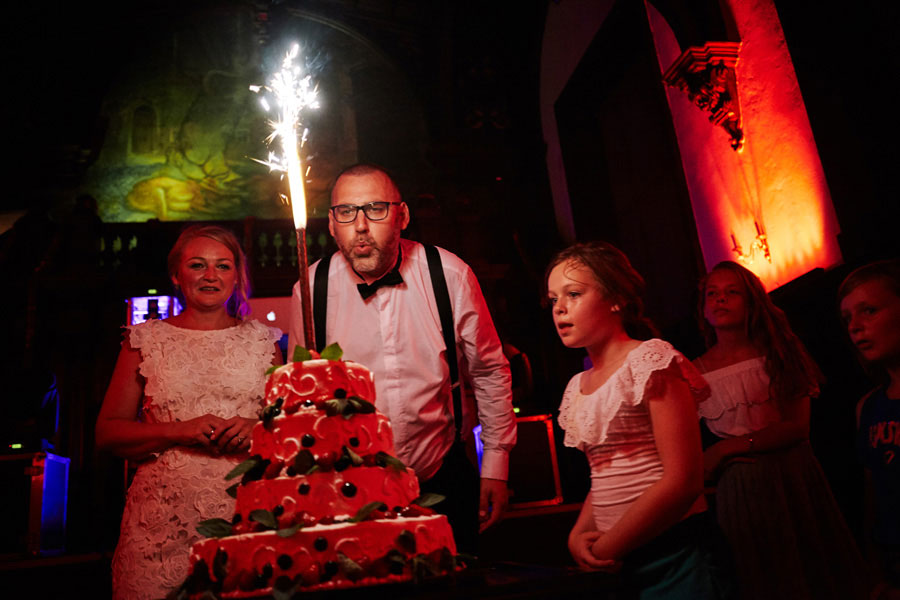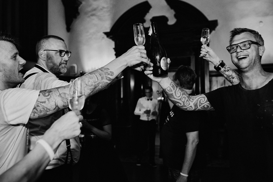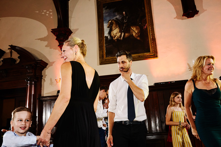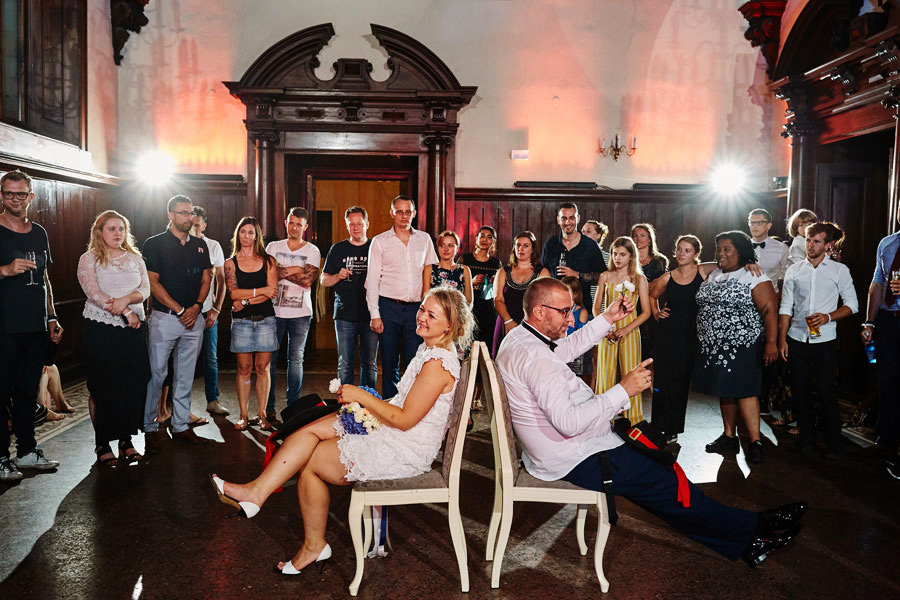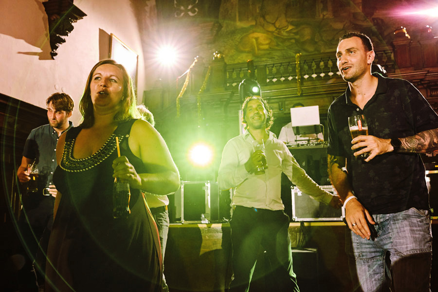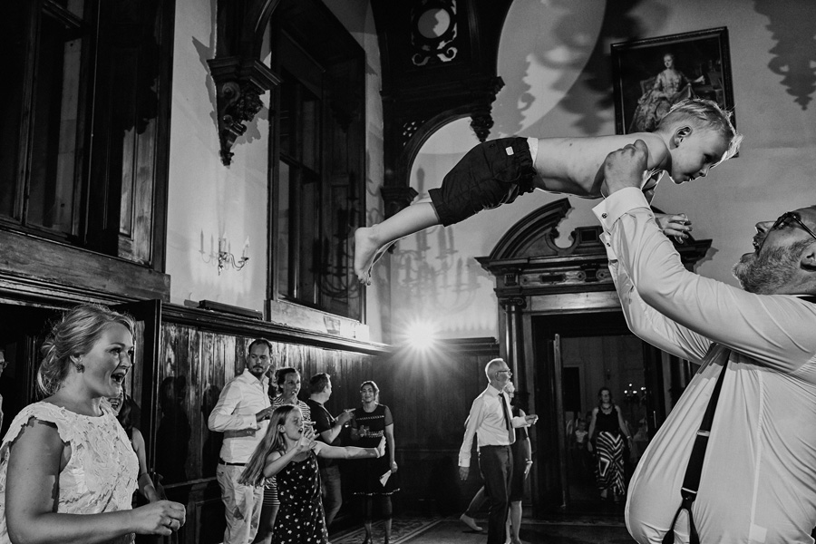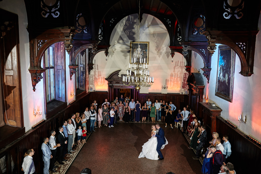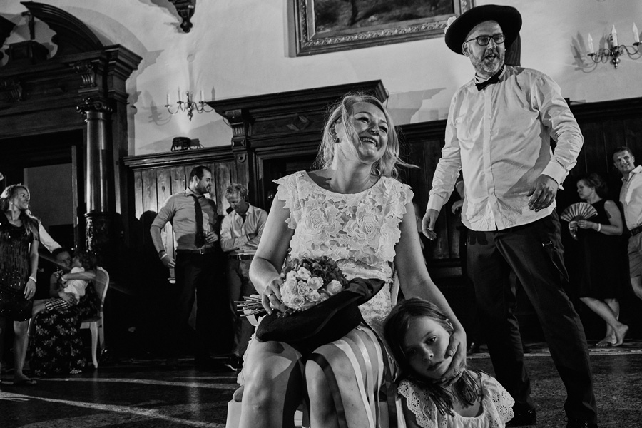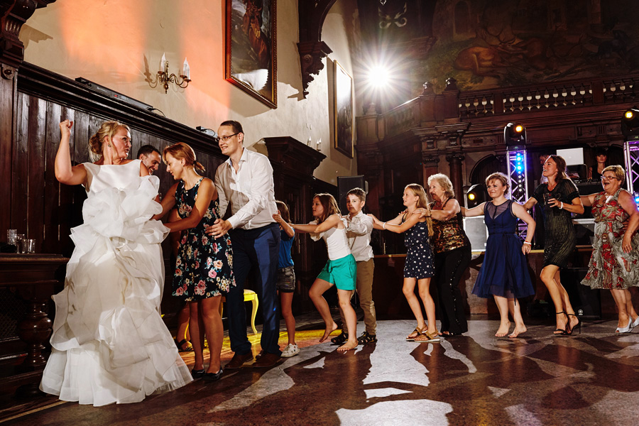 Kochamy nad życie miejsca z historią, jak Pałac Goetzów, Dwór Sieraków czy Zamek Korzkiew. Bo są piękne i mają duszę. I jedną maleńką wadę. Duszno! :D. Dusza jest, ale duszno też ;). Zamek posiada ogromne sale i w normalnych okolicznościach jest tam raczej chłodno. Ale przy milionie stopni na zewnątrz i sporej, rozentuzjazmowanej, międzynarodowej ekipie wewnątrz – na sali balowej zrobiło się naprawdę gorąco. Klimatyzacji brak, bo budynek zabytkowy, wiadomo. Ale upał nie mógł pokonać naszej pary i ich gości. Pokazali po prostu, ze są gorętsi. Pozdejmowali buty, zmienili balowe kreacje na t-shirty, panna młoda wskoczyła w krótką sukienkę. Priorytetem była tego dnia po prostu dobra zabawa. Dobra zabawa, czyli tańce. Ale nie tylko. Przestronność sali balowej daje więcej możliwości, może być np. halą do piłki nożnej, może służyć uprawianiu gimnastyki. Ale tego już nie da się za bardzo opisać, zdecydowanie lepiej zobaczyć.