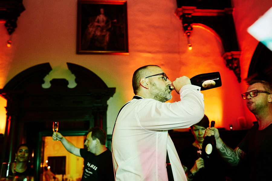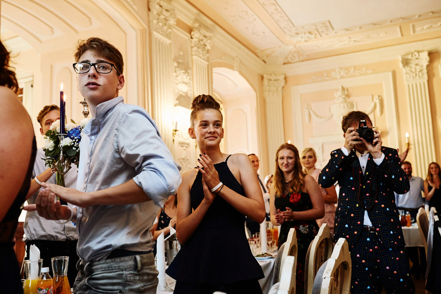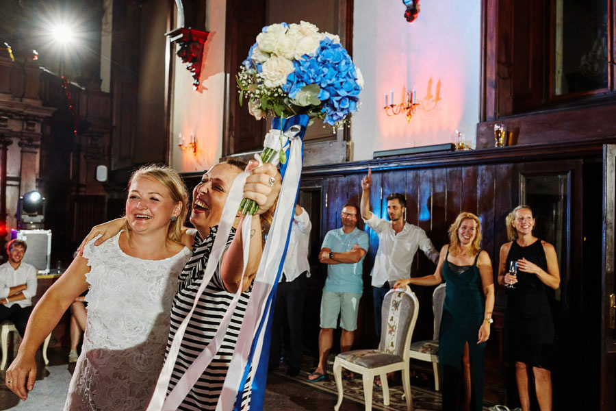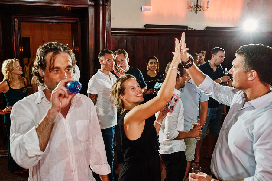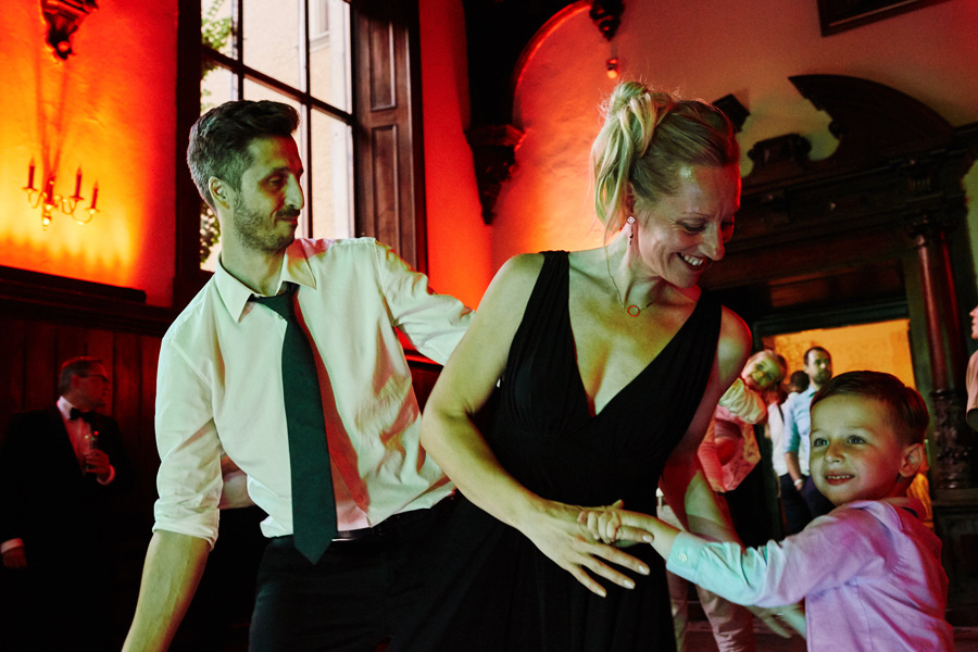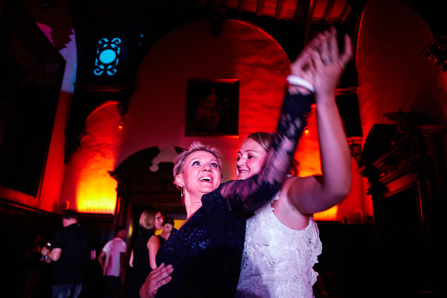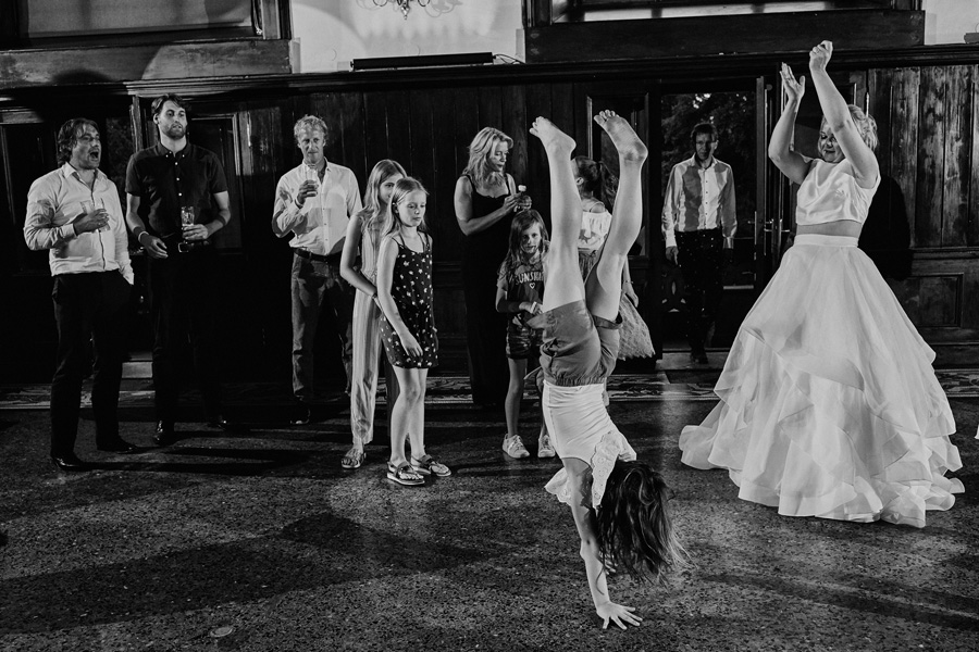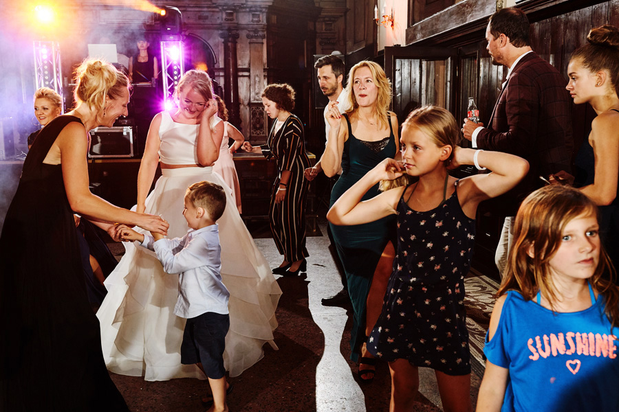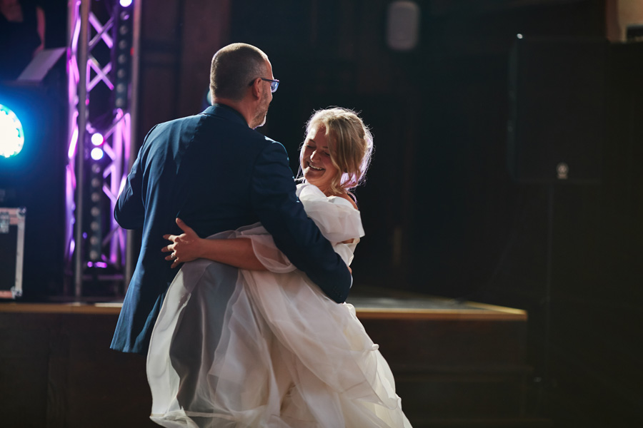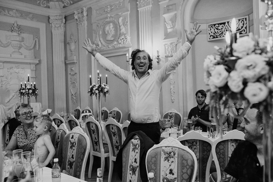 Kochamy nad życie miejsca z historią, jak Pałac Goetzów, Dwór Sieraków czy Zamek Korzkiew. Bo są piękne i mają duszę. I jedną maleńką wadę. Duszno! :D. Dusza jest, ale duszno też ;). Zamek posiada ogromne sale i w normalnych okolicznościach jest tam raczej chłodno. Ale przy milionie stopni na zewnątrz i sporej, rozentuzjazmowanej, międzynarodowej ekipie wewnątrz – na sali balowej zrobiło się naprawdę gorąco. Klimatyzacji brak, bo budynek zabytkowy, wiadomo. Ale upał nie mógł pokonać naszej pary i ich gości. Pokazali po prostu, ze są gorętsi. Pozdejmowali buty, zmienili balowe kreacje na t-shirty, panna młoda wskoczyła w krótką sukienkę. Priorytetem była tego dnia po prostu dobra zabawa. Dobra zabawa, czyli tańce. Ale nie tylko. Przestronność sali balowej daje więcej możliwości, może być np. halą do piłki nożnej, może służyć uprawianiu gimnastyki. Ale tego już nie da się za bardzo opisać, zdecydowanie lepiej zobaczyć.